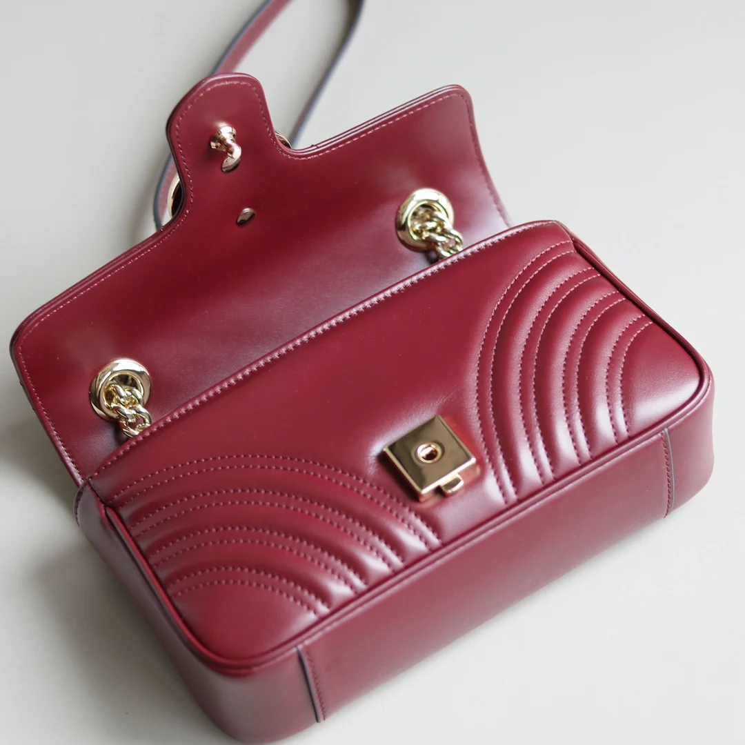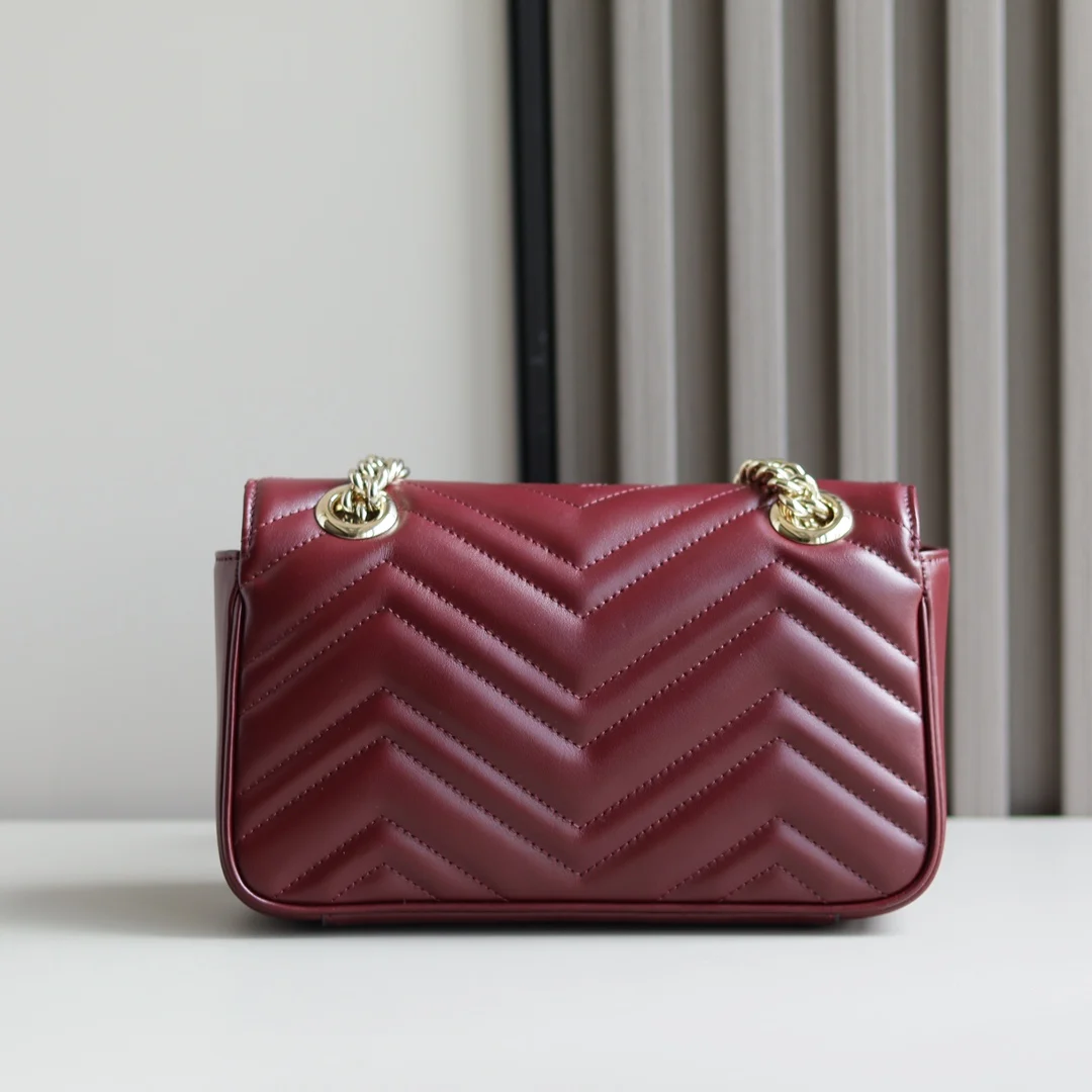 The new Ancora Marmont exudes luxurious elegance, like a fine wine, with an irresistible noble quality. Embellished with the golden Double G logo, it showcases a full sense of luxury. How can the new color scheme be so beautiful? It s simply captivating. Model: 446744. Size: 23 14 6.