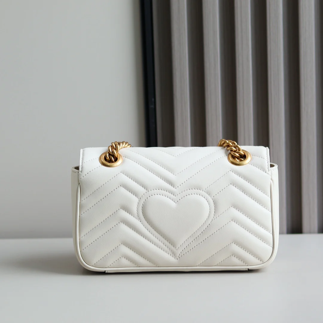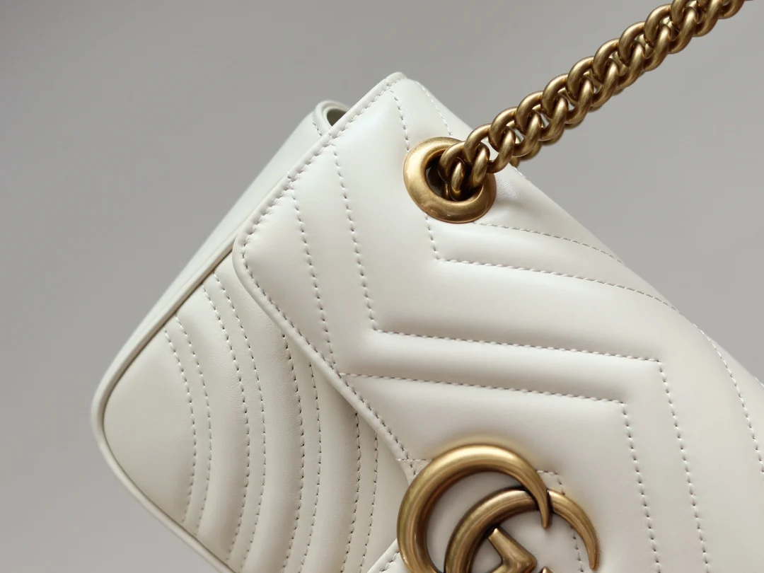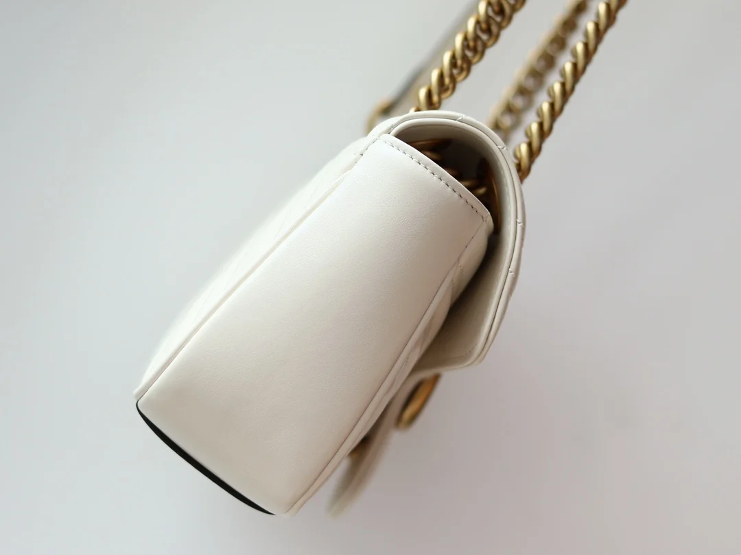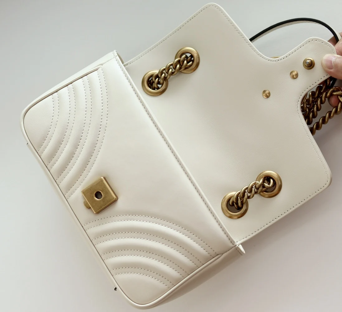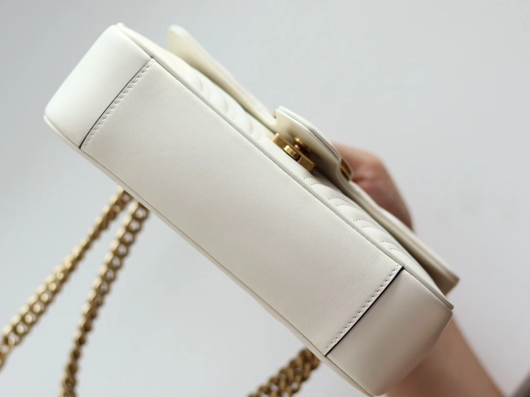 (Original Leather) Newly upgraded GG Marmont wave pattern chain bag, imported calfskin with an extremely soft feel, imported high-end scarlet antique bronze hardware. Textured and substantial. Style number: 446744 off-white, size: 23 14 6 original quality, completely authentic.