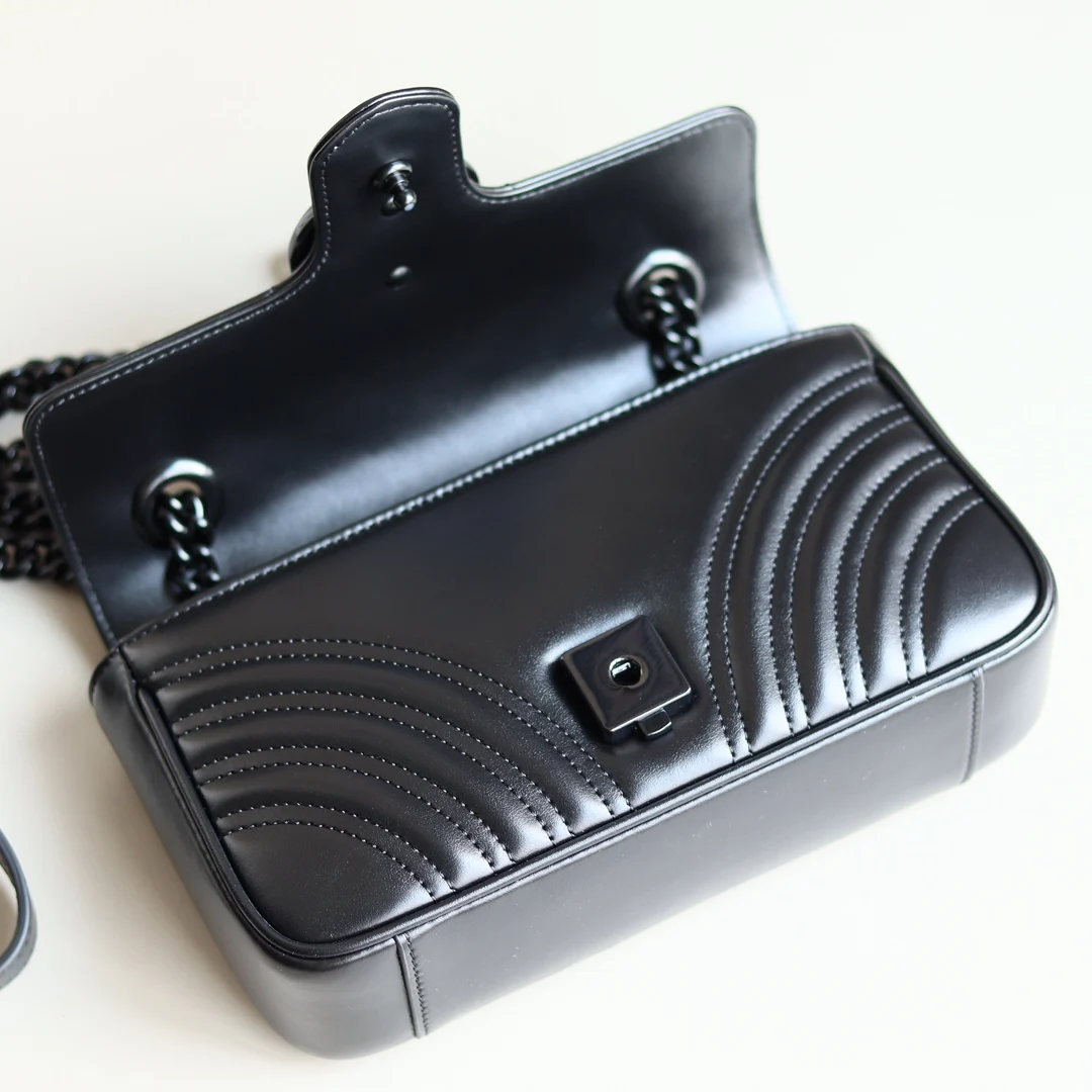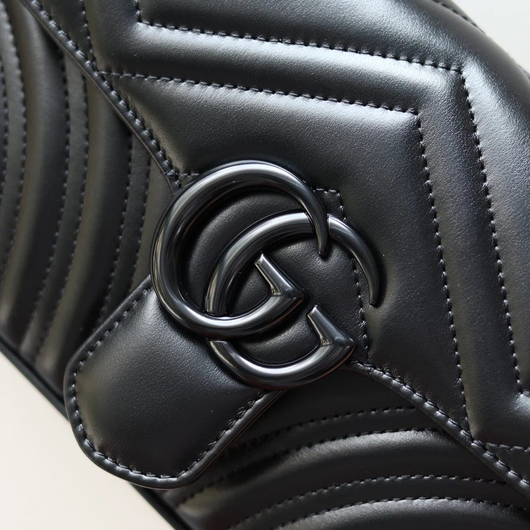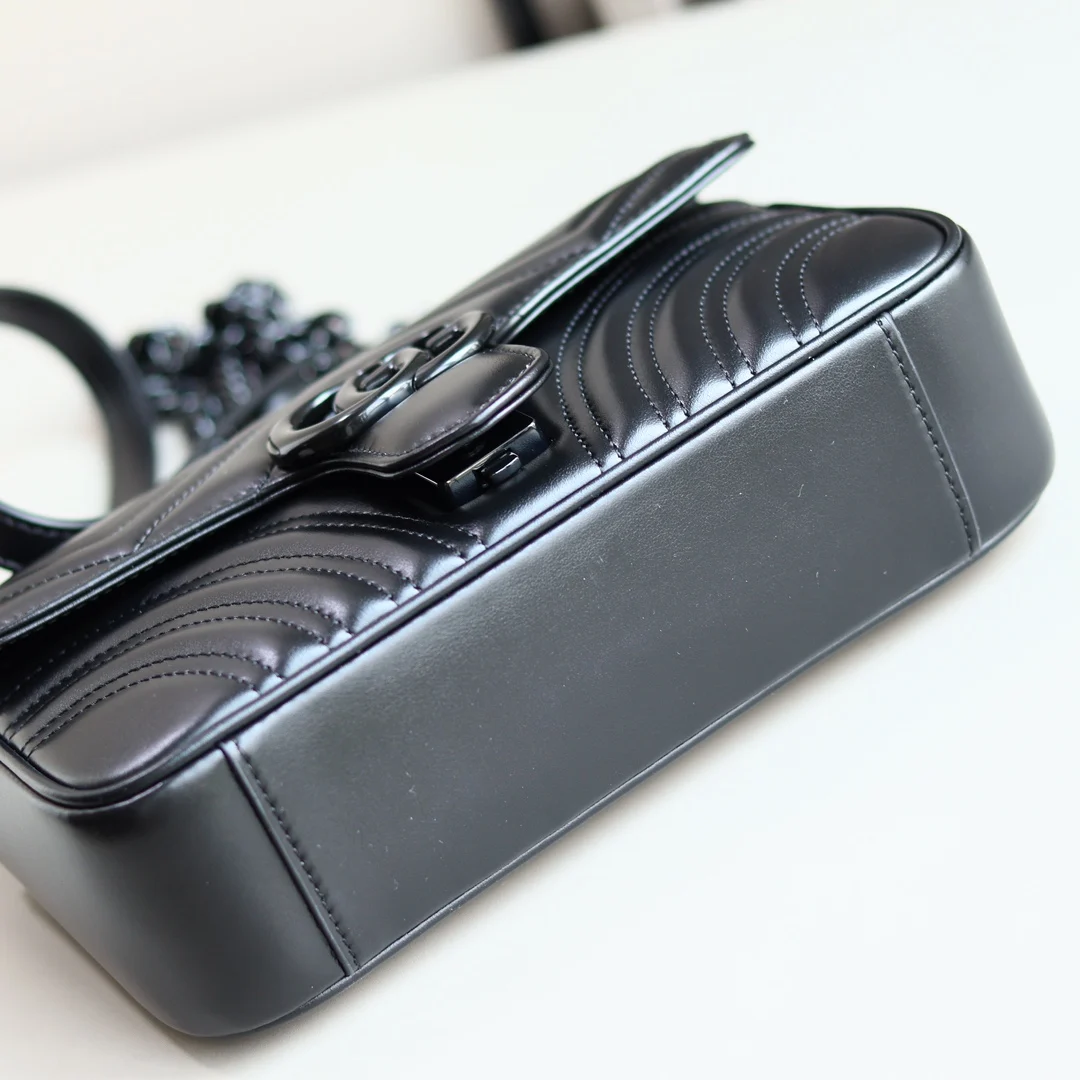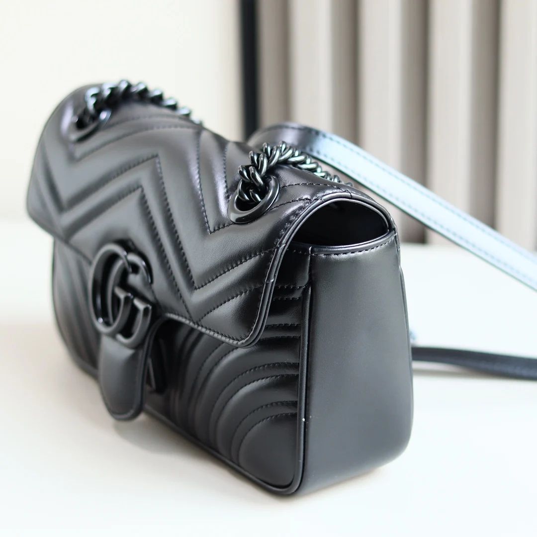 GG Marmont mini handbag in black gunmetal GG Marmont chain mini bag with a softly structured shape and oversized flap closure with Double G hardware. This new hue is crafted from quilted V leather with tonal hardware. The sliding chain strap can be worn multiple ways, changing between a shoulder and a top handle bag. Dimensions: 22*13*6cm. Style number: 446744