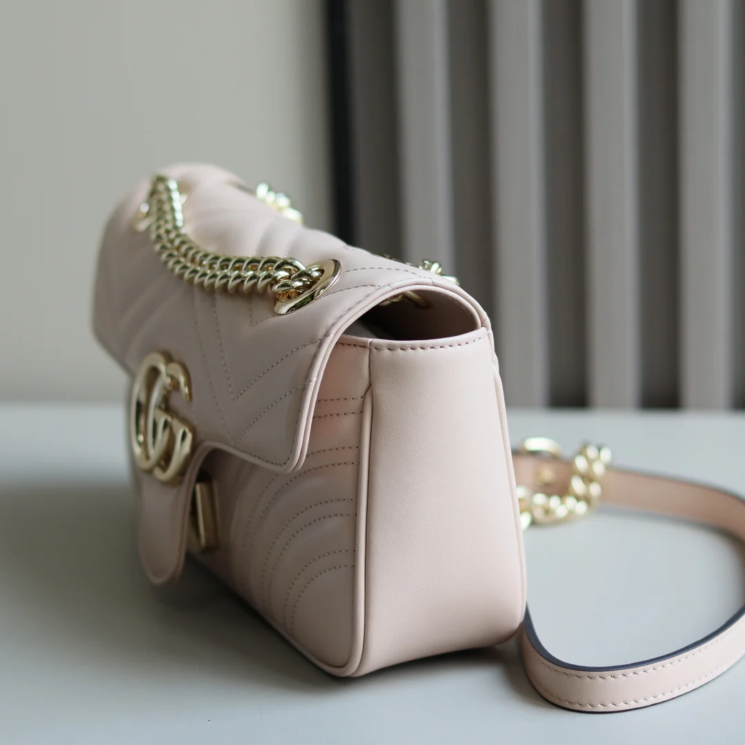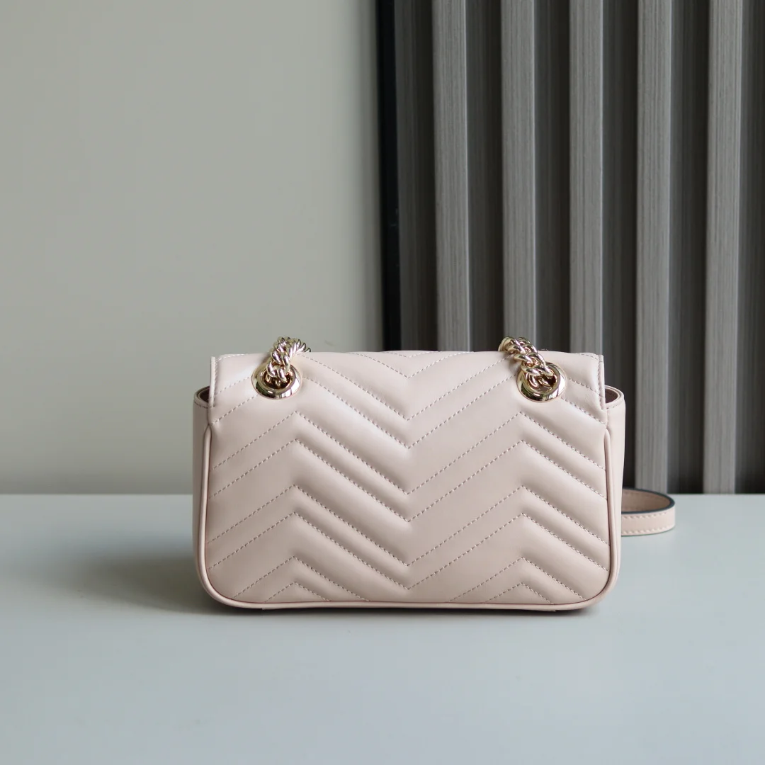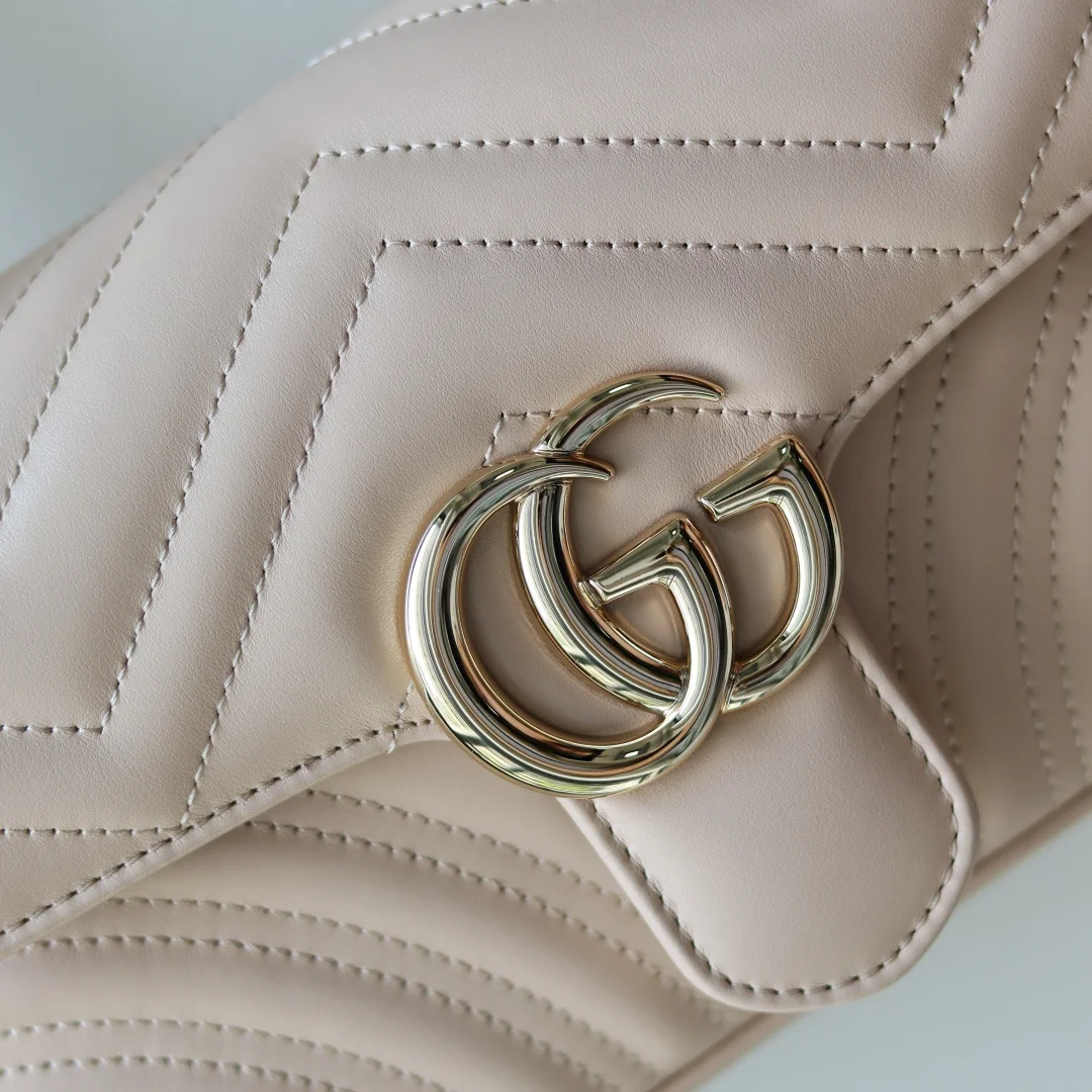 Original Leather [New Product] GG Marmont Quilted Mini Bag. This GG Marmont mini bag features a highly recognizable shape, crafted from neutral light beige quilted V-pattern leather with a slightly structured body, flap closure, and Double G hardware. This bag offers versatile carrying options, easily transitioning between a shoulder bag and a top handle bag by sliding the metal chain. Light beige quilted V-pattern leather, antique gold-toned hardware, microfiber lining with a suede-like finish, Double G, sliding chain strap can be worn as a shoulder strap with a 55cm drop or can be worn as a top handle with a 30cm drop. Can also be worn as a crossbody bag. Spring closure flap. Weight: approximately 0.6kg. Model: 446744. Dimensions: 22cm (W) x 13cm (H) x 6cm (D). Color: Light Pink Original Leather. Made in Italy. The model is 177cm tall. Can fit: iPhone Pro Max Plus, AirPods, small wallet, and lipstick.