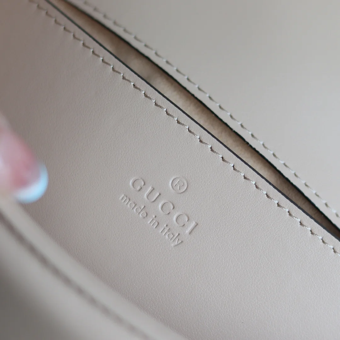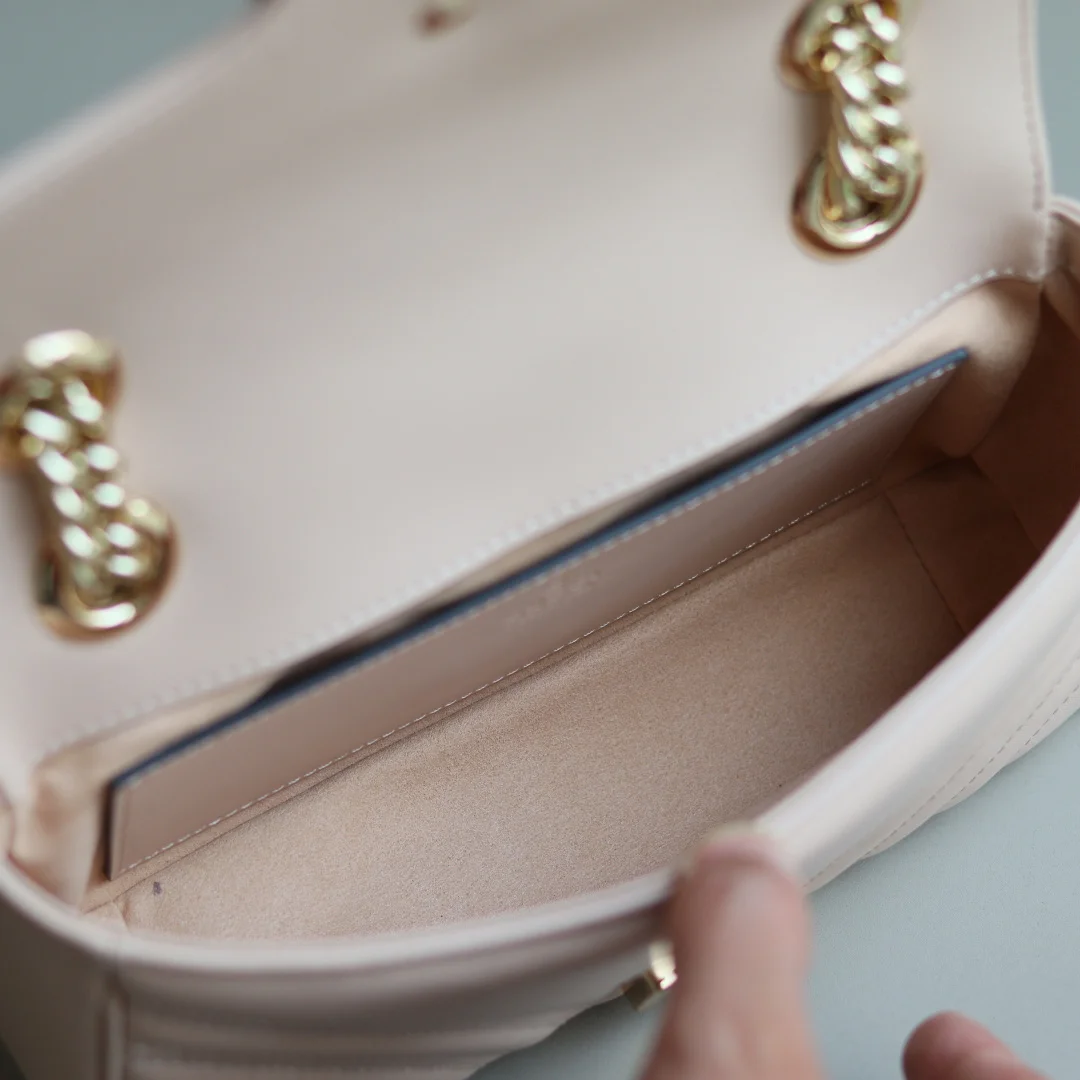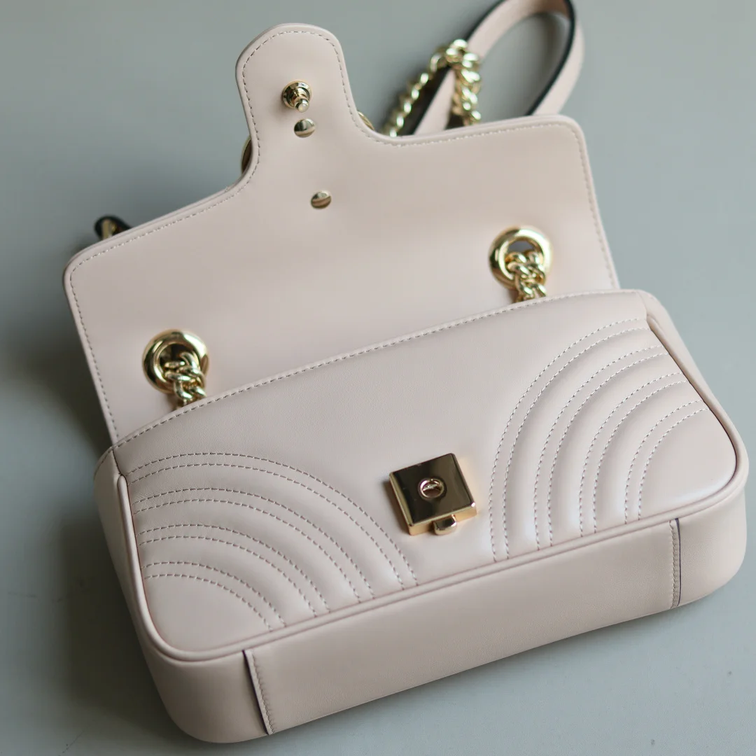Original Leather [New Product] GG Marmont Quilted Mini Bag. This GG Marmont mini bag features a highly recognizable shape, crafted from neutral light beige quilted V-pattern leather with a slightly structured body, flap closure, and Double G hardware. This bag offers versatile carrying options, easily transitioning between a shoulder bag and a top handle bag by sliding the metal chain. Light beige quilted V-pattern leather, antique gold-toned hardware, microfiber lining with a suede-like finish, Double G, sliding chain strap can be worn as a shoulder strap with a 55cm drop or can be worn as a top handle with a 30cm drop. Can also be worn as a crossbody bag. Spring closure flap. Weight: approximately 0.6kg. Model: 446744. Dimensions: 22cm (W) x 13cm (H) x 6cm (D). Color: Light Pink Original Leather. Made in Italy. The model is 177cm tall. Can fit: iPhone Pro Max Plus, AirPods, small wallet, and lipstick.