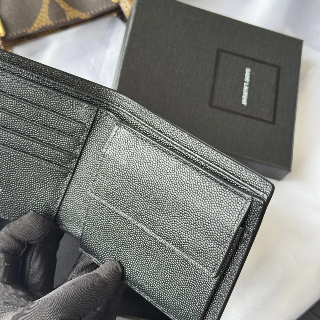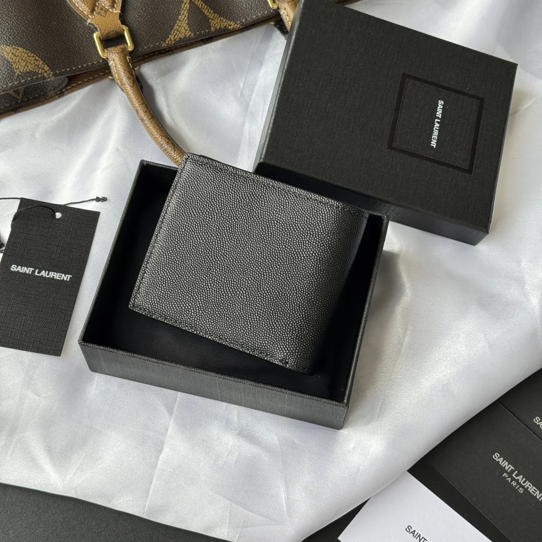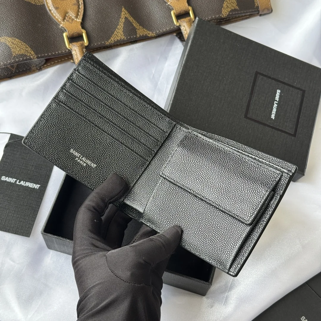 YSL men s wallet with coin pocket, MONOGRAM bi-fold wallet with metal YSL signature. Interior: two bill compartments, eight card slots, and two receipt compartments. Model: 463249. Color: as shown. Dimensions: 11*9.5*2.5cm.