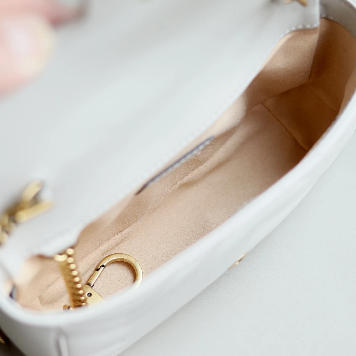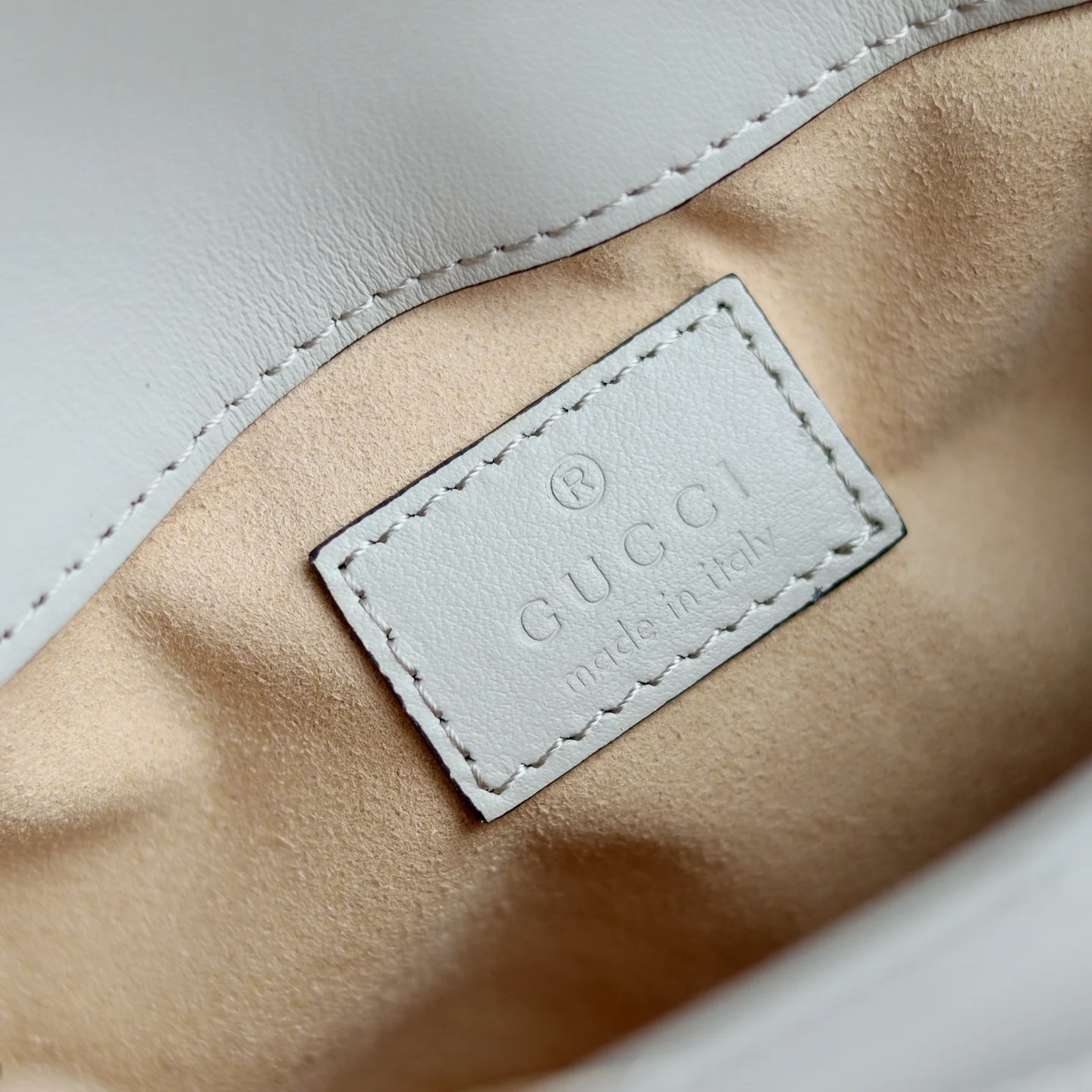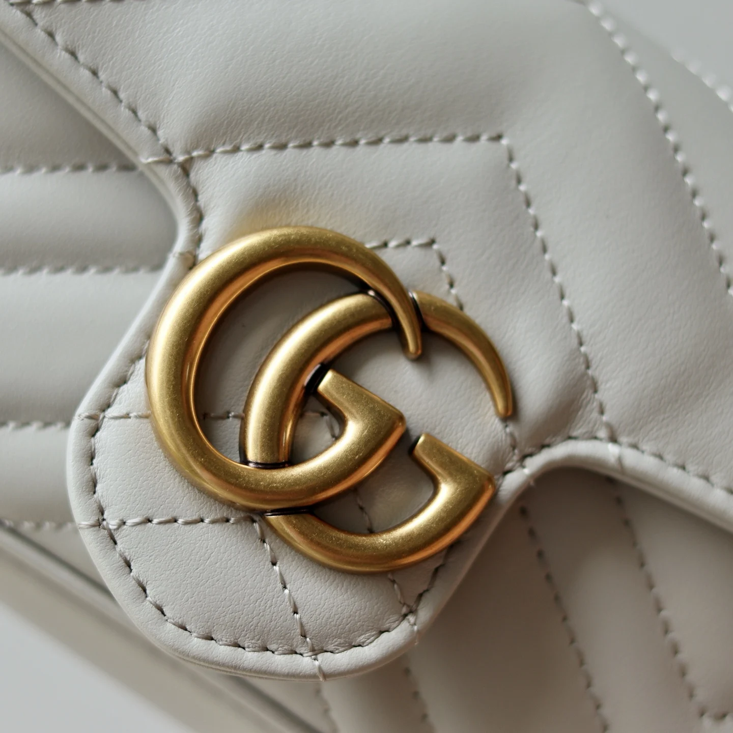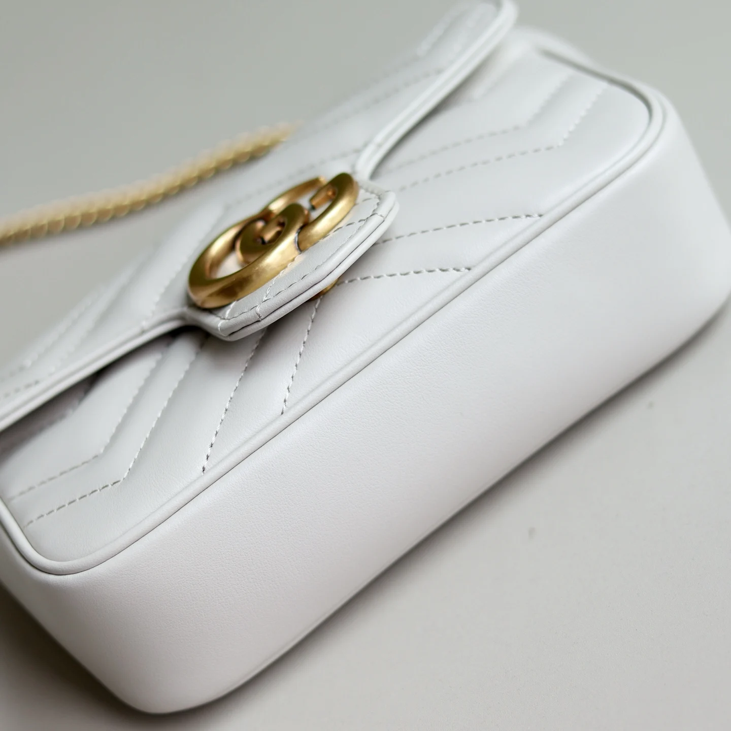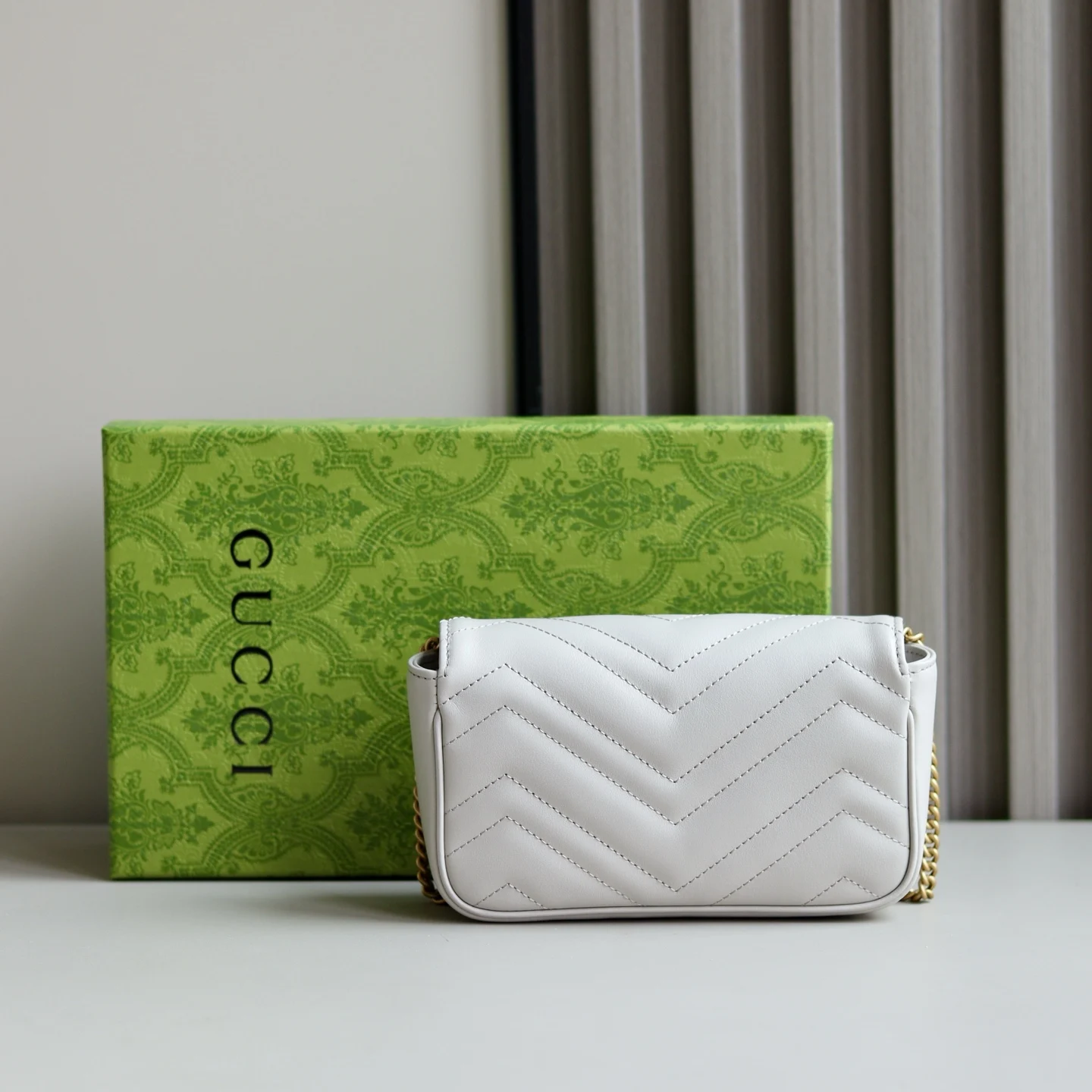 Original leather [New product] GG Marmont series super mini handbag. This super mini handbag is made of light gray quilted V-pattern leather, and the antique gold-toned hardware with the classic Double G logo adds a touch of brightness to the overall design. The key ring can be used to attach this item to other bags, enhancing the charm of the entire design. Light gray quilted V-pattern leather, gold-toned hardware, suede-like microfiber lining, comes with a key ring that can be attached separately to the bag, Double G, chain shoulder strap (60 cm drop), weight: approximately 0.35 kg. Model: 476433. Dimensions: 10 (L) x 16.5 (W) x 4.5 cm (D) Color: Light Gray Original Leather. Made in Italy. The model is 176 cm tall and can accommodate an iPhone Pro, card holder, and lipstick.