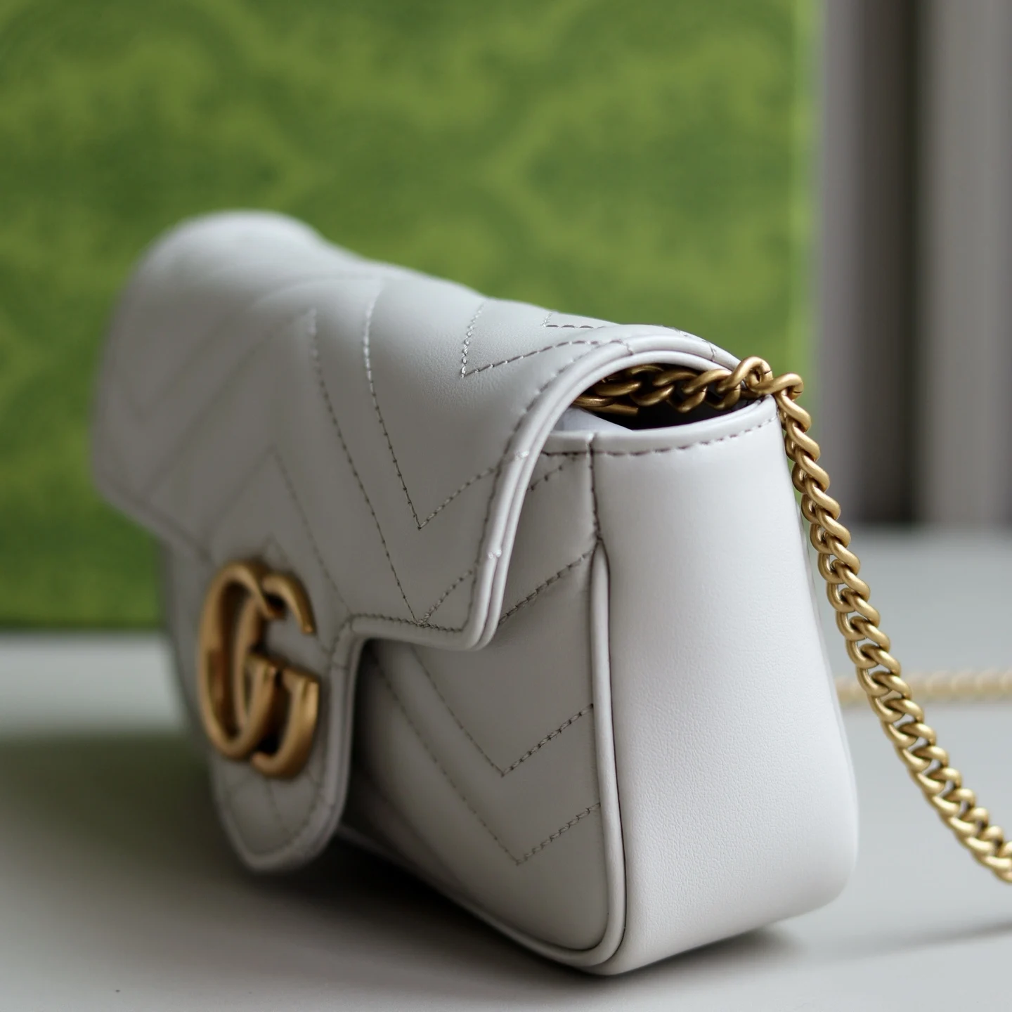 Original leather [New product] GG Marmont series super mini handbag. This super mini handbag is made of light gray quilted V-pattern leather, and the antique gold-toned hardware wi..