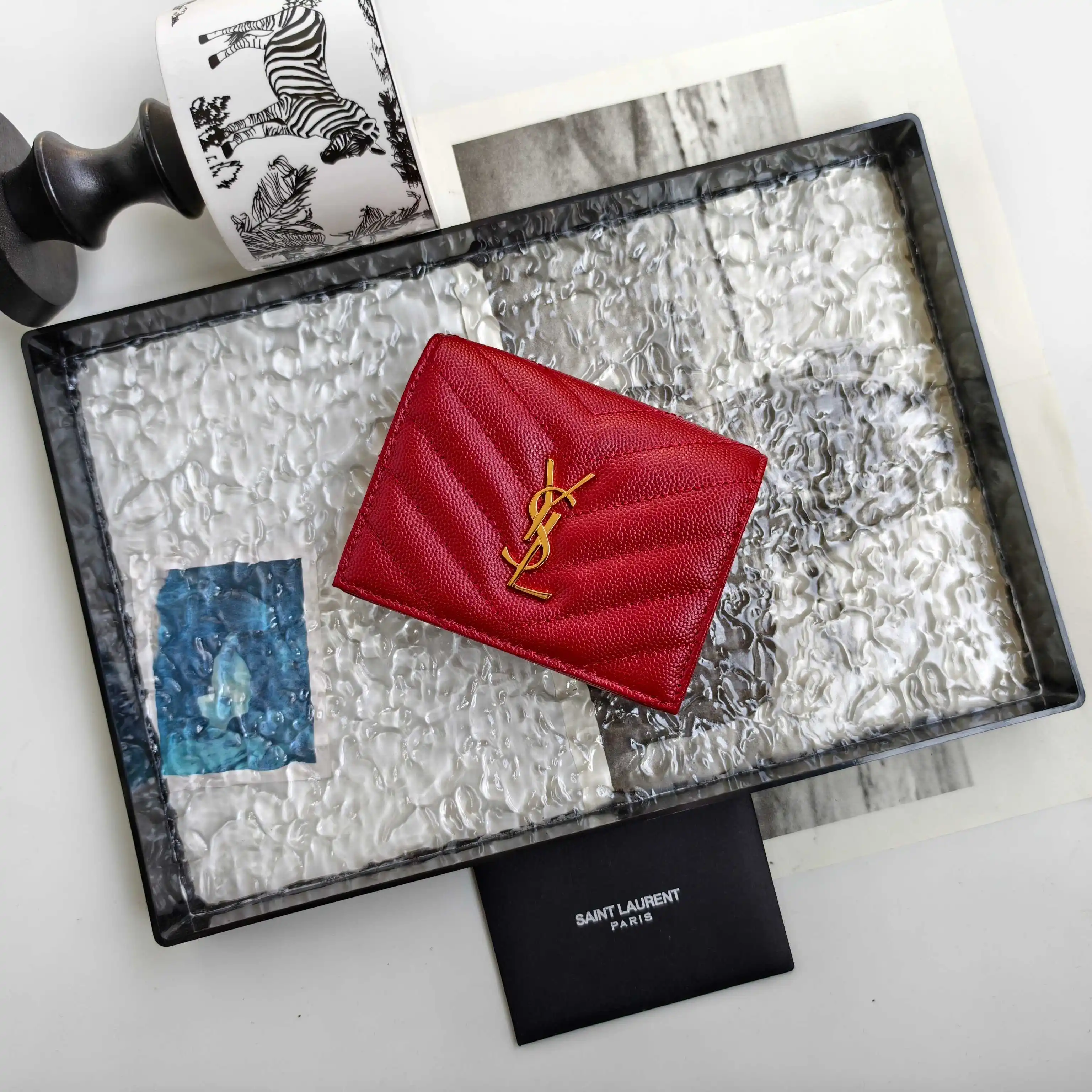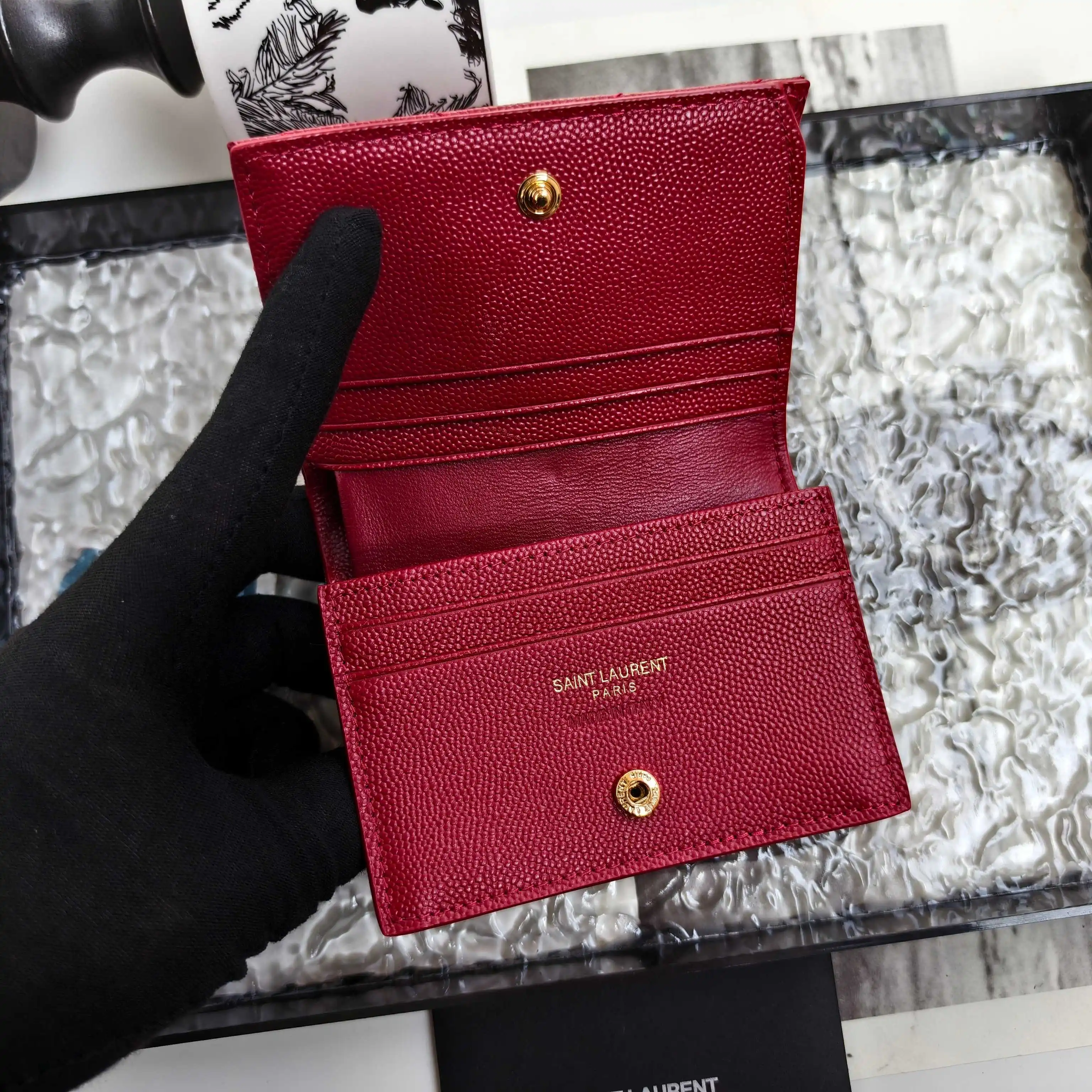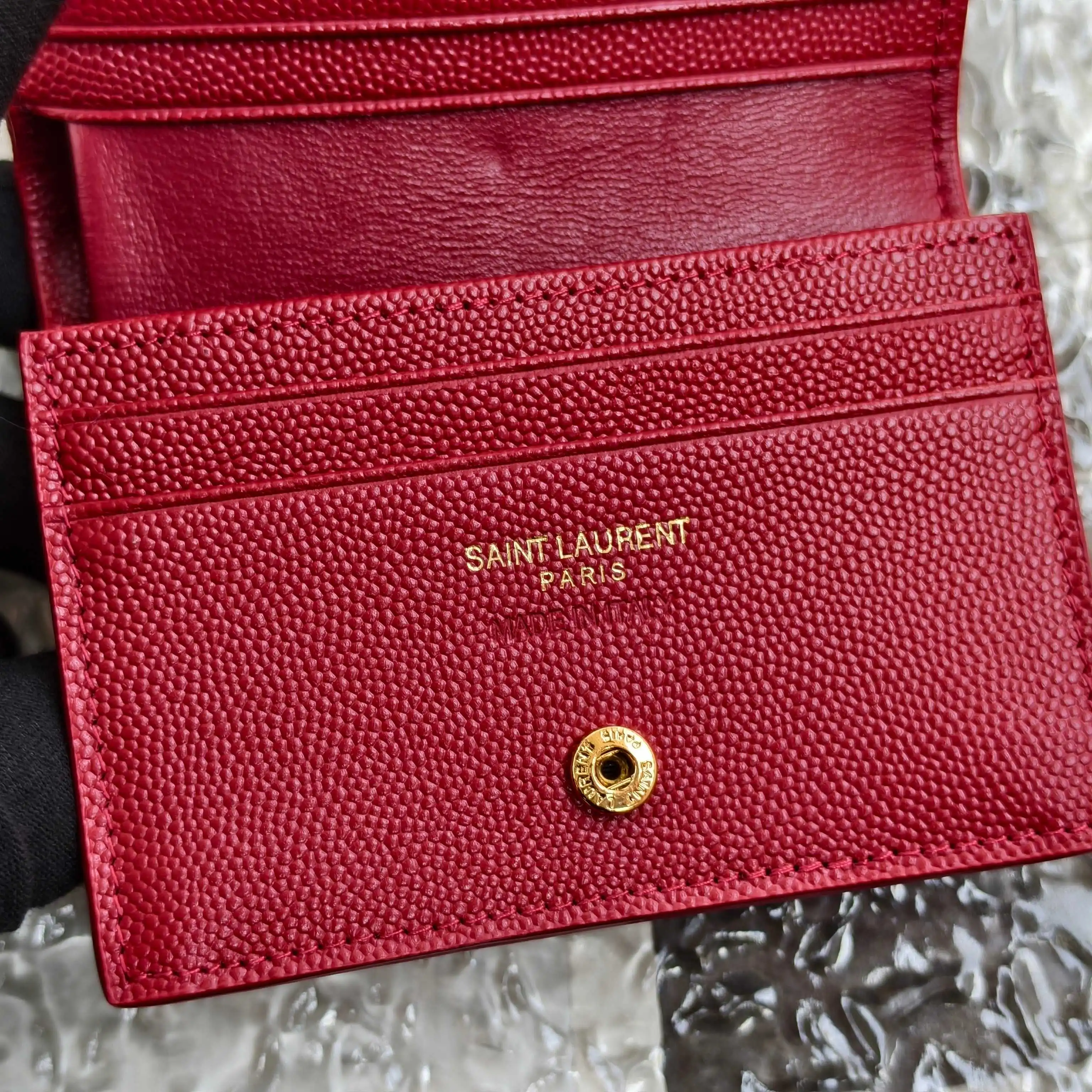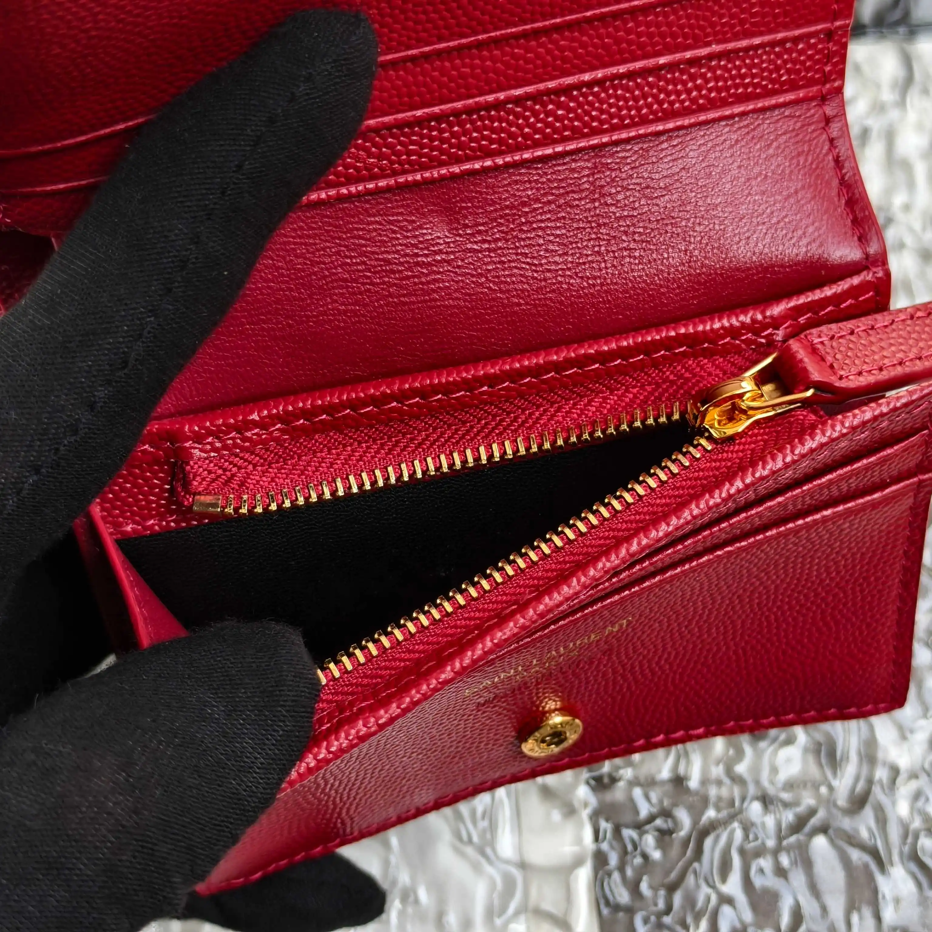 Y brand short wallet, authentic development, imported caviar-textured cowhide, one central compartment, one bill compartment, six card slots, one zippered coin pocket, compact size but very useful, petite and exquisite, super practical. Model: 530841 Caviar Red with Gold Hardware Dimensions: 11*8.5*3cm