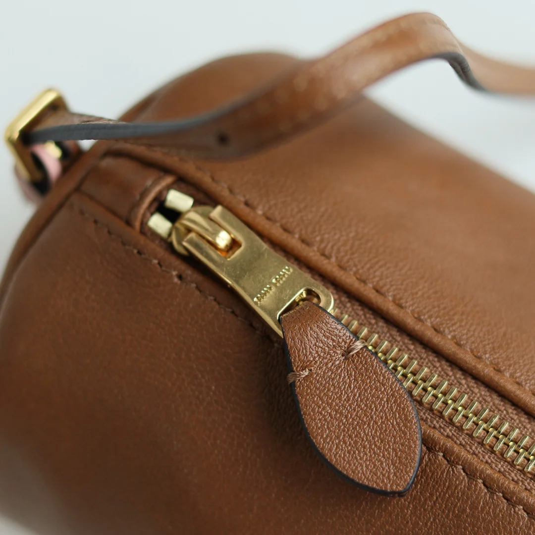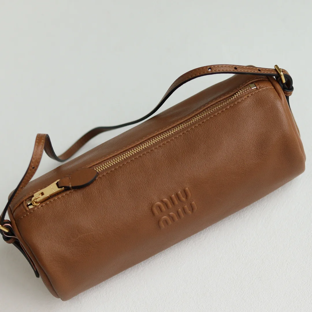 5NE851MiuM small cylindrical bag, made of vintage distressed soft lambskin, the leather is soft, comes with an adjustable shoulder strap, the actual product has a really ..