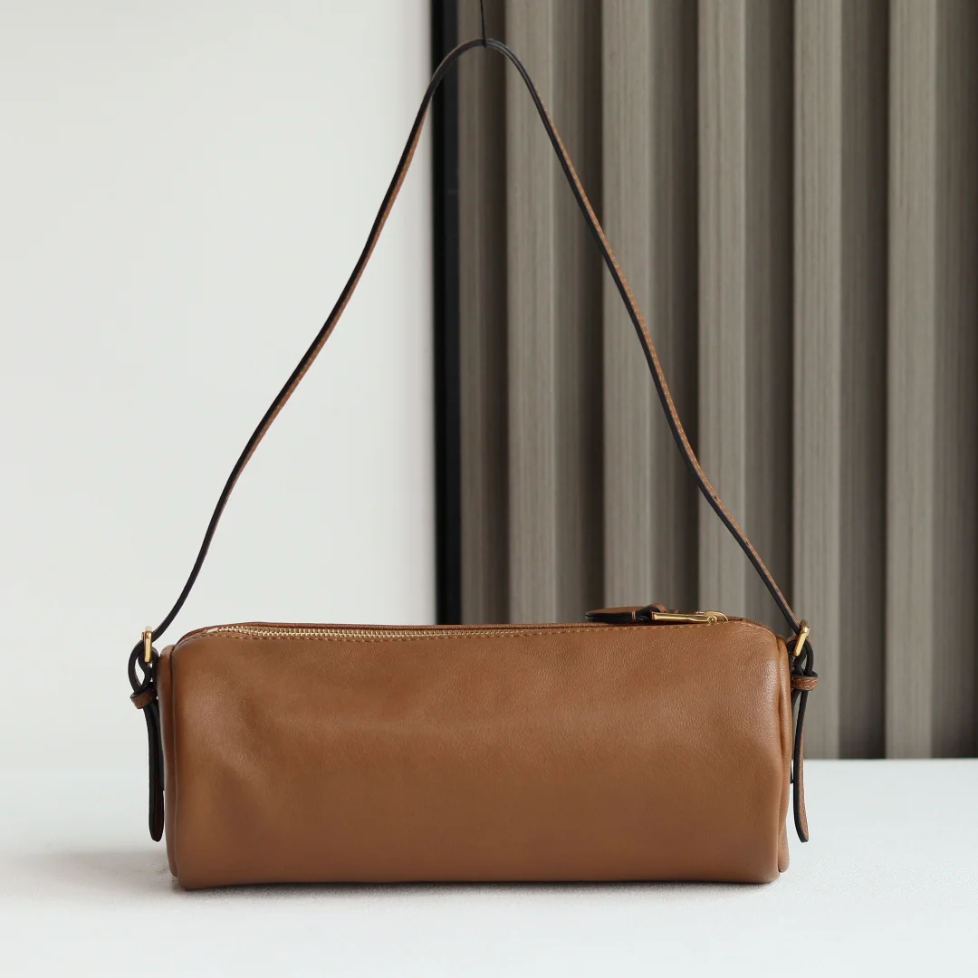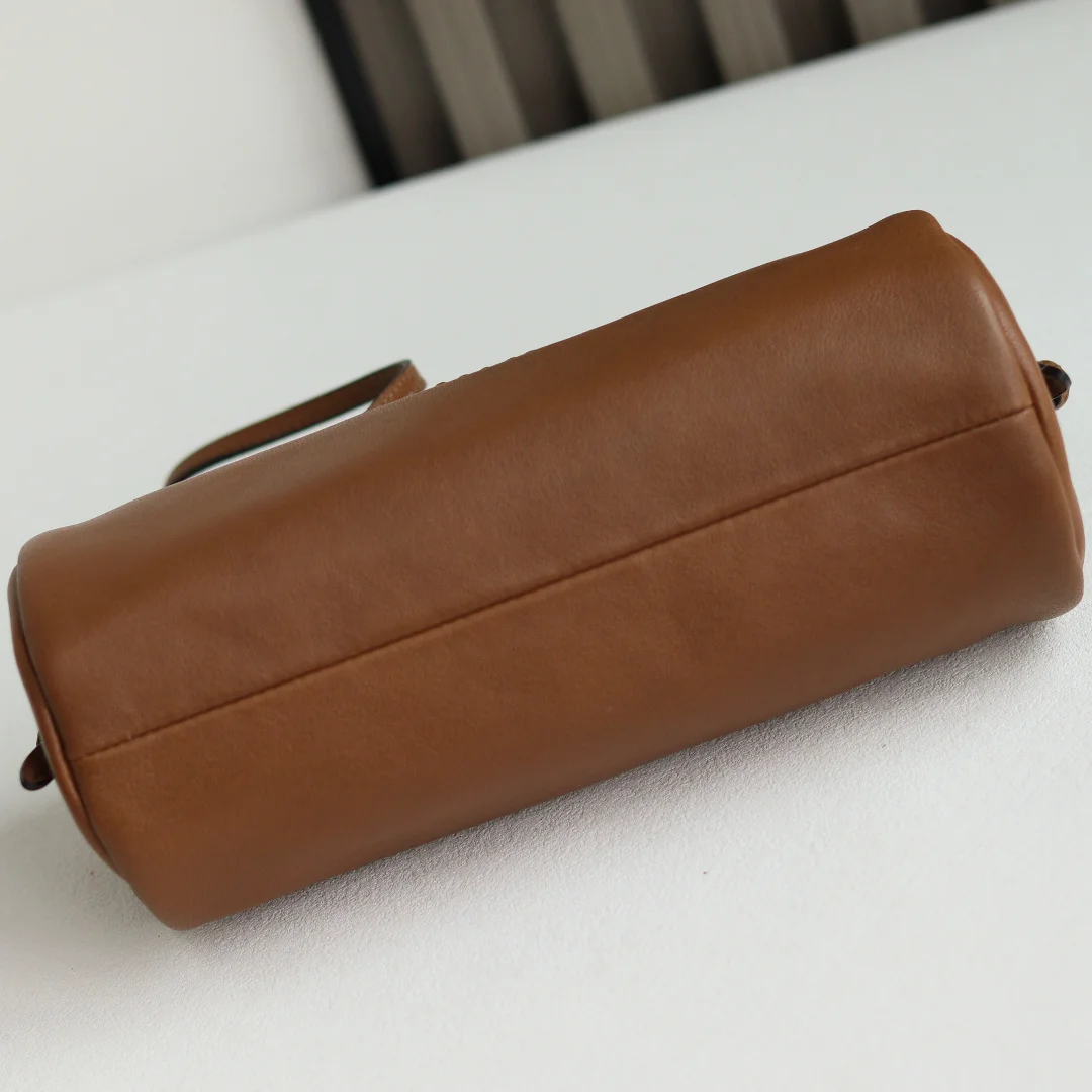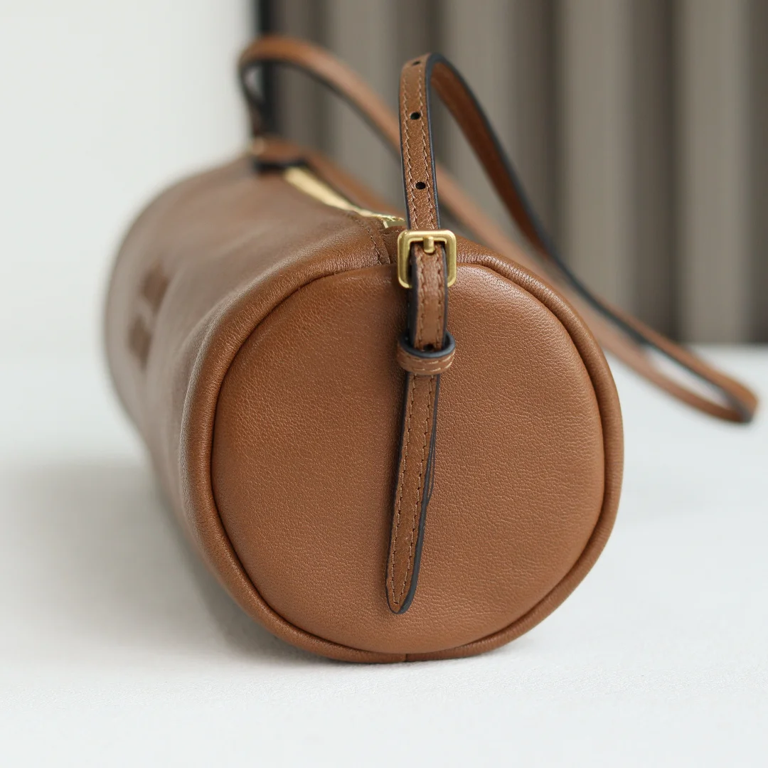 5NE851MiuM small cylindrical bag, made of vintage distressed soft lambskin, the leather is soft, comes with an adjustable shoulder strap, the actual product has a really high-quality feel, the cylindrical structure is very design-oriented, small yet exquisite, both sassy and cute, full of youthful charm, with ample capacity, very convenient to carry under the arm.