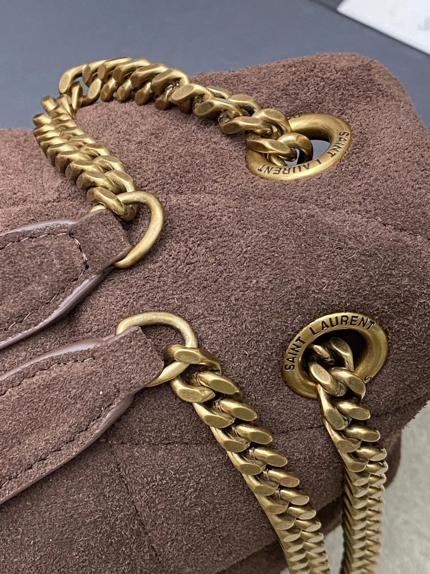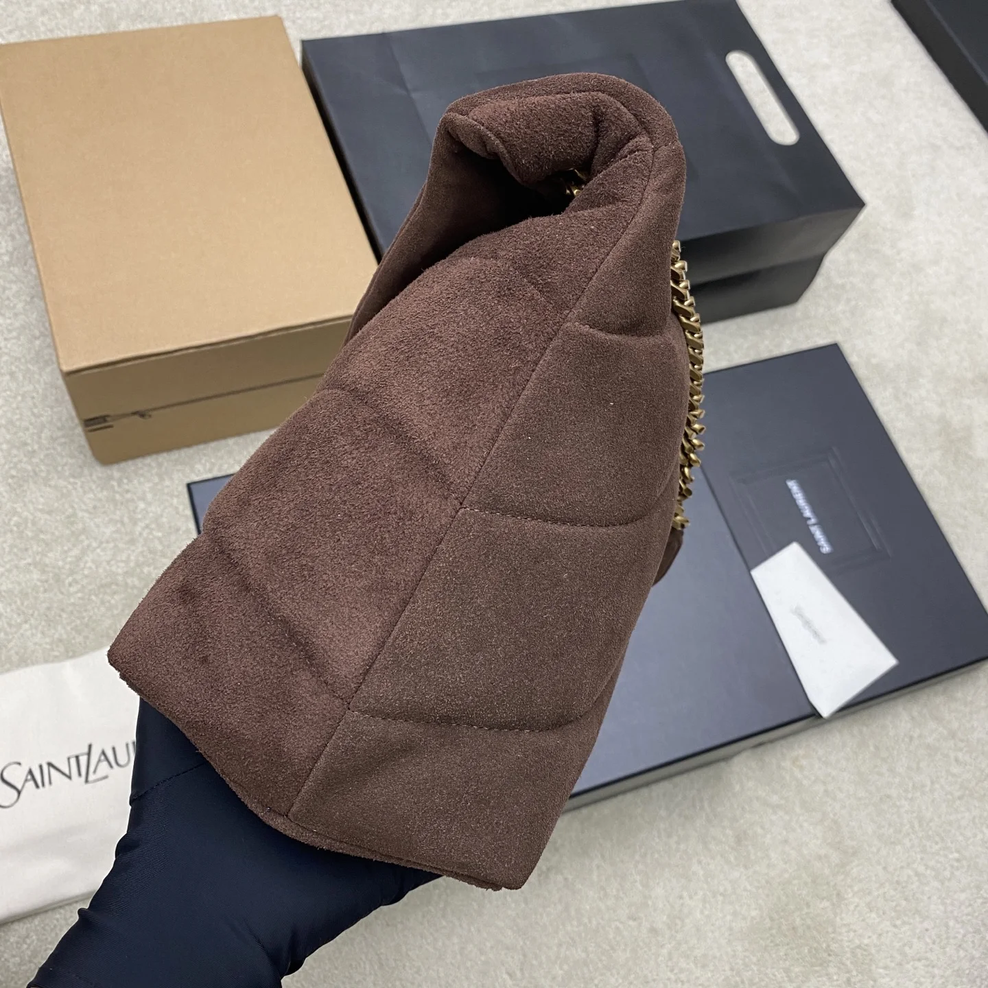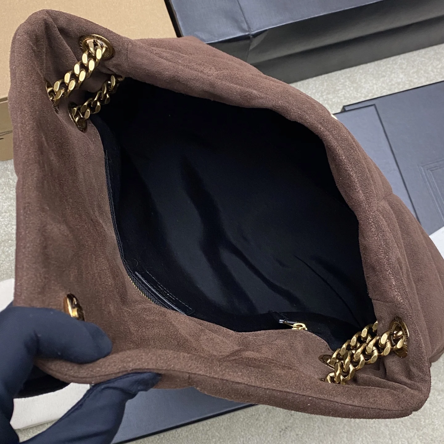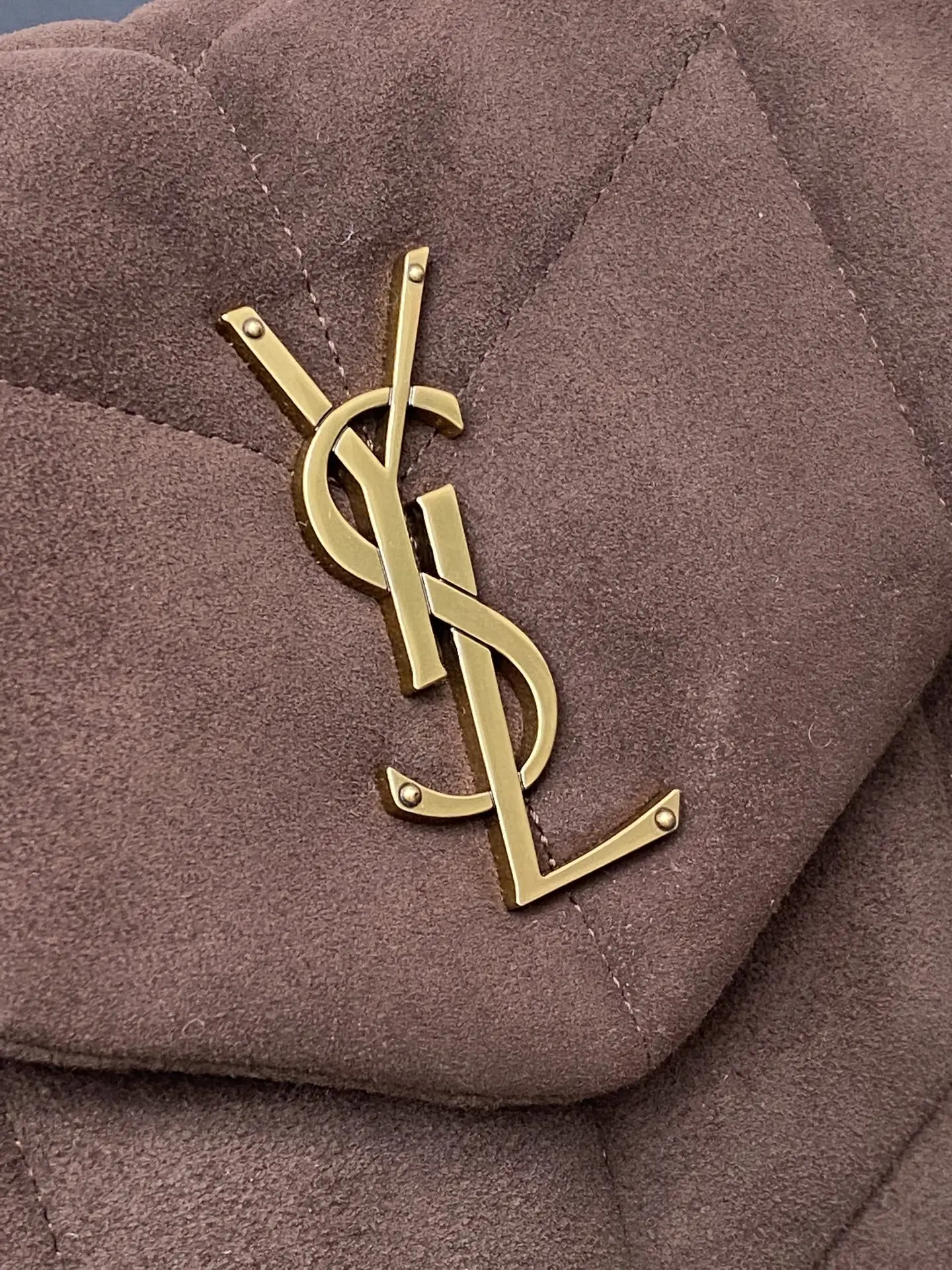 Coffee Suede/Aged Gold 𝑳𝑶𝑼𝑳𝑶𝑼 𝑷𝑼𝑭𝑭𝑬𝑹 Large Quilted Suede, crafted with genuine original leather, offering a soft and delicate touch, like embracing a cloud. The classic YSL logo, chain, and eyelet hardware all feature brushed matte silver hardware. The bag opening is secured with a magnetic snap closure after folding, ensuring excellent sealing and security.