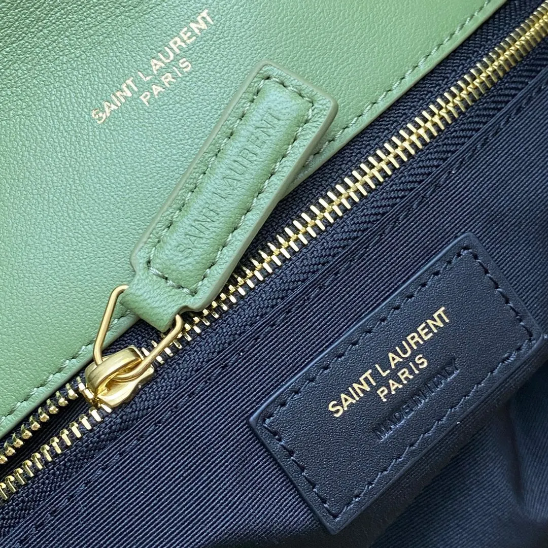 Avocado green lambskin/gold 𝑳𝑶𝑼𝑳𝑶𝑼 𝑷𝑼𝑭𝑭𝑬𝑹 large quilted lambskin bag, made with original genuine leather, feels soft and delicate, like holding a cloud. The classic YSL logo, chain, and eyelet hardware all feature brushed matte silver hardware. The bag opening folds over and is secured with a magnetic snap closure, providing excellent sealing and security.