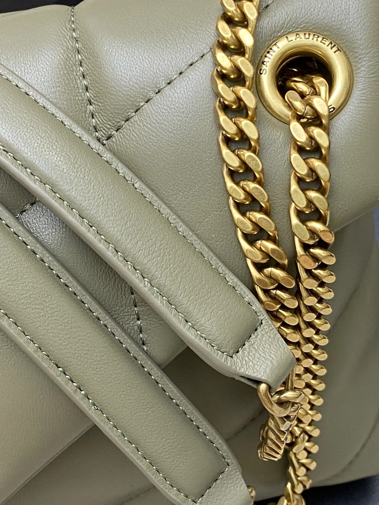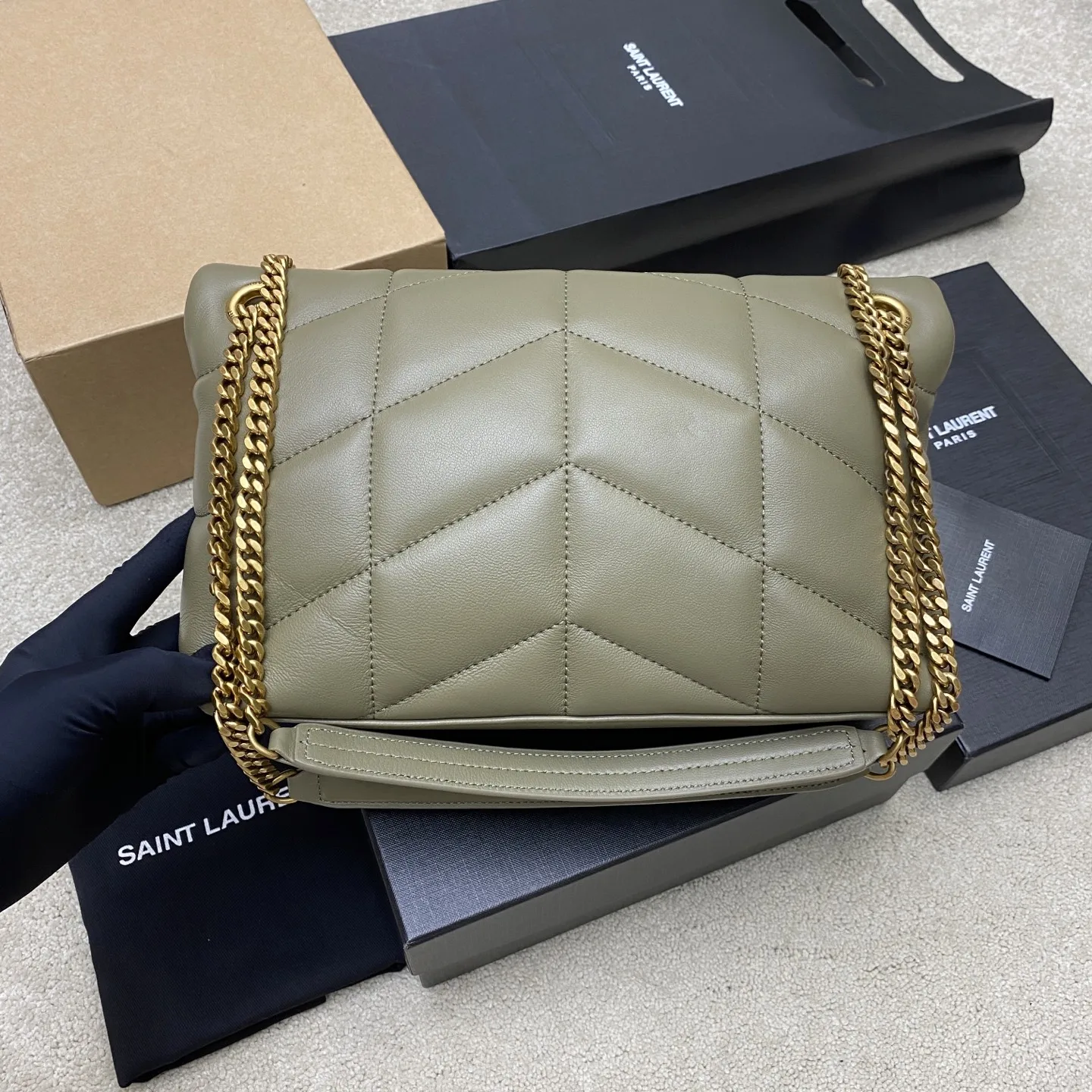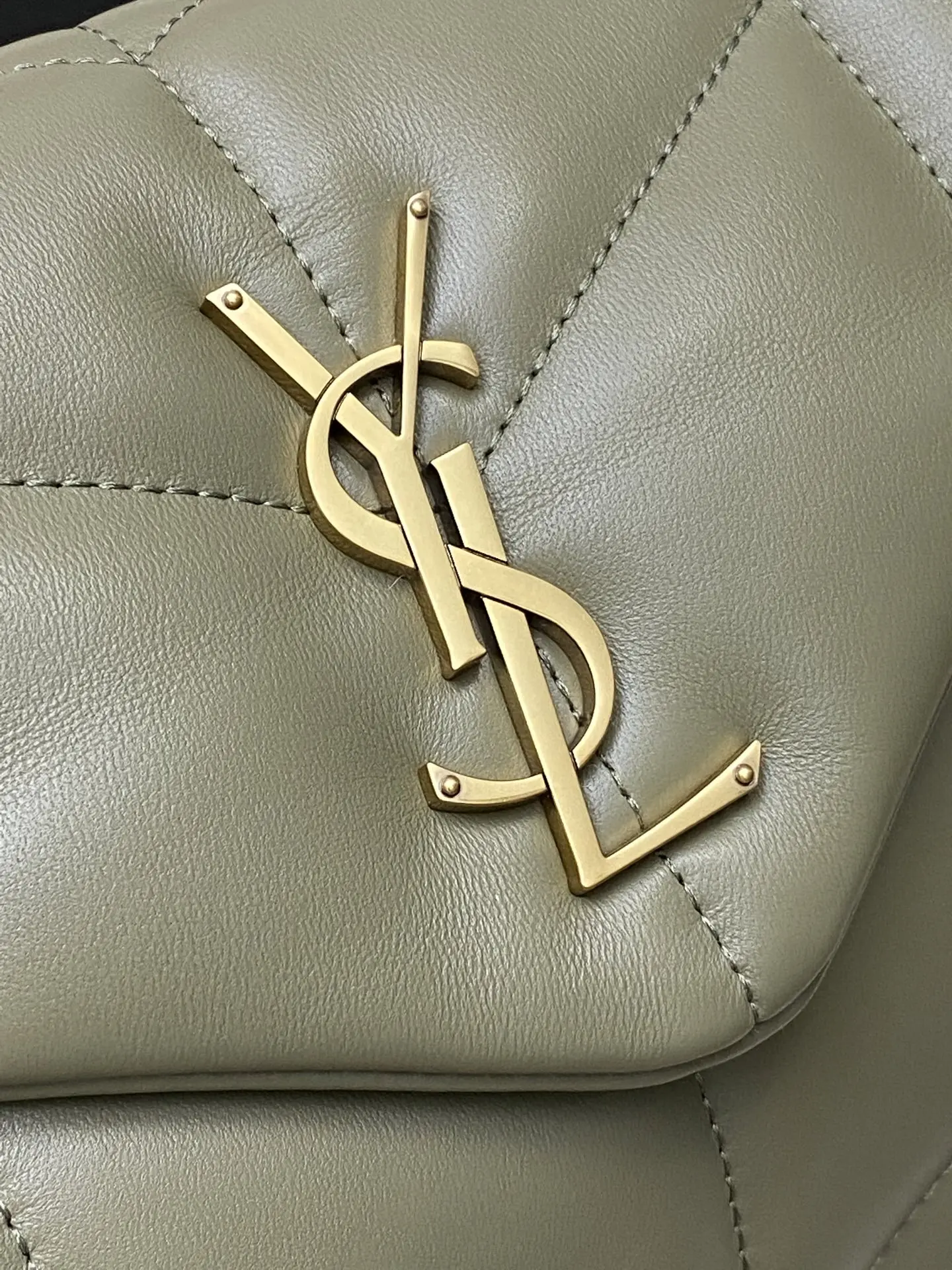 Moss green lambskin/gold LOULOU UFFER medium quilted lambskin bag, made of genuine original leather, feels soft and delicate, like holding a cloud. The classic YSL logo, chain, and buckle hardware all use matte antique gold hardware. The bag opening is folded and sealed with a magnetic snap fastener, providing excellent sealing and security.
