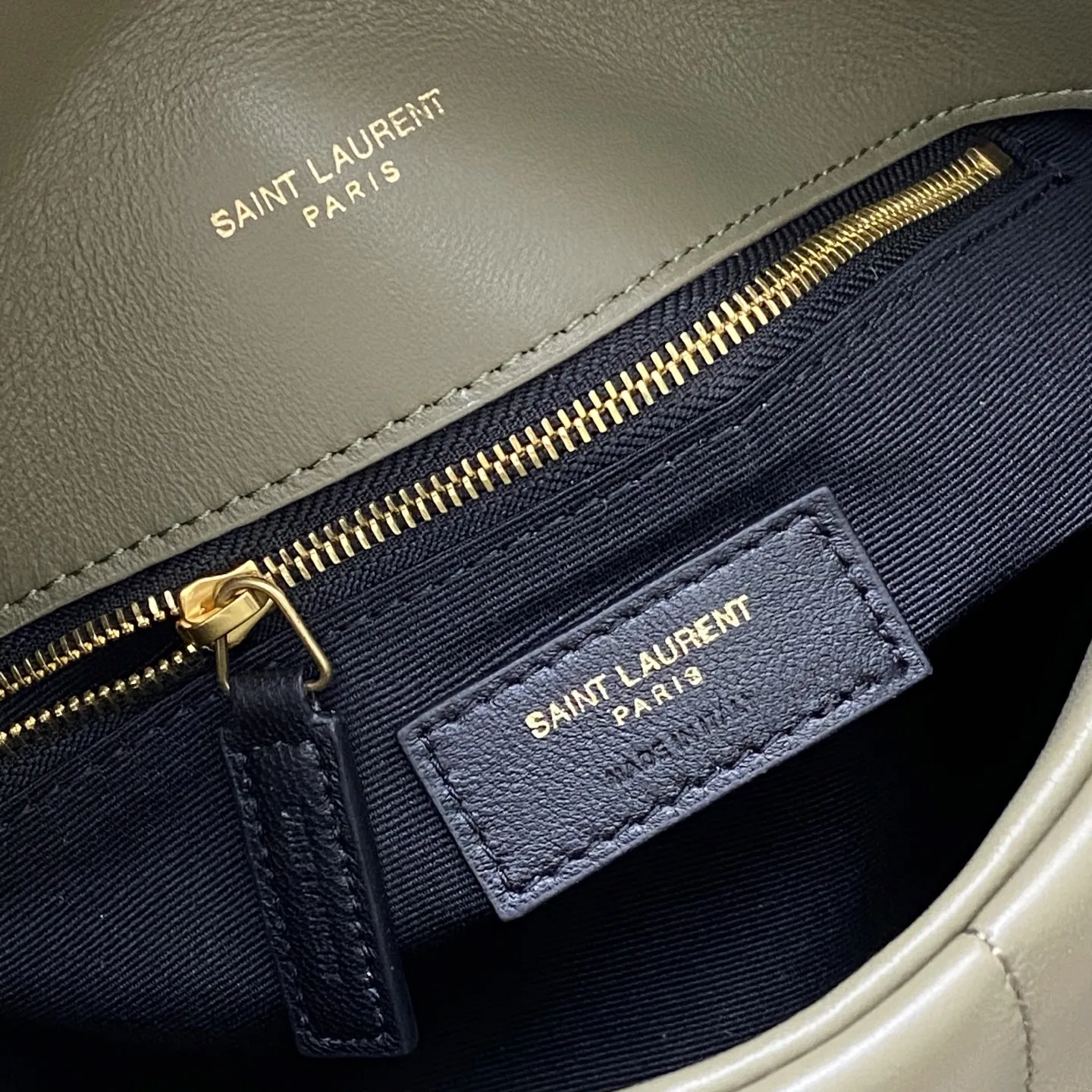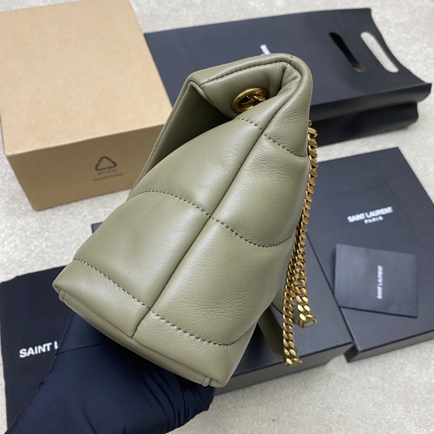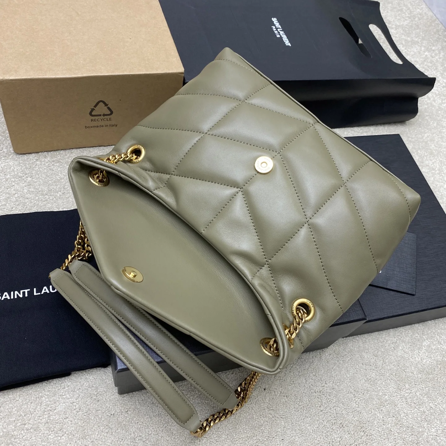 Moss green lambskin/gold LOULOU UFFER medium quilted lambskin bag, made of genuine original leather, feels soft and delicate, like holding a cloud. The classic YSL logo, chain, and buckle hardware all use matte antique gold hardware. The bag opening is folded and sealed with a magnetic snap fastener, providing excellent sealing and security.