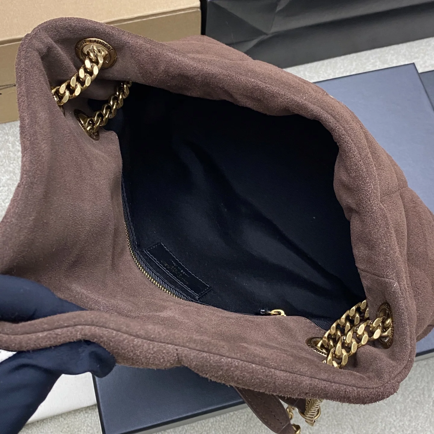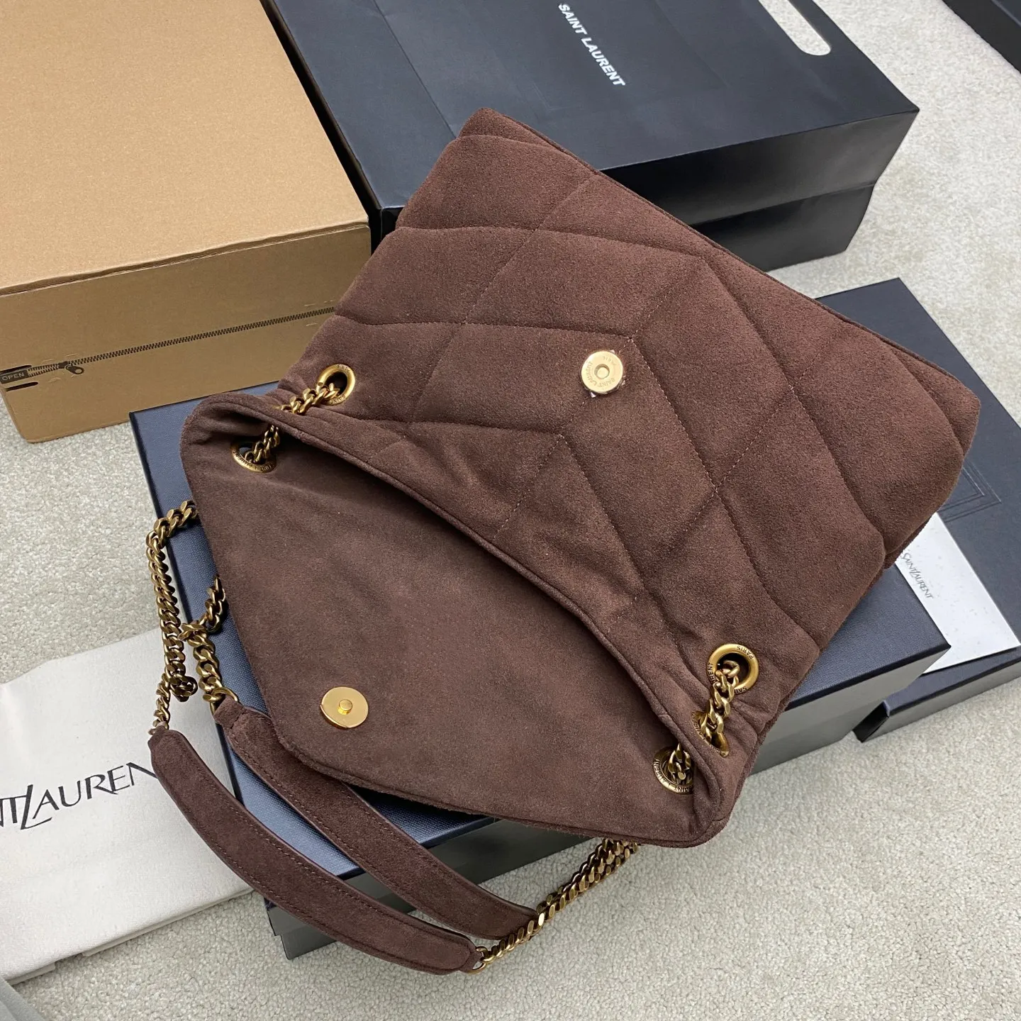 Coffee nubuck/gold LOULOU UFFER medium quilted nubuck, made of original leather, feels soft and delicate, like embracing a cloud. The classic YSL logo, chain and buckle hardware are all made of matte antique gold hardware. The bag opening is folded and sealed with a magnetic snap fastener, providing excellent sealing and security.