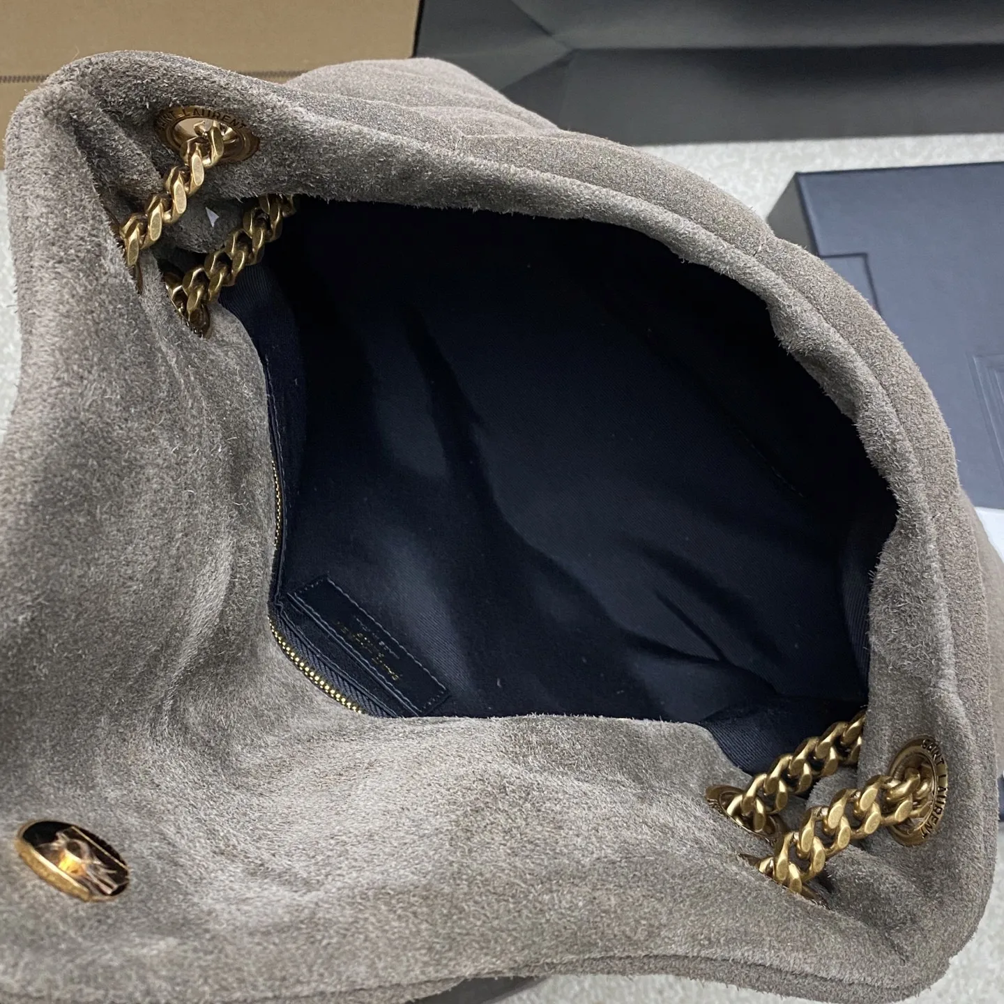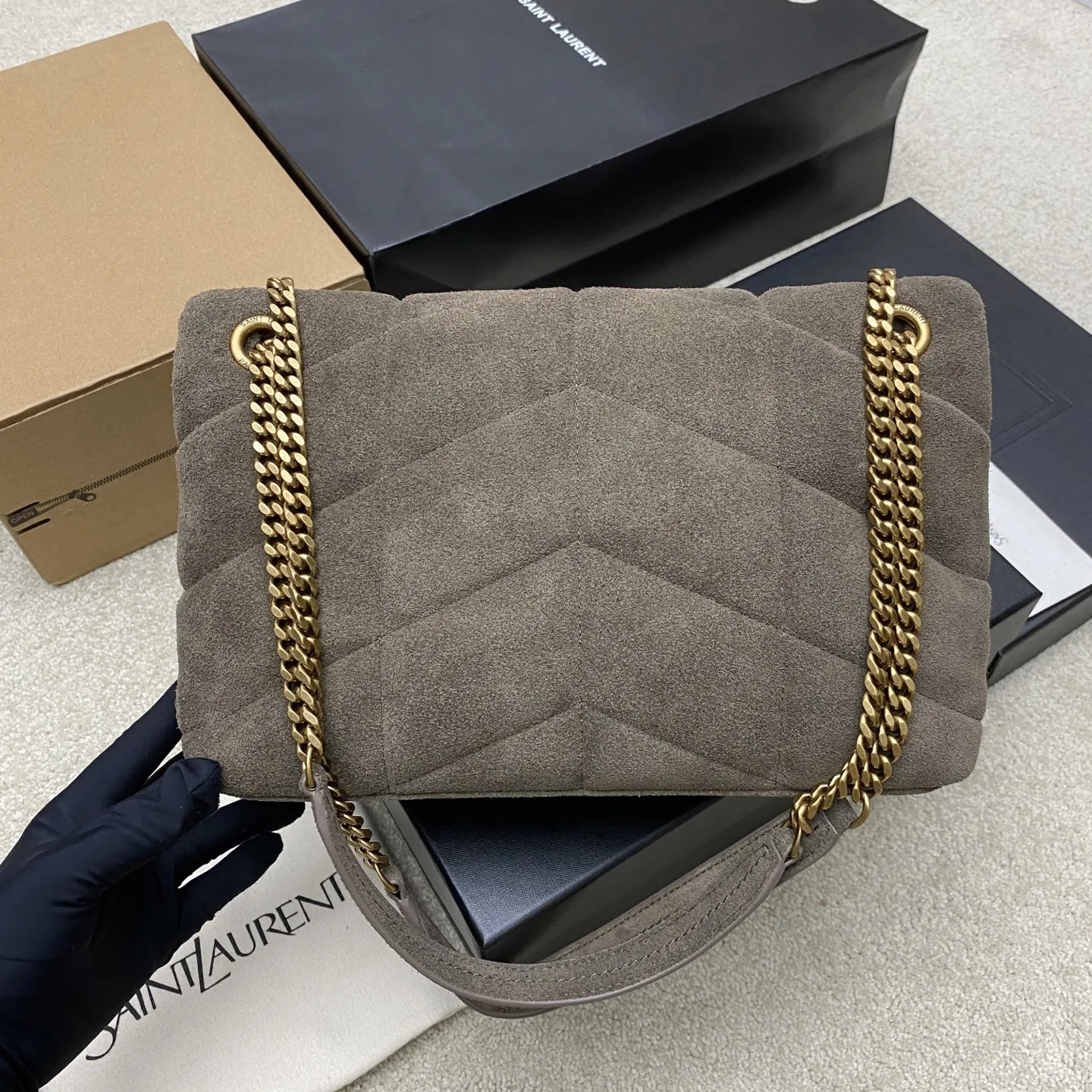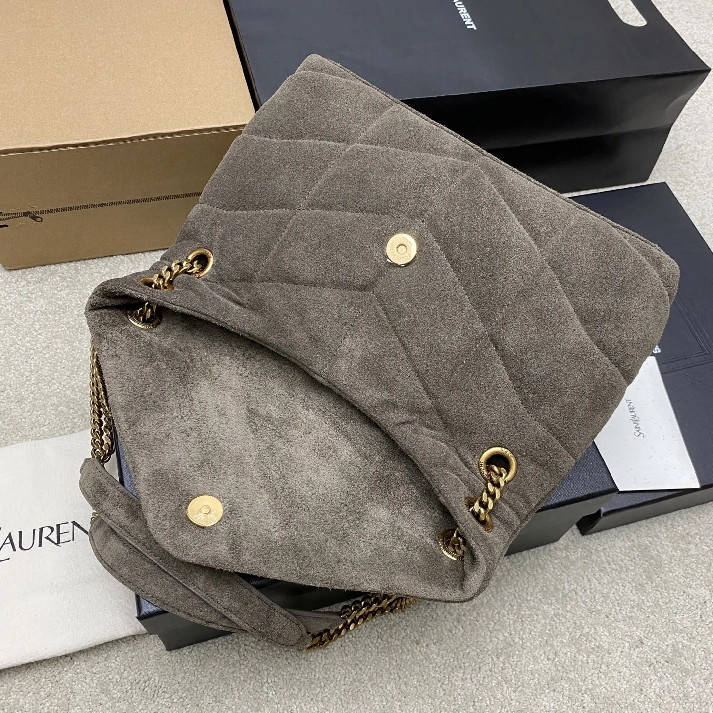 Musk green frosted/gold LOULOU PUFFER medium quilted frosted suede, made of original genuine leather, feels soft and delicate, like holding a cloud. The classic YSL logo, chain and eyelet hardware are all made of platinum matte antique gold hardware. The bag opening is folded and sealed with a magnetic snap fastener, providing excellent airtightness and security.