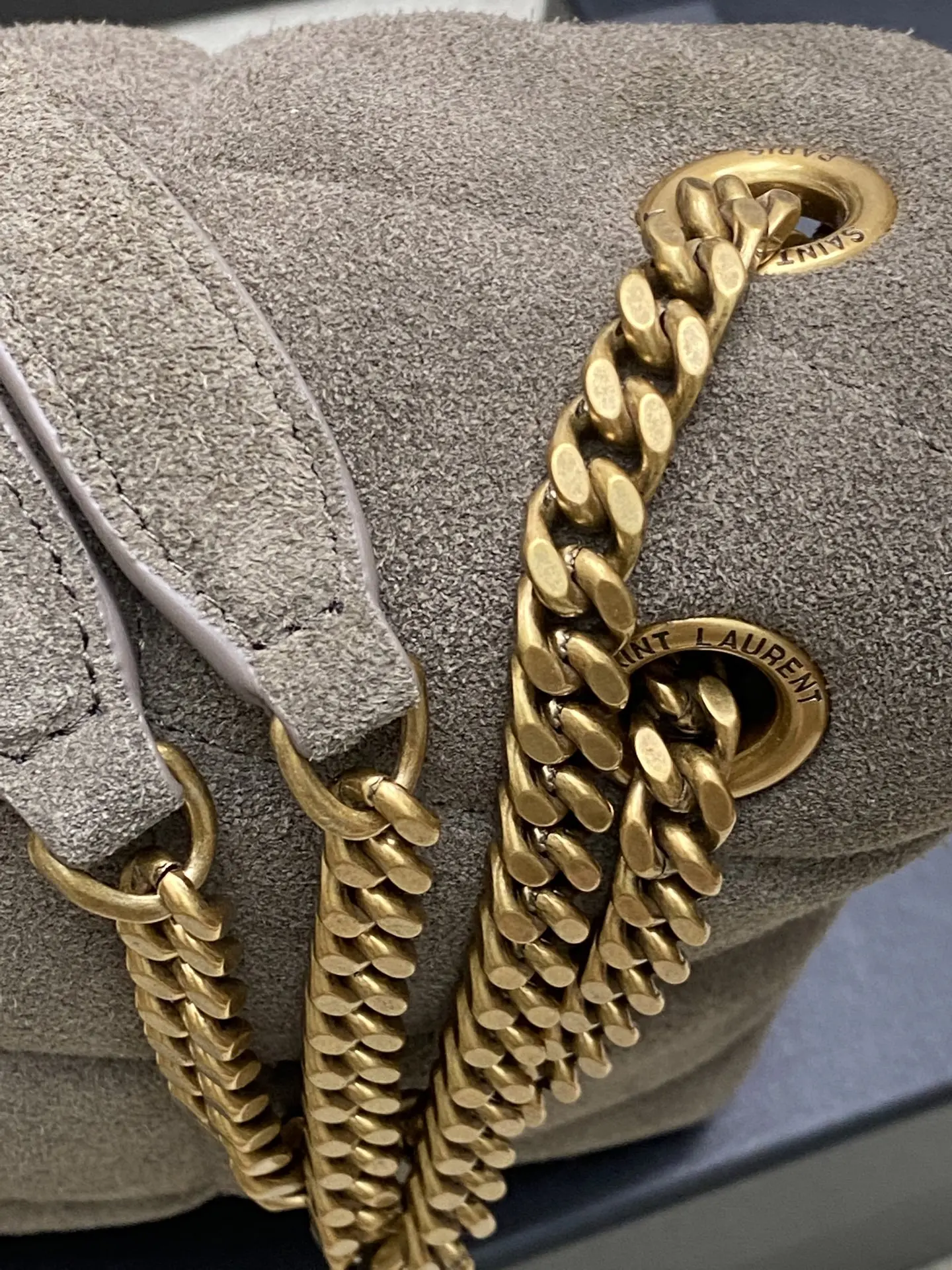 Musk green frosted/gold LOULOU PUFFER medium quilted frosted suede, made of original genuine leather, feels soft and delicate, like holding a cloud. The classic YSL logo, chain ..