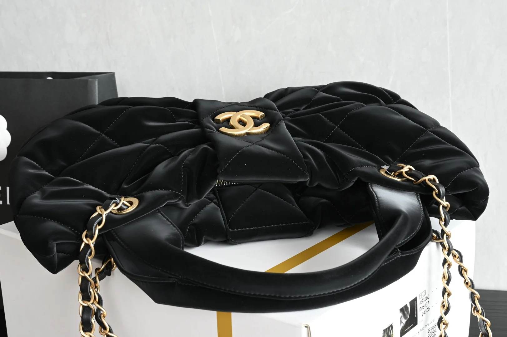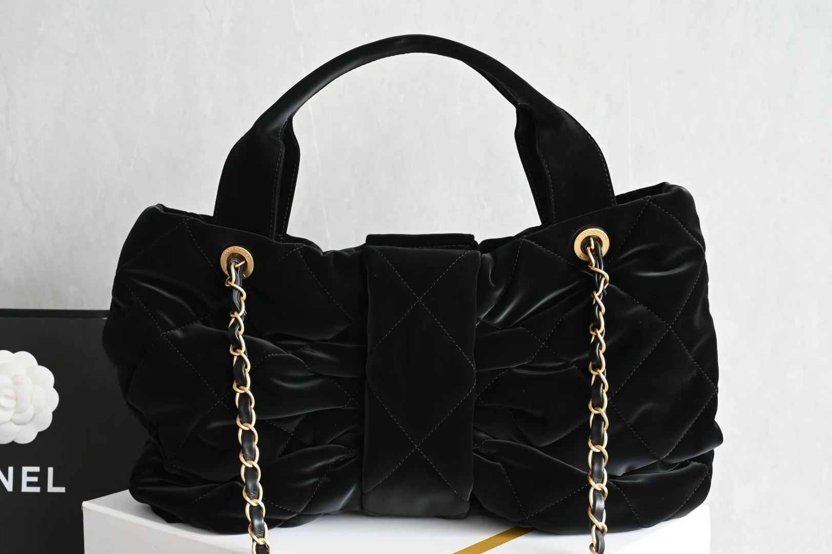 Platinum Edition Authentic Grade. Brand new arrival with packaging as shown in the picture. CHANEL 25k Velvet Bow Bag, Black Medium Size. Developed based on a purchase of 44,000 RMB from the official store. Hardware: Thick plated 24k vintage gold. Fabric: Velvet effect nylon. Dimensions: 38*29*5cm. 5851
