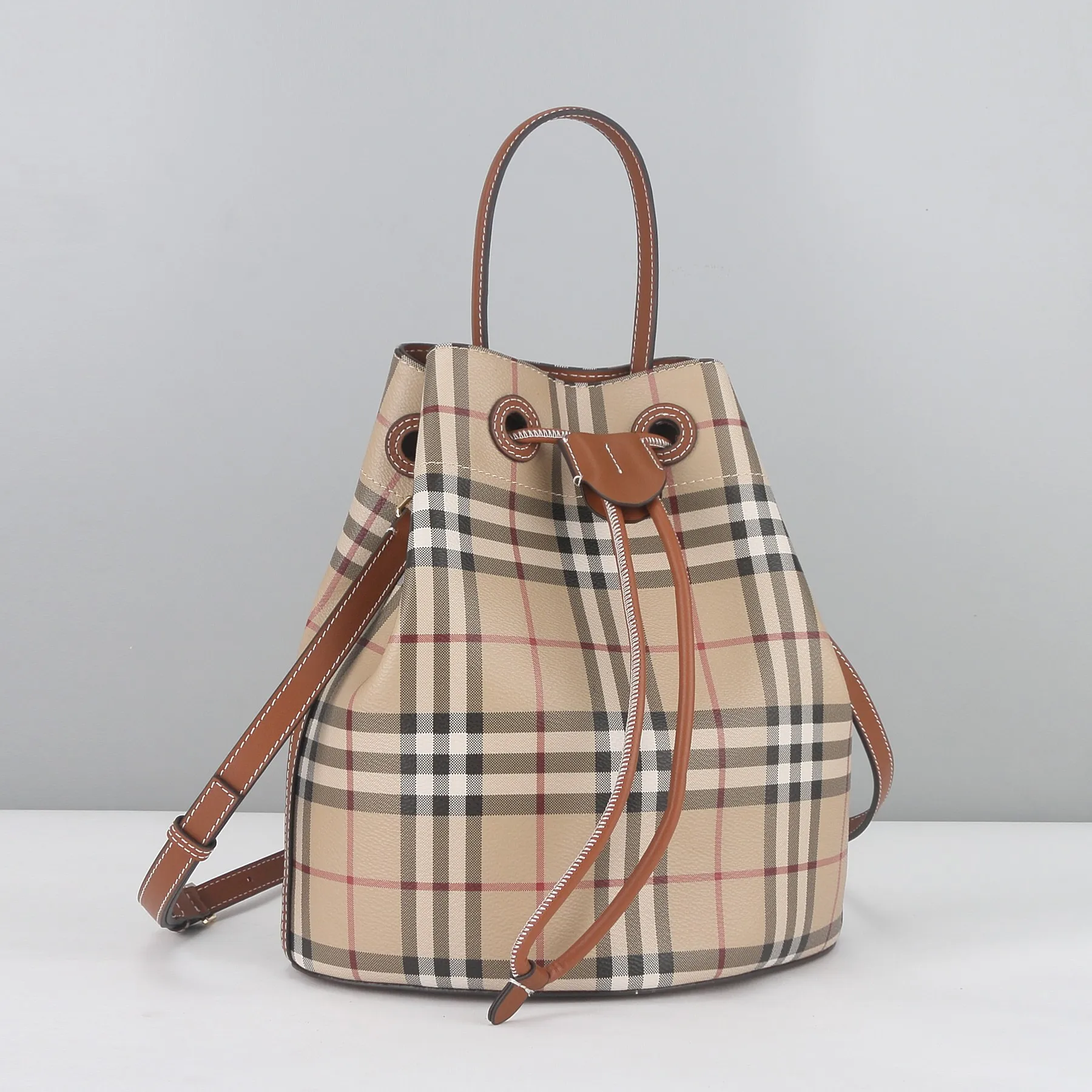 New arrival: Plaid brown bucket bag. This new season s plaid brown bucket bag is made of environmentally friendly and easy-to-care-for material, lightweight and durable, with a lar..