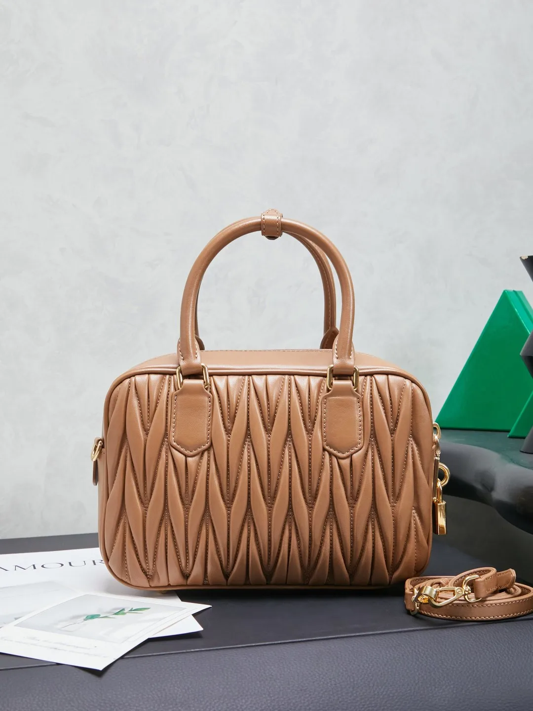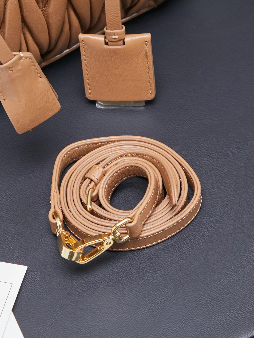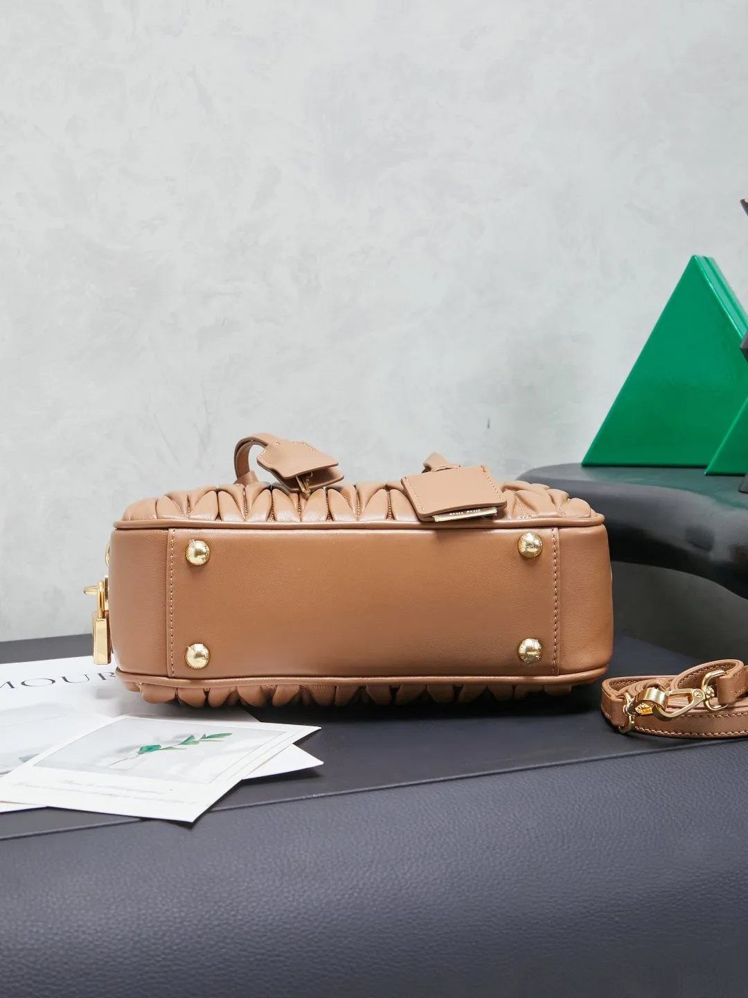 5BB124: MiuMiu s new bowling bag is too pretty. Made with imported lambskin, featuring the brand s classic iconic Matelasse textured embroidery and vintage frosted hardware. It retains its playful charm, with a structured and stylish silhouette that is full of personality, versatile for both sweet and chic looks. Its capacity is generous. Almost every major fashion blogger has one, and its popularity is no less than the previous MiuWander. Large size: 24X16X7.5CM