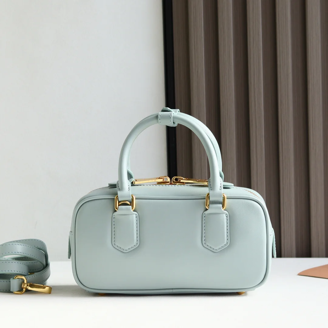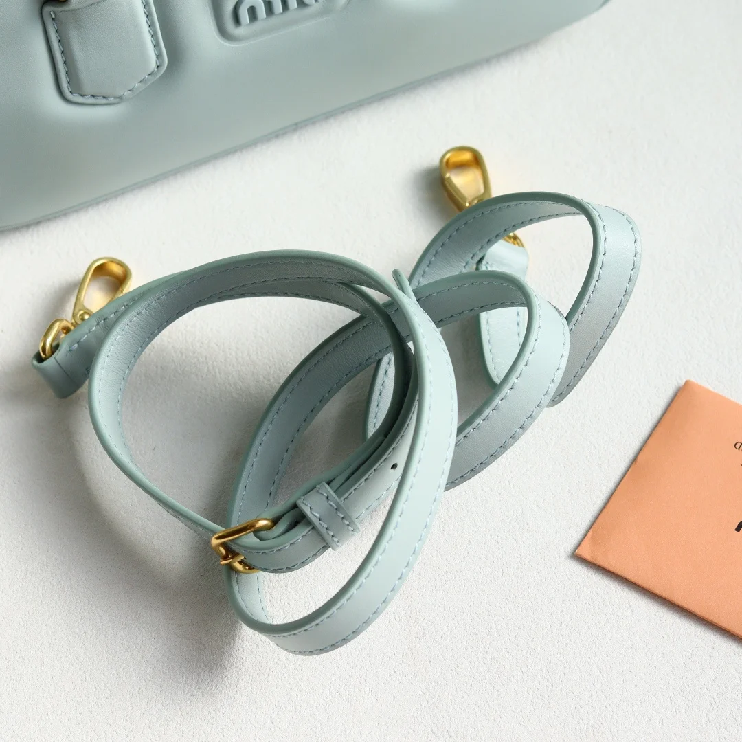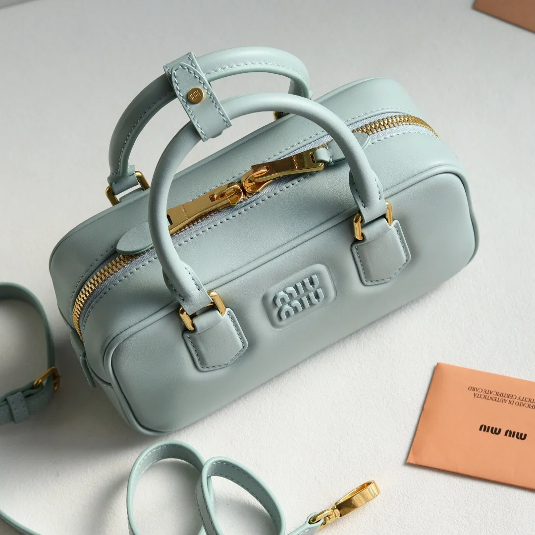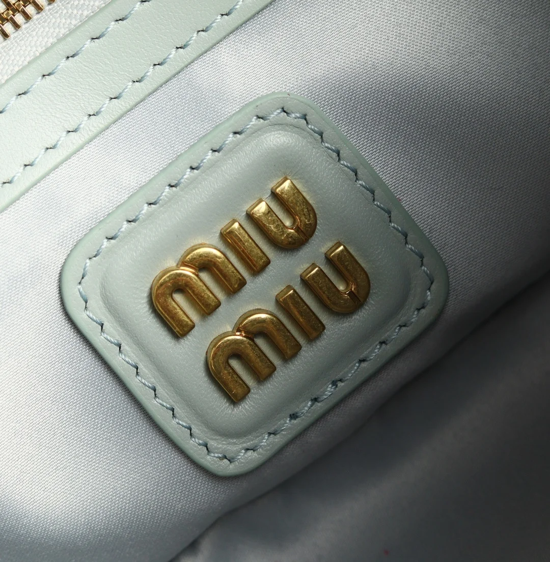 5BB142 Miu s new bowling bag, officially promoted on the website, is definitely a popular style this year. It is made of top-quality imported calfskin with Miu s unique Matelasse pattern. The bag is exquisitely three-dimensional and stylish. The front lettering logo echoes the leather color. It has a detachable and adjustable leather long shoulder strap, cotton satin lining, and a zippered pocket. Many celebrities and online influencers have the same style. The size is 22X10.5X7.5Cm, and it comes with original packaging.