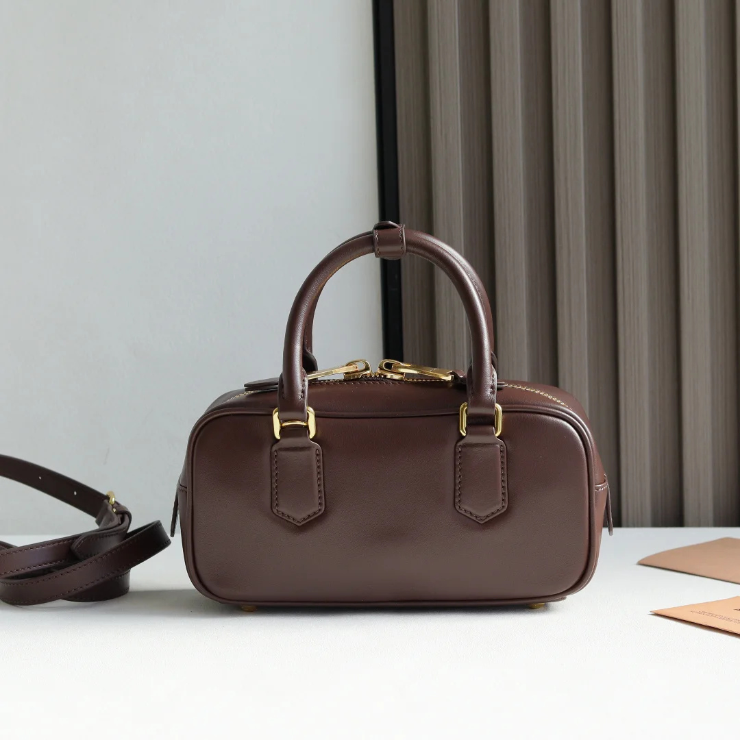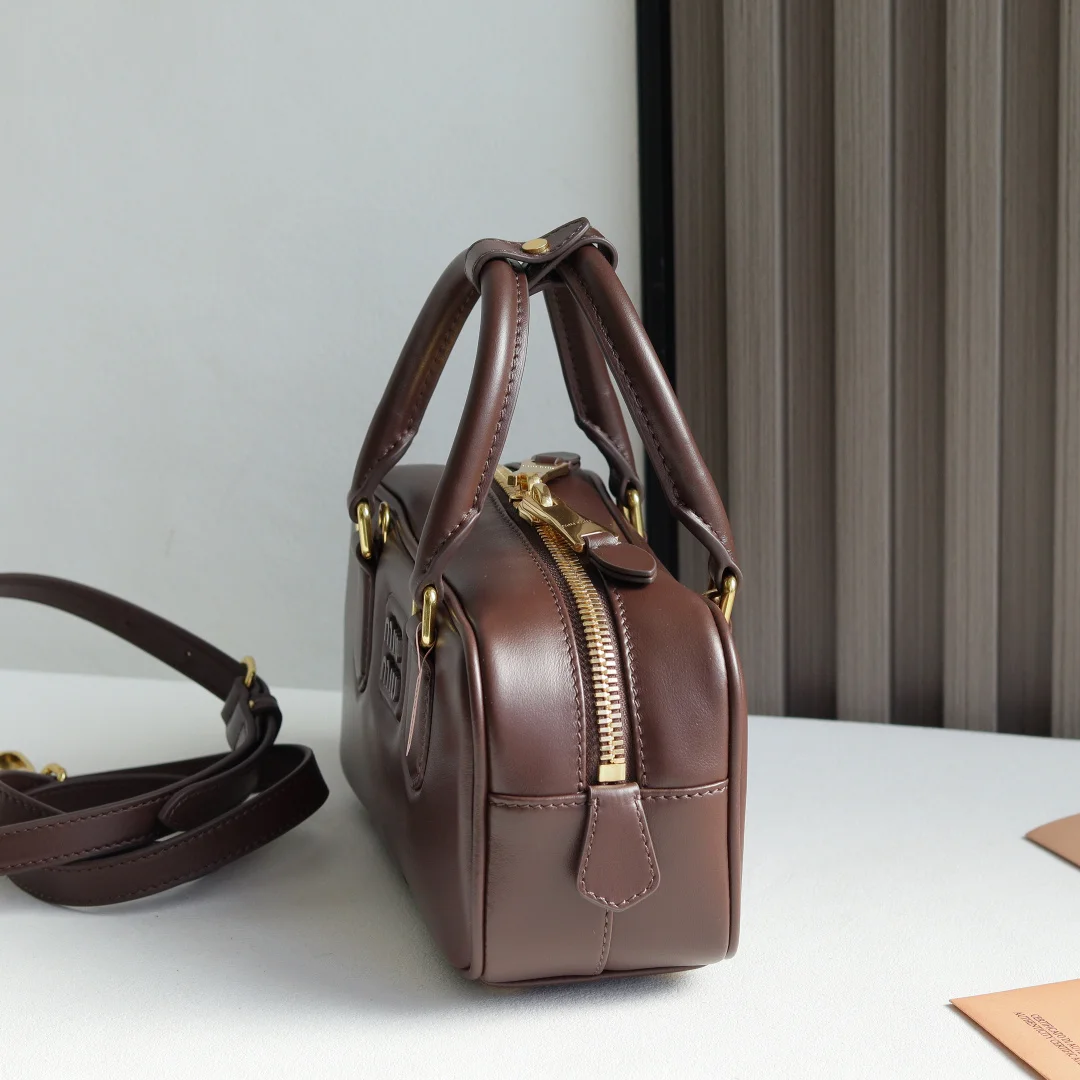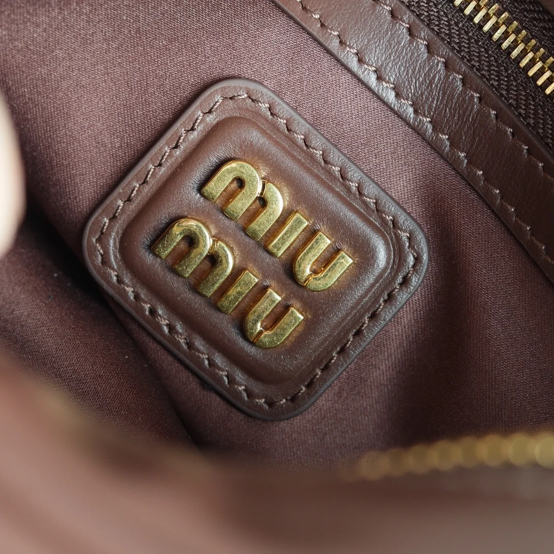 5BB142 Miu s new bowling bag, officially promoted, an absolute hit this year, top imported calfskin, Miu s unique Matelasse pattern, the bag is exquisite, three-dimensional and stylish, the front lettering logo echoes the leather color, detachable and adjustable leather long shoulder strap, cotton satin lining, with a zipper pocket, the same style as many celebrities and influencers, size 22X10.5X7.5Cm, with original packaging