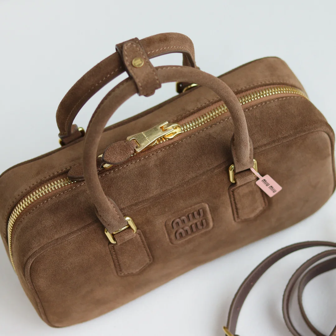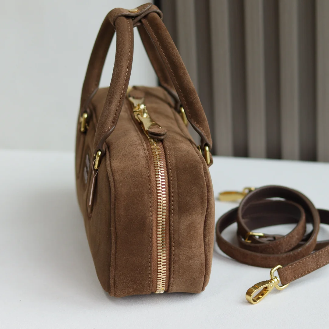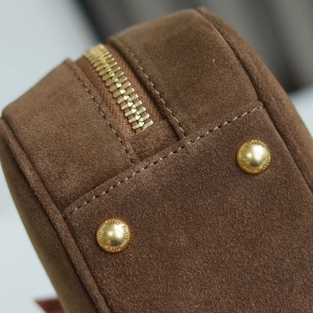 5BB148 Miu s new bowling bag, featuring the popular suede element of this autumn and winter, made of top-quality first-layer suede calfskin. The bag is exquisitely three-dimensional and stylish, with an embossed logo on the front that echoes the leather color. It comes with a detachable and adjustable leather long shoulder strap, a new canvas lining, and a zippered pocket. Many celebrities and influencers have the same style. Dimensions: 27X12X9Cm. Comes with original packaging.