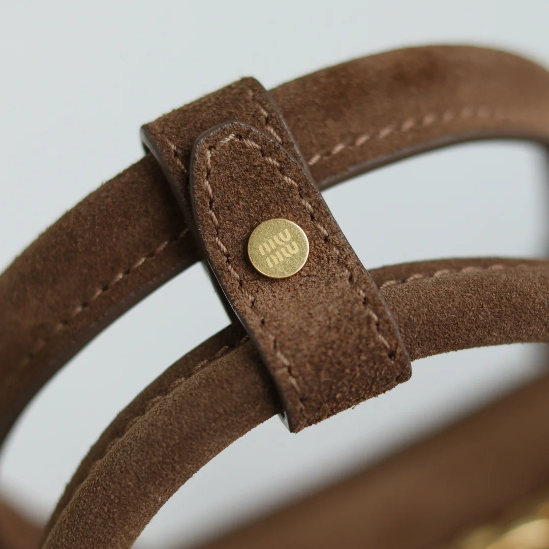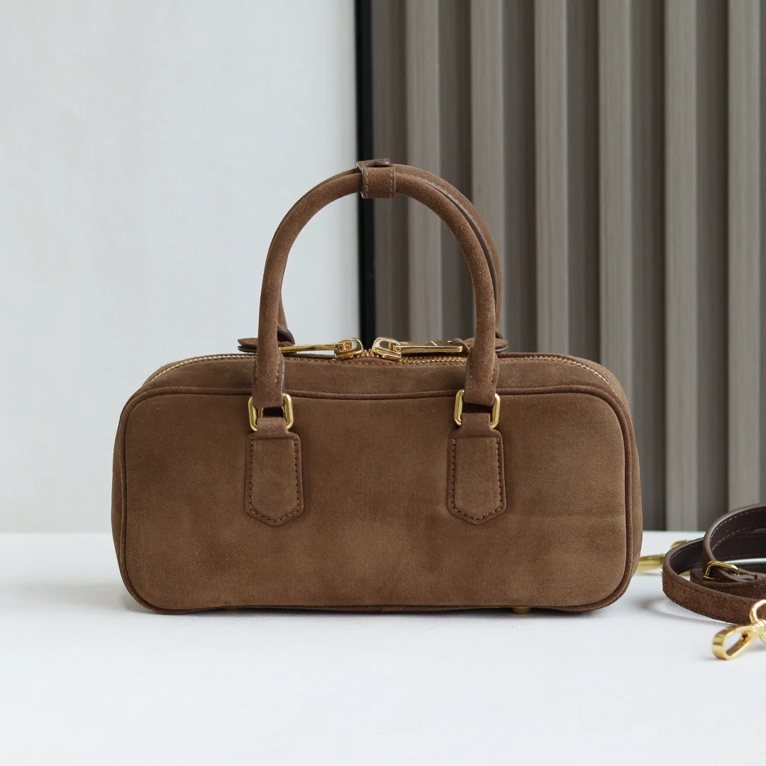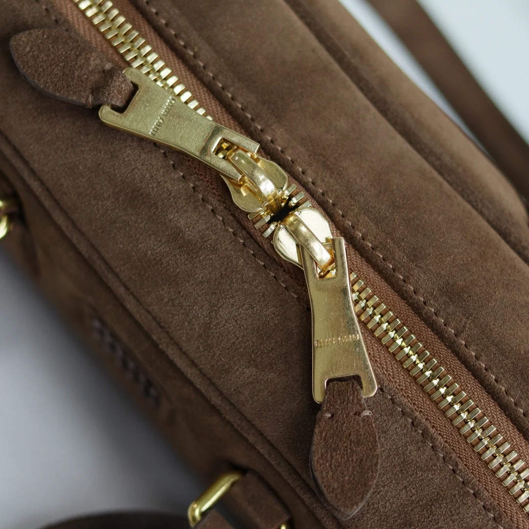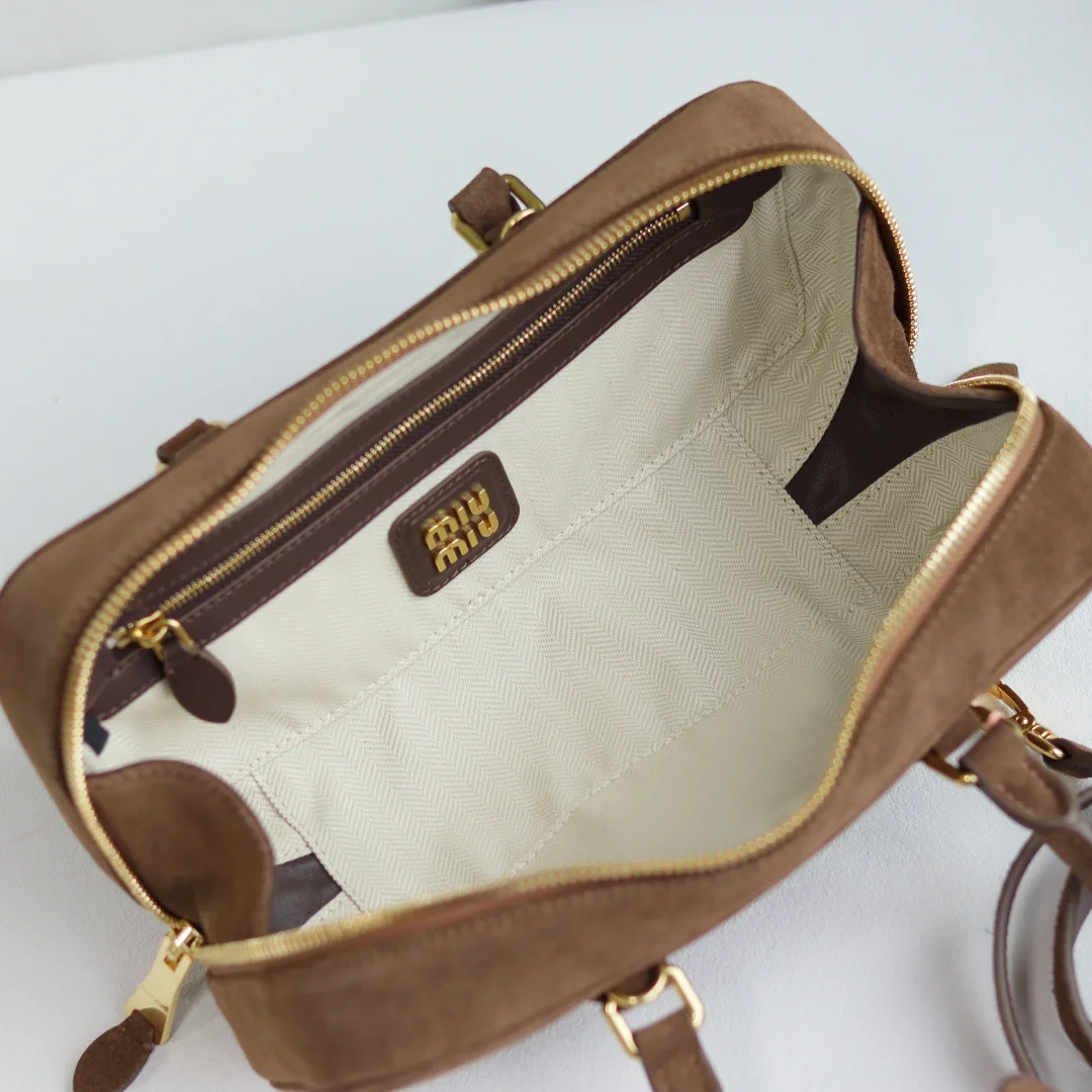 5BB148 Miu s new bowling bag, featuring the popular suede element of this autumn and winter, made of top-quality first-layer suede calfskin. The bag is exquisitely three-dimensional and stylish, with an embossed logo on the front that echoes the leather color. It comes with a detachable and adjustable leather long shoulder strap, a new canvas lining, and a zippered pocket. Many celebrities and influencers have the same style. Dimensions: 27X12X9Cm. Comes with original packaging.