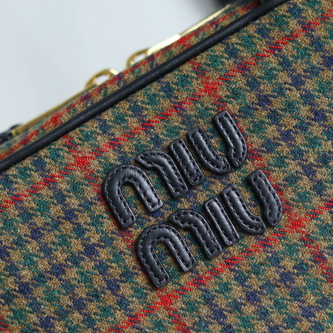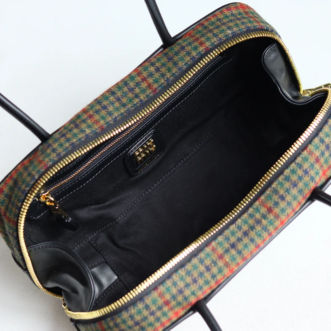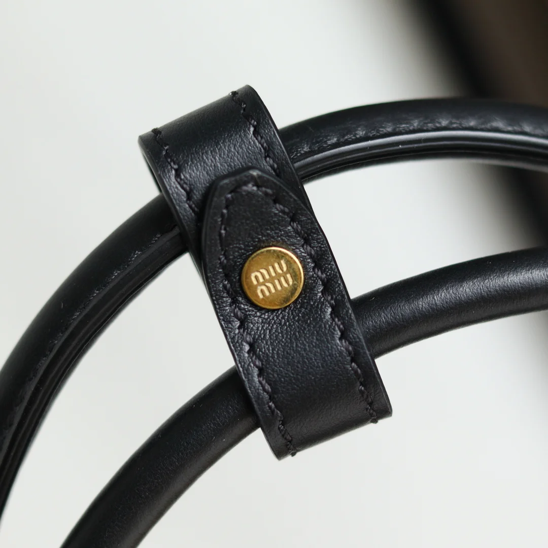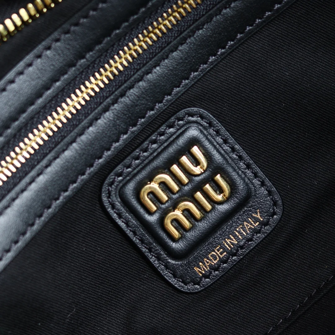 Top Grade Original Leather Miu s new 5BB173 bowling bag in canvas, crafted from new canvas fabric paired with premium smooth calfskin. The bold and innovative design perfectly embodies Miu s unconventional, free-spirited, and inclusive attitude towards life. This bag is cool, capturing the essence of sophisticated, multi-functional design, blending menswear and womenswear elements for a casual, laid-back, natural, and individualistic style. With a brand new canvas lining, its widespread popularity is well-deserved. It s loved by major fashion bloggers and celebrities alike. Dimensions: 28X12X9cm [Comes with a full set of original packaging]