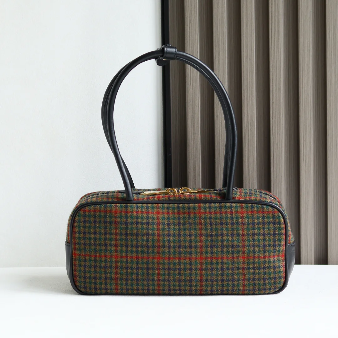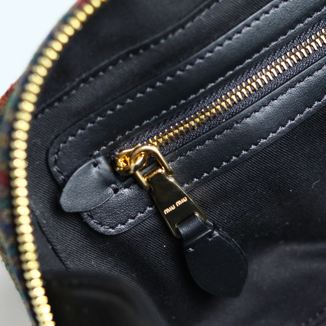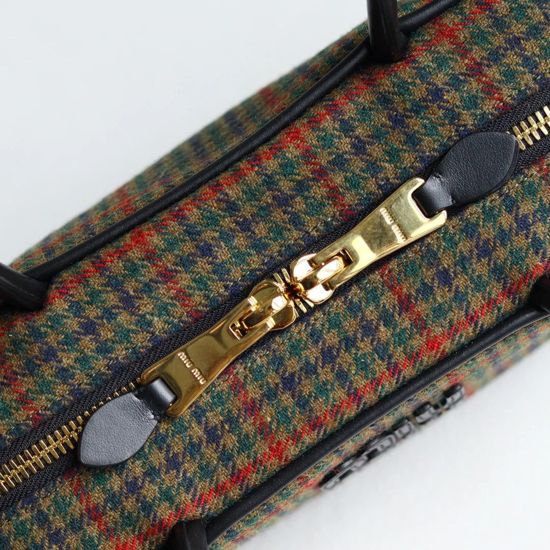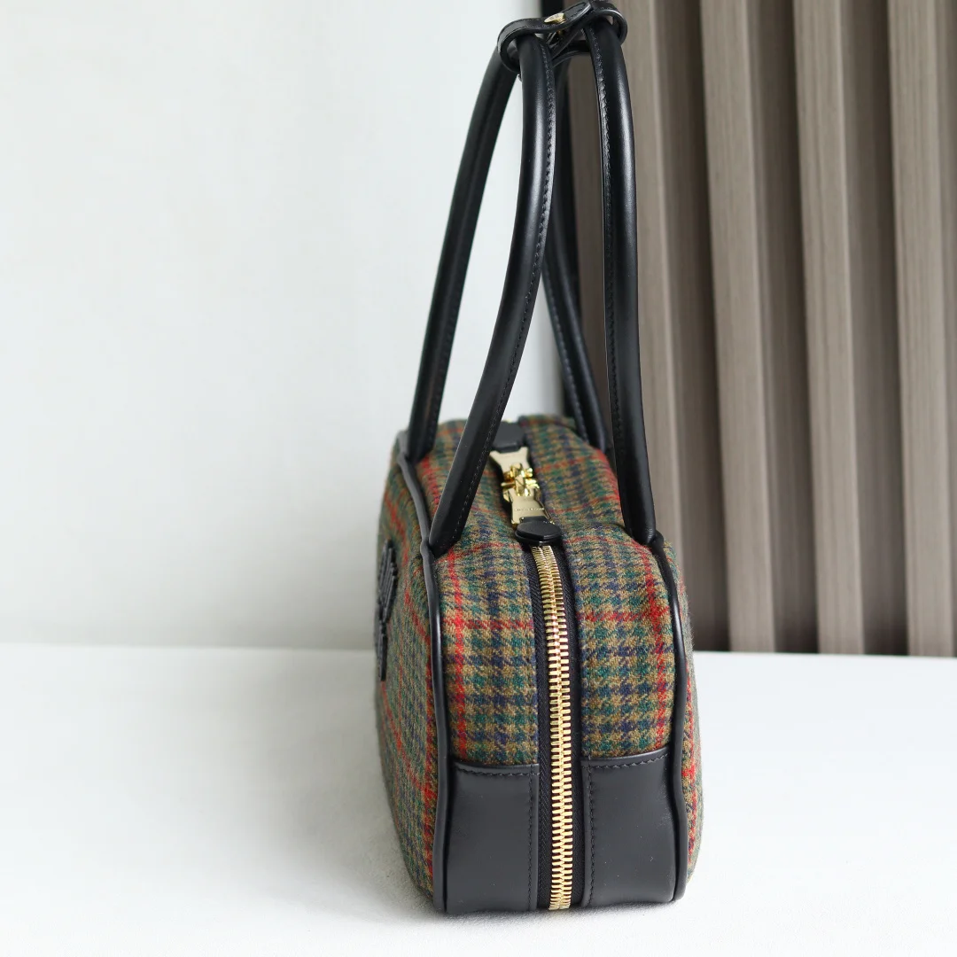Top Grade Original Leather Miu s new 5BB173 bowling bag in canvas, crafted from new canvas fabric paired with premium smooth calfskin. The bold and innovative design perfectly embodies Miu s unconventional, free-spirited, and inclusive attitude towards life. This bag is cool, capturing the essence of sophisticated, multi-functional design, blending menswear and womenswear elements for a casual, laid-back, natural, and individualistic style. With a brand new canvas lining, its widespread popularity is well-deserved. It s loved by major fashion bloggers and celebrities alike. Dimensions: 28X12X9cm [Comes with a full set of original packaging]