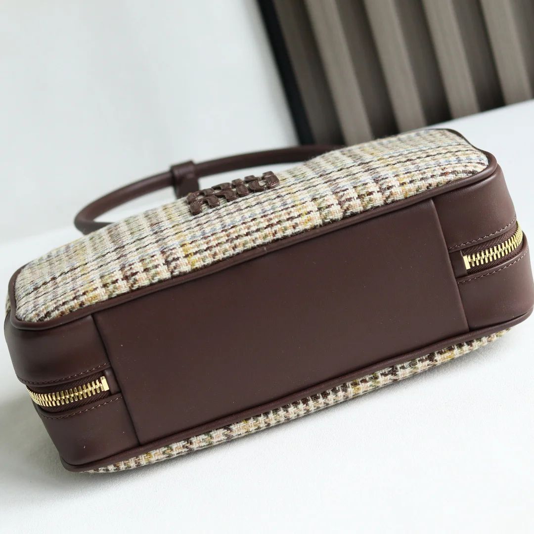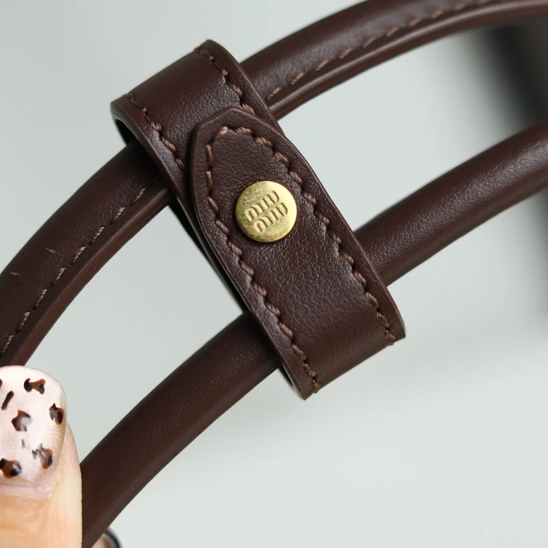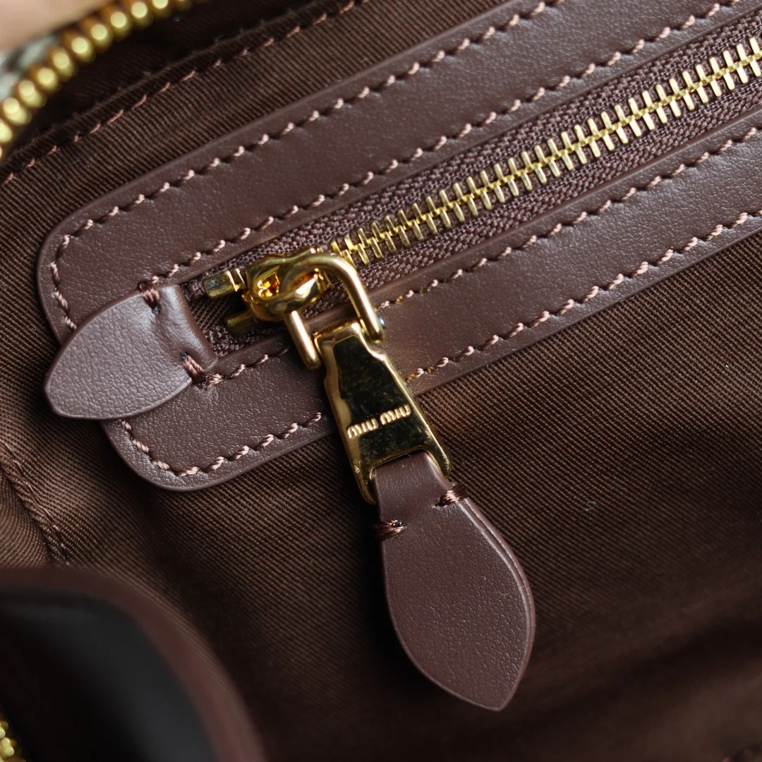 Top Grade Original Leather Miu s new 5BB173 bowling bag in canvas, crafted from new canvas fabric paired with premium smooth calfskin. The bold and innovative design perfectly embodies Miu s unconventional, free-spirited, and inclusive attitude towards life. This bag is very cool, capturing the essence of sophisticated, multi-functional design, blending menswear and womenswear elements for a casual, lazy, natural, and unrestrained feel, full of personality. The new canvas lining explains why it s so popular online, loved by major fashion bloggers and celebrities alike. Dimensions: 28X12X9cm [Comes with a full set of original packaging]