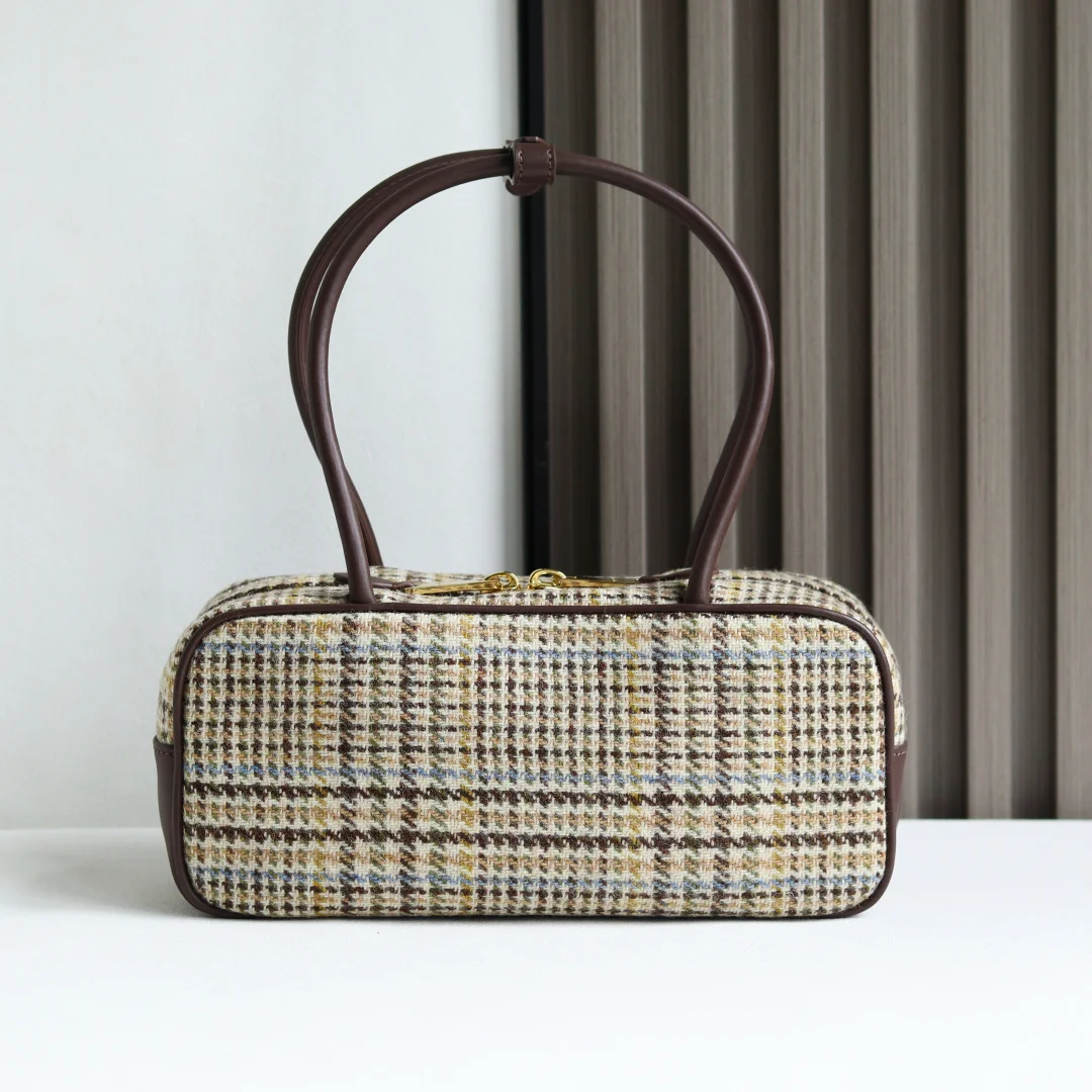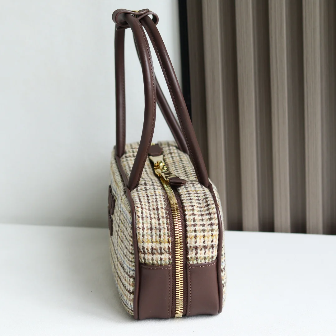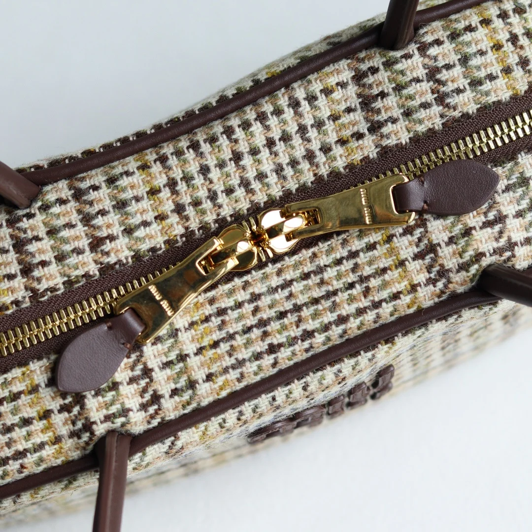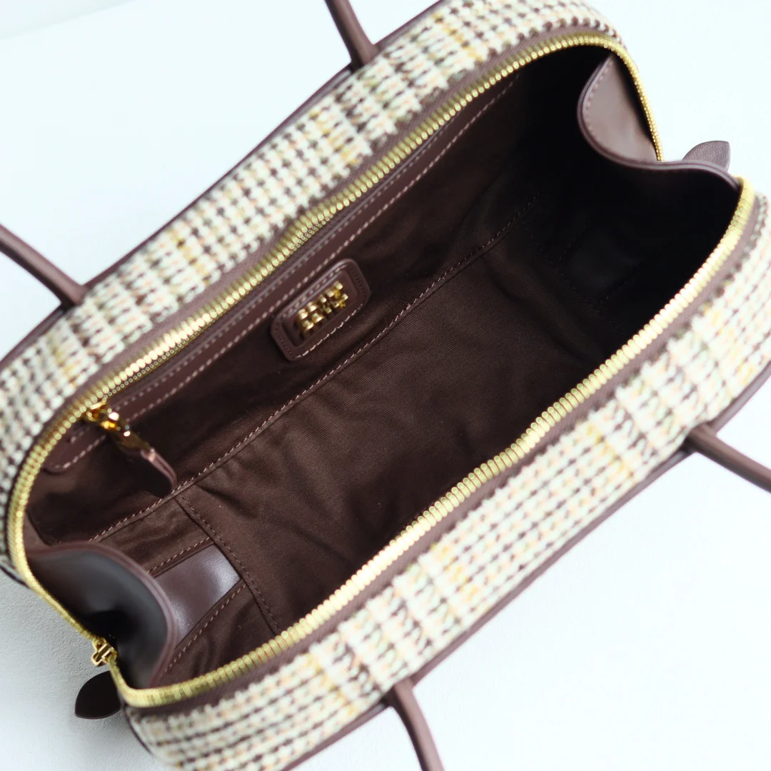 Top Grade Original Leather Miu s new 5BB173 bowling bag in canvas, crafted from new canvas fabric paired with premium smooth calfskin. The bold and innovative design perfectly embodies Miu s unconventional, free-spirited, and inclusive attitude towards life. This bag is very cool, capturing the essence of sophisticated, multi-functional design, blending menswear and womenswear elements for a casual, lazy, natural, and unrestrained feel, full of personality. The new canvas lining explains why it s so popular online, loved by major fashion bloggers and celebrities alike. Dimensions: 28X12X9cm [Comes with a full set of original packaging]