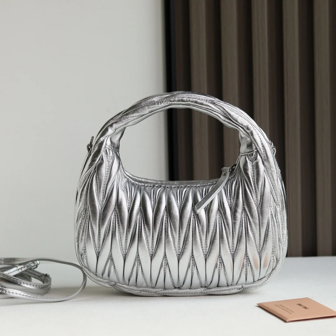 M House Model 5BC125: The MiuWander handbag features imported lambskin with the brand s iconic Matelasse embroidery, vintage brushed hardware, and a rounded curve design that retains its playful charm. The bag s overall shape is structured and stylish, full of personality, and versatile for both sweet and edgy looks. It has ample capacity and is a must-have for fashion bloggers. Available in various colors. Dimensions: 23X13X7, comes with original packaging.
