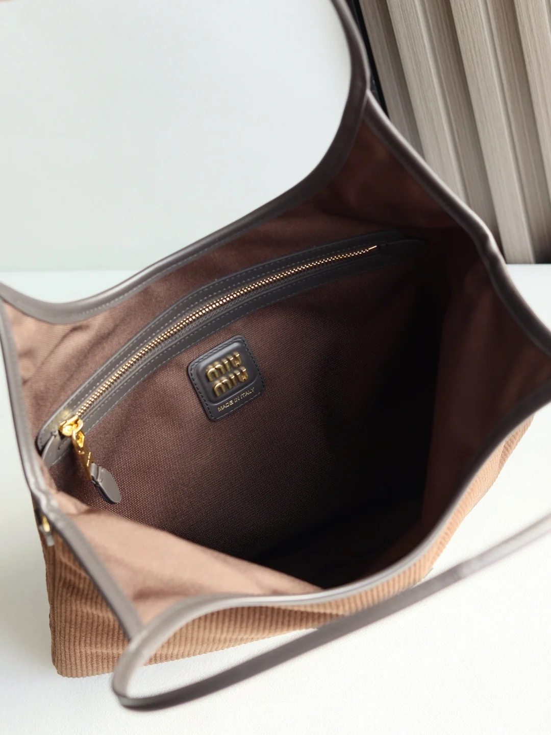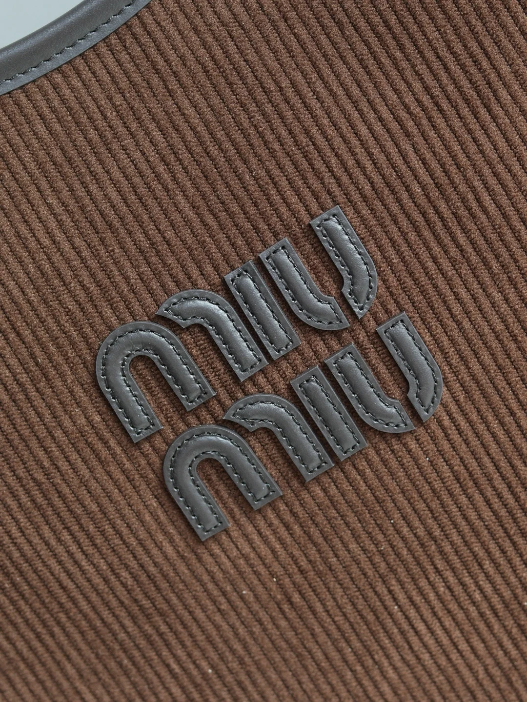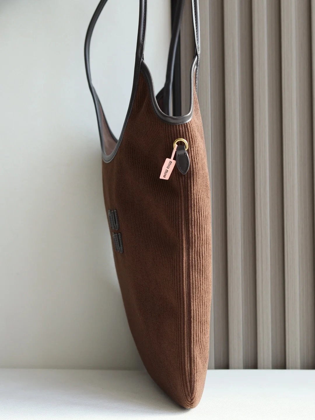 The new 5BG231Miu Isetan exclusive tote bag is definitely a hot item this year. It features a brand new limited edition corduroy material with a high-quality feel. The bag is soft yet maintains its shape, exuding a casual and relaxed vibe. With an oversized capacity, it looks great with any outfit, ensuring a 100% return rate when you carry it out. It has a handcrafted leather logo, and the interior is made of new linen fabric, complete with a zippered pocket. Dimensions are 35 X 40 cm.