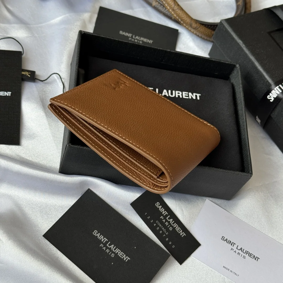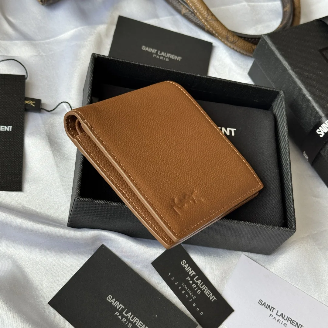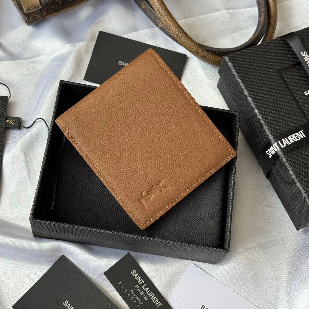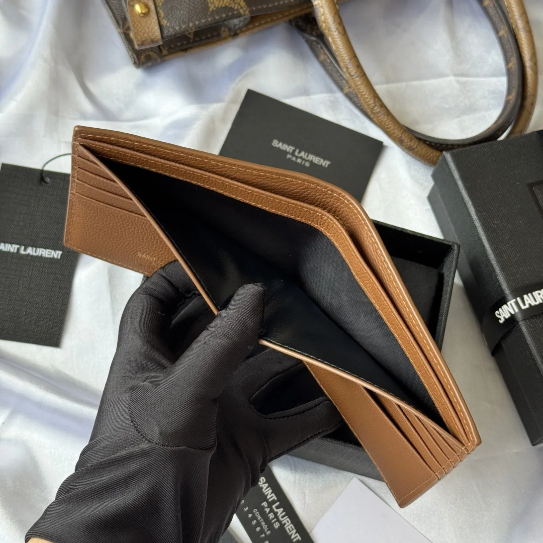 YSL 2025 Autumn Winter New Men s Bag, featuring an interior that can hold cards and large bills. Made of litchi grain cowhide, this MONOGRAM bifold wallet is adorned with embossed lettering and logo. Interior: two bill compartments, eight card slots, and two receipt compartments. Model: 607727. Litchi grain cowhide, embossed. Dimensions: 11*9.5*2.5 cm.