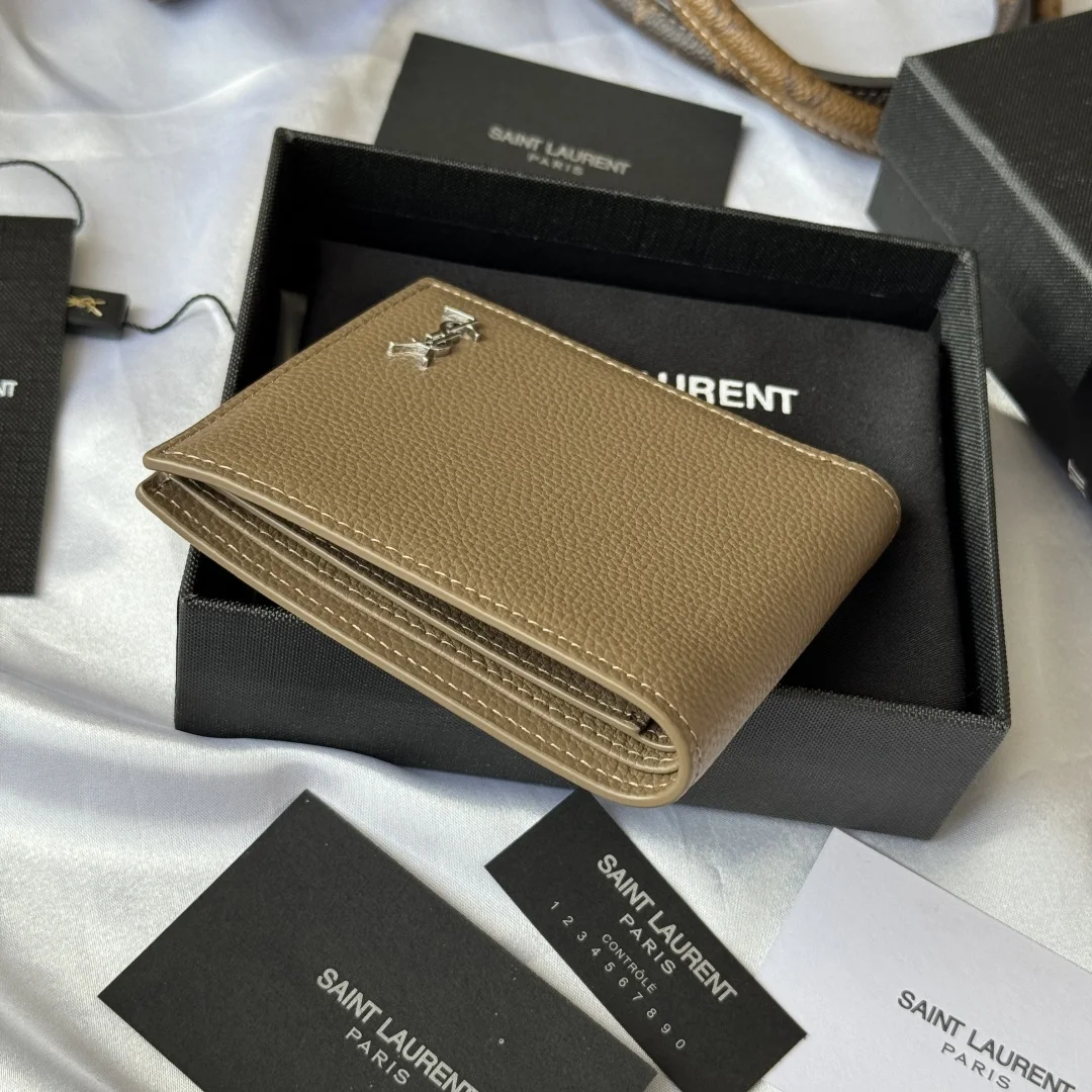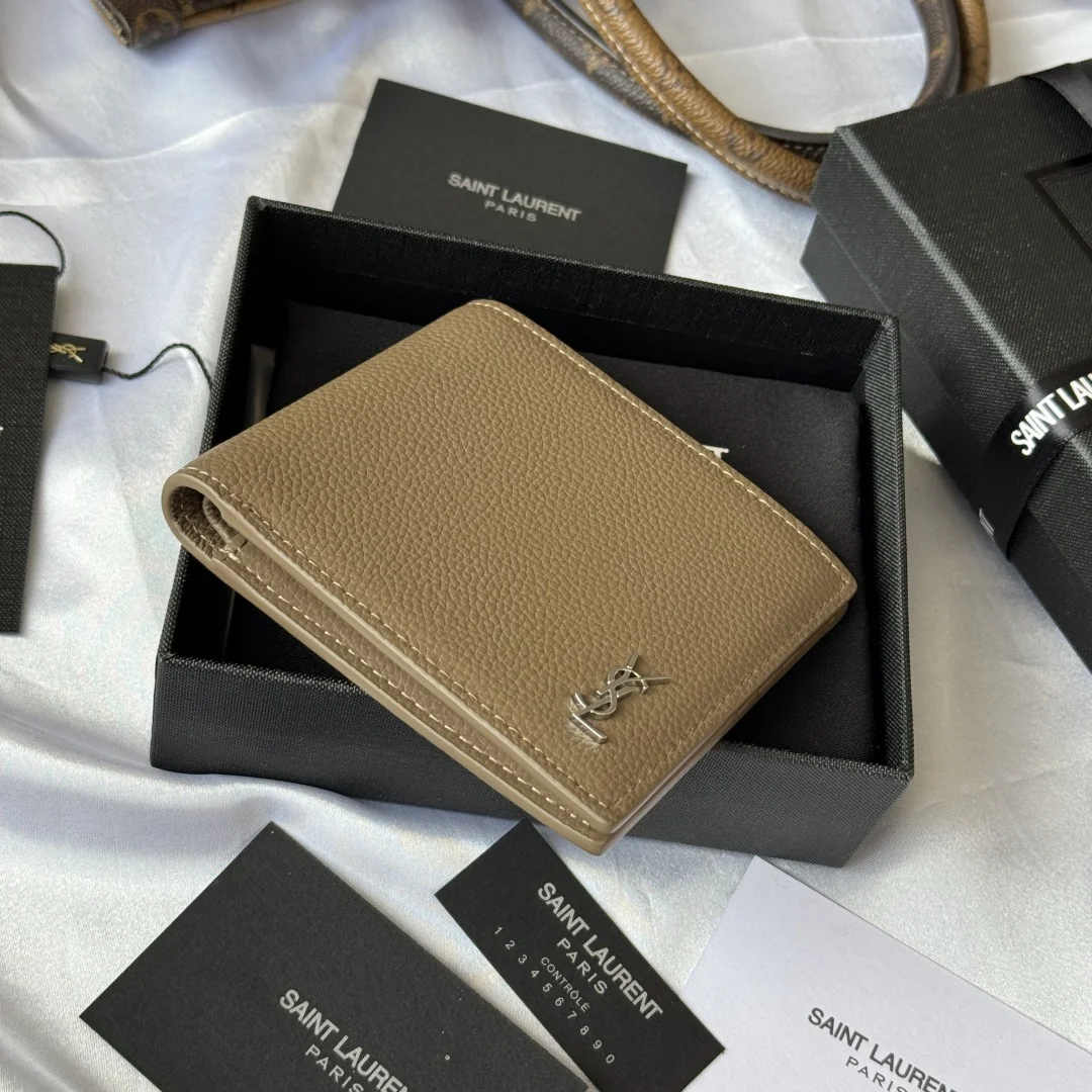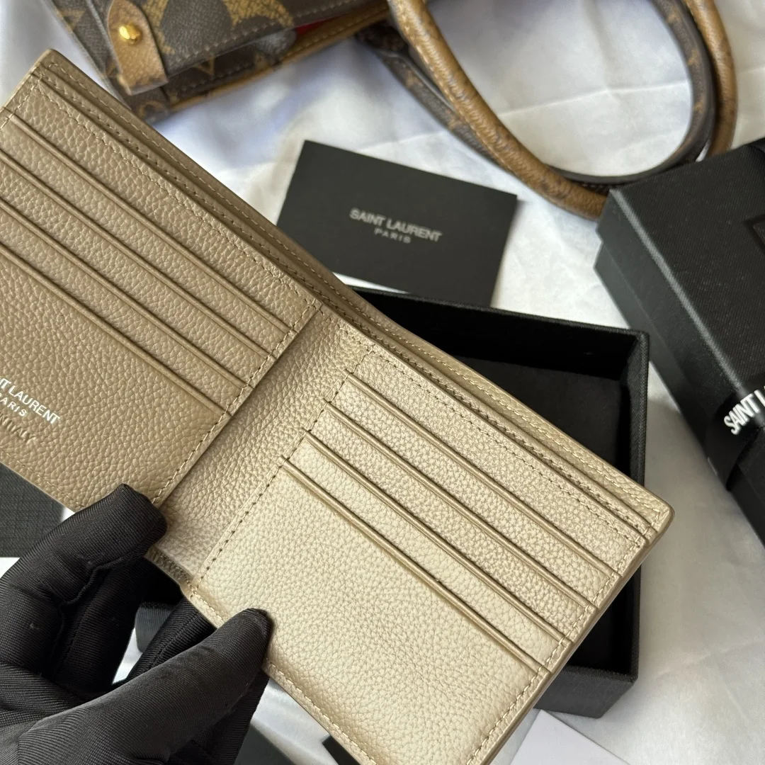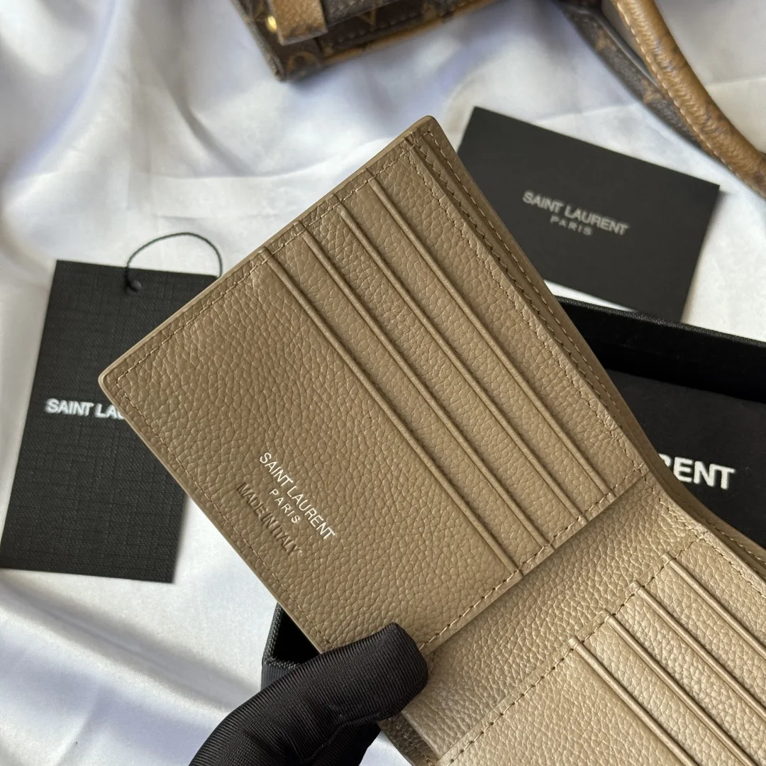YSL Fall Winter 2025 New Arrivals, Men s Wallet. Interior features card slots and bill compartments. MONOGRAM bi-fold wallet in grained leather, adorned with metal YSL initials. Interior: two bill compartments, eight card slots, and two receipt compartments. Model: 607727. Hardware: metal. Dimensions: 11*9.5*2.5cm.