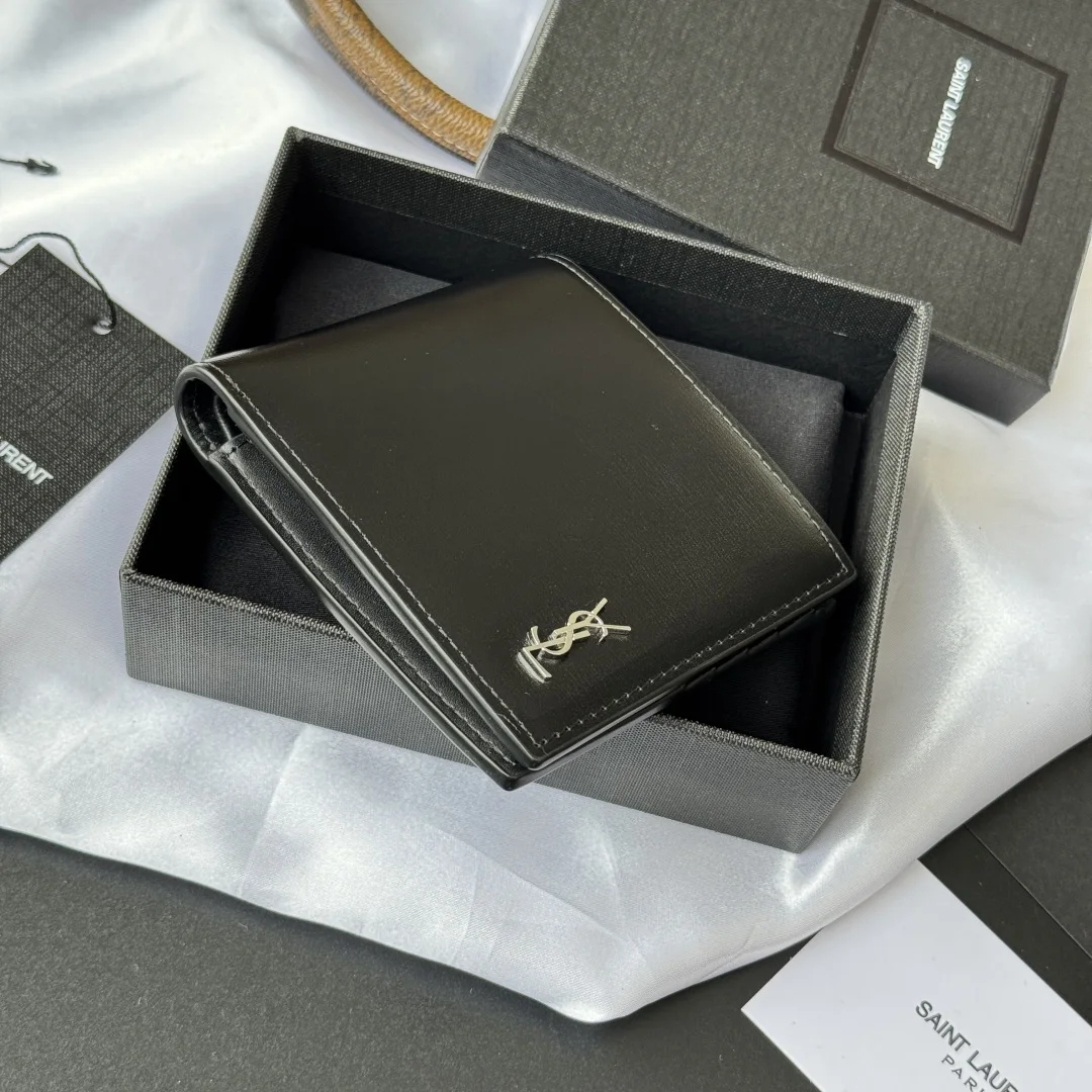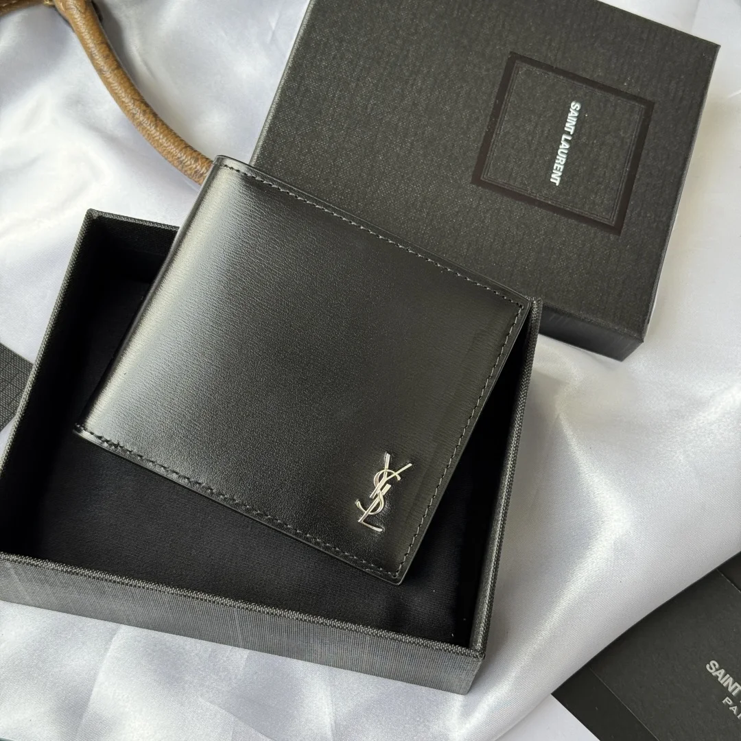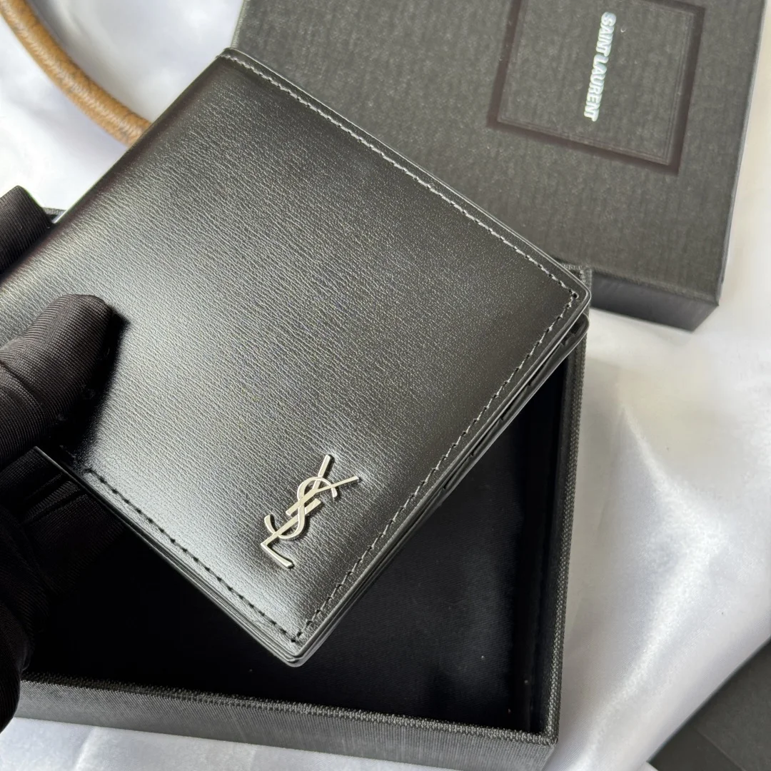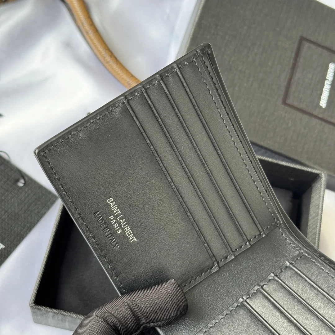YSL men s bag in black with a toothpick texture, featuring a leather interior that can hold cards and large bills. Made of leather, this MONOGRAM bifold wallet is adorned with a metal YSL logo. Interior: two bill compartments, eight card slots, and two receipt compartments. Model: 607727. Dimensions: 11*9.5*2.5cm.