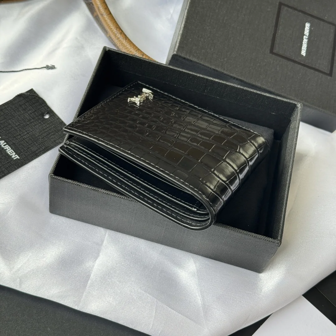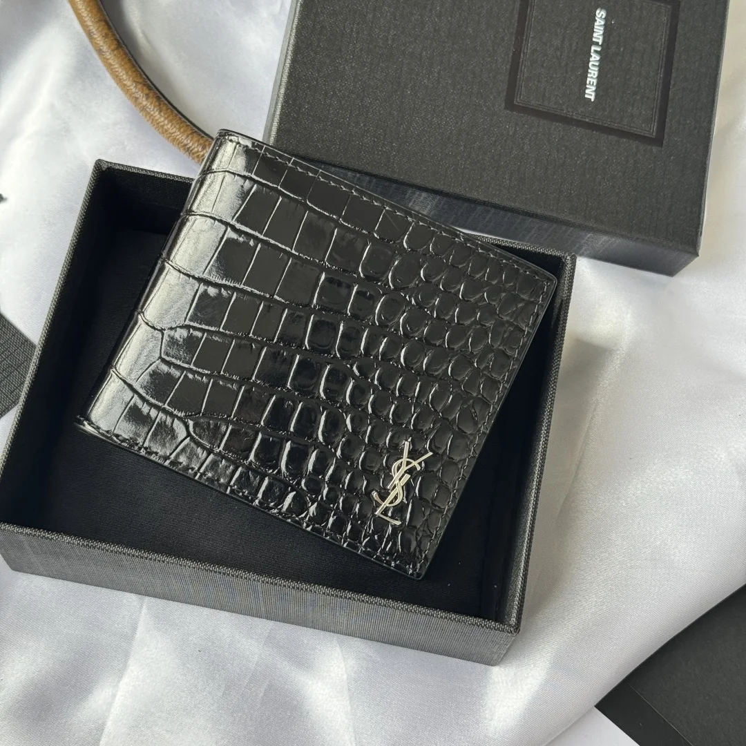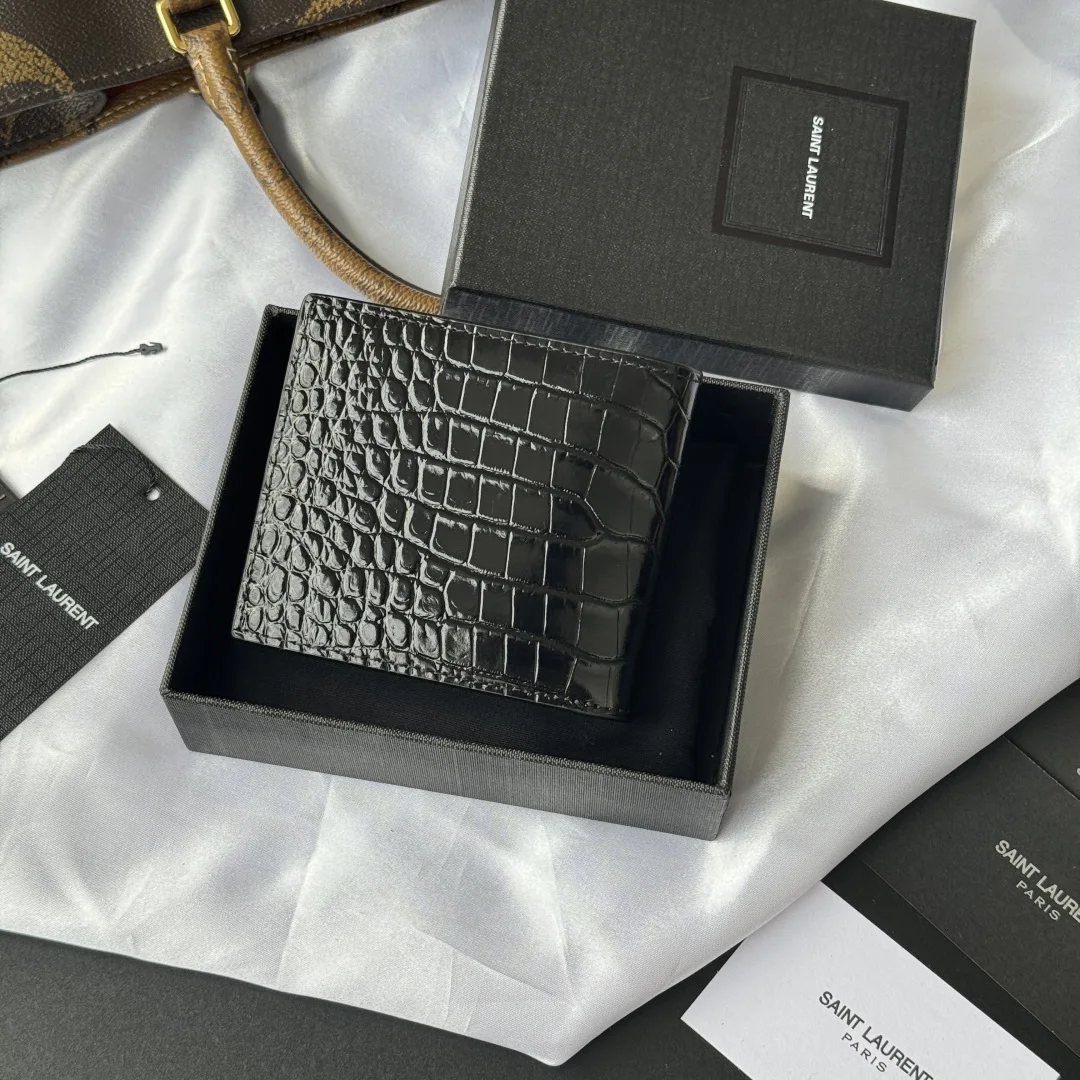 YSL men s black crocodile-embossed leather MONOGRAM bi-fold wallet with metal YSL signature. Interior: two bill compartments, eight card slots, and two receipt compartments. Model: 607727. Dimensions: 11*9.5*2.5cm.