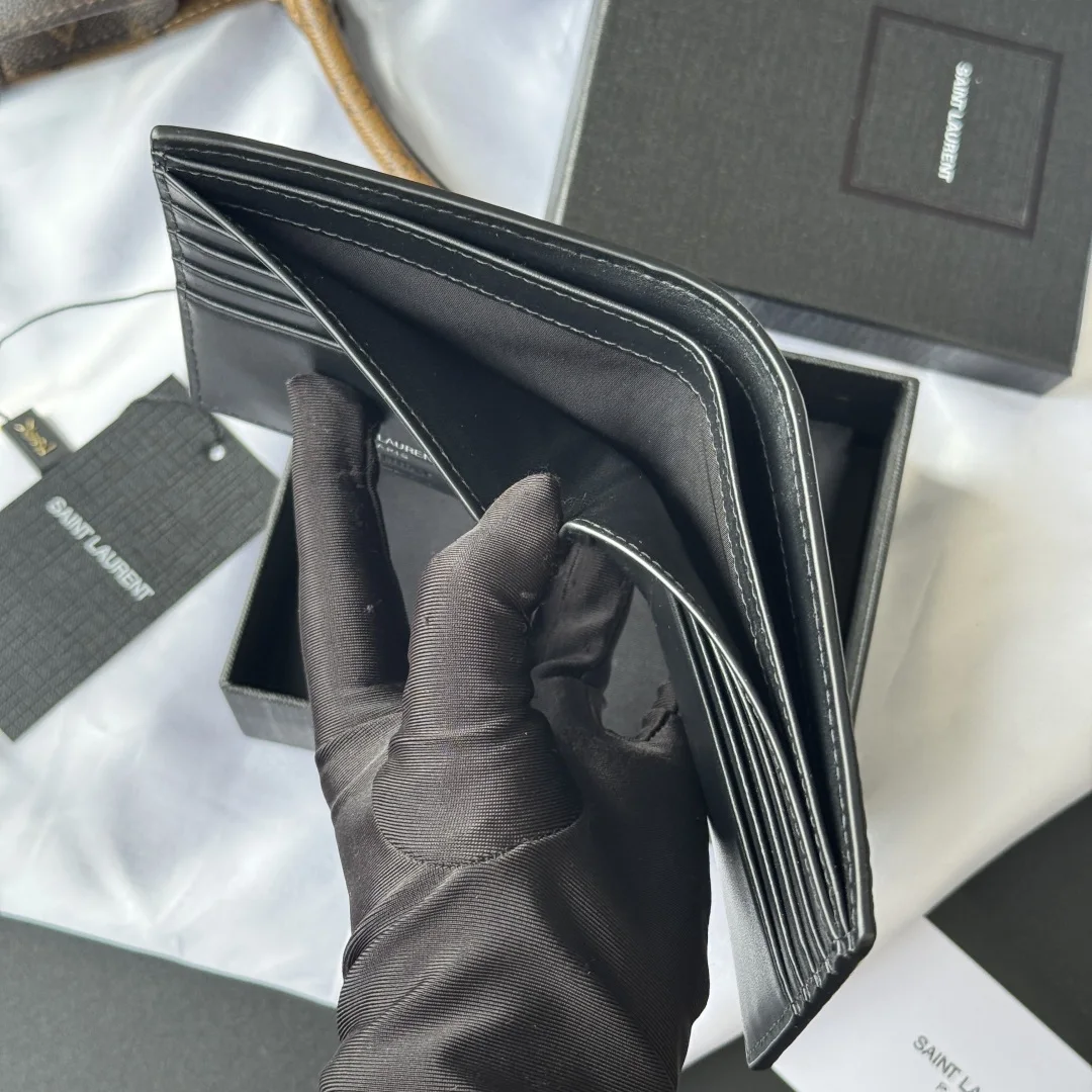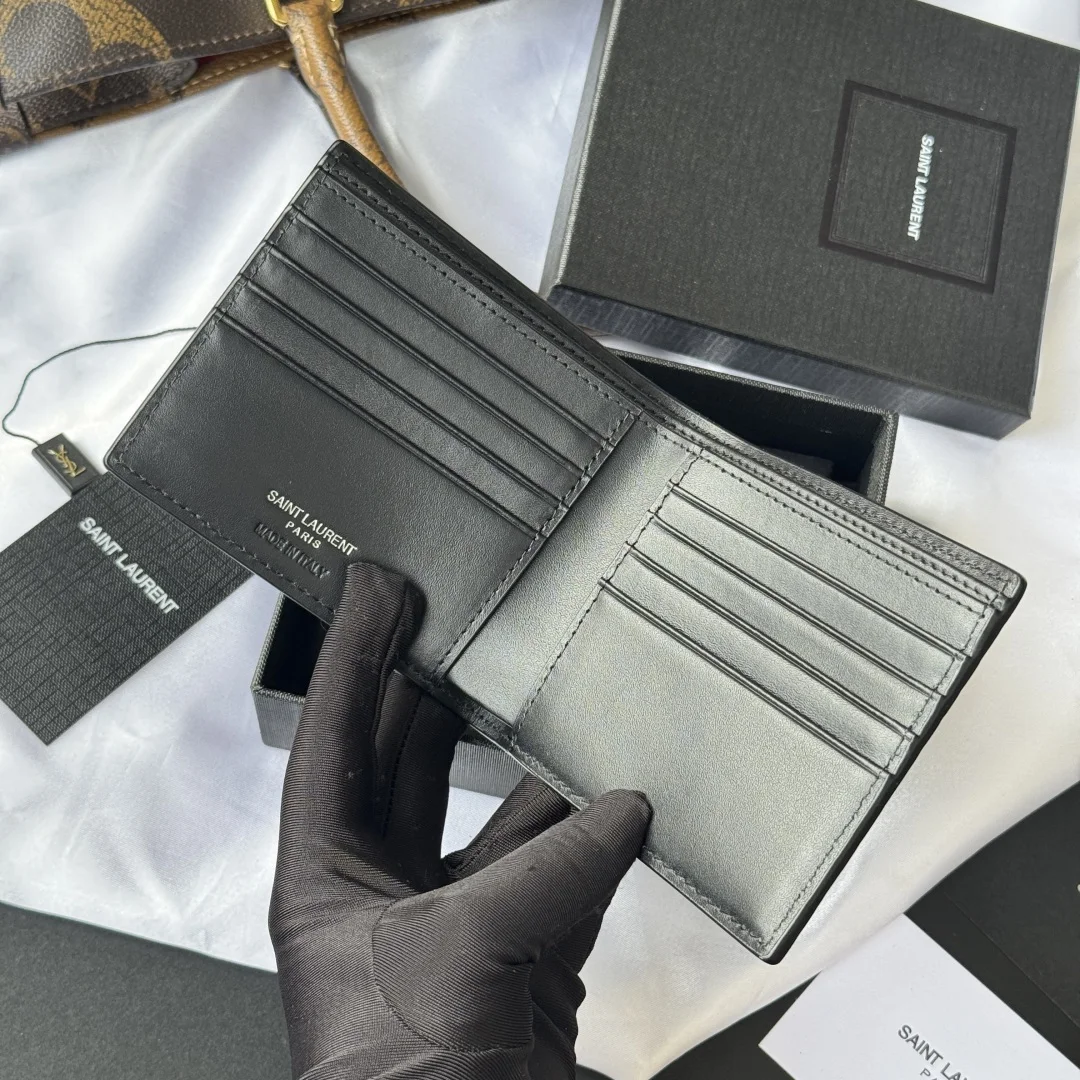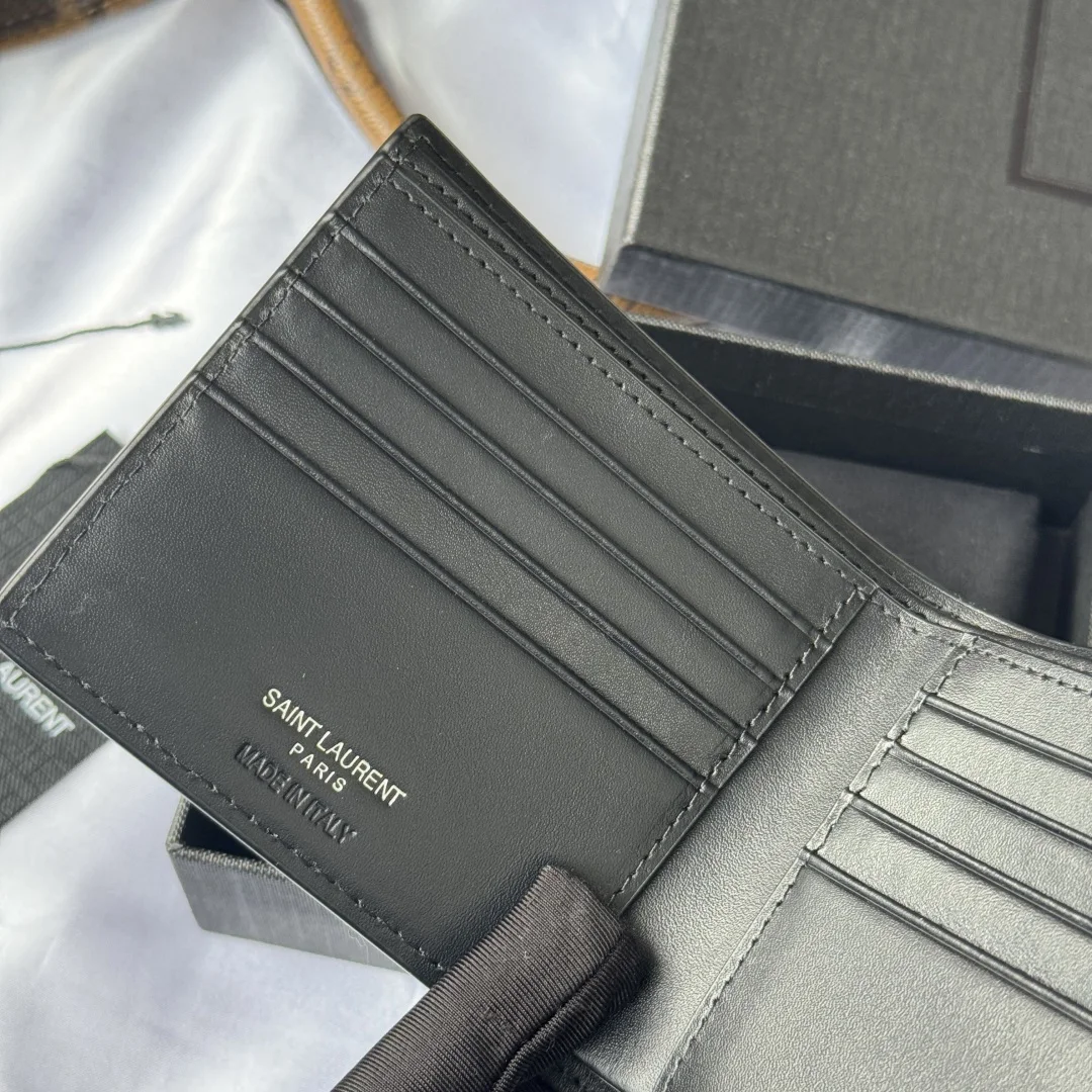 YSL men s black crocodile-embossed leather MONOGRAM bi-fold wallet with metal YSL signature. Interior: two bill compartments, eight card slots, and two receipt compartments. Model: 607727. Dimensions: 11*9.5*2.5cm.