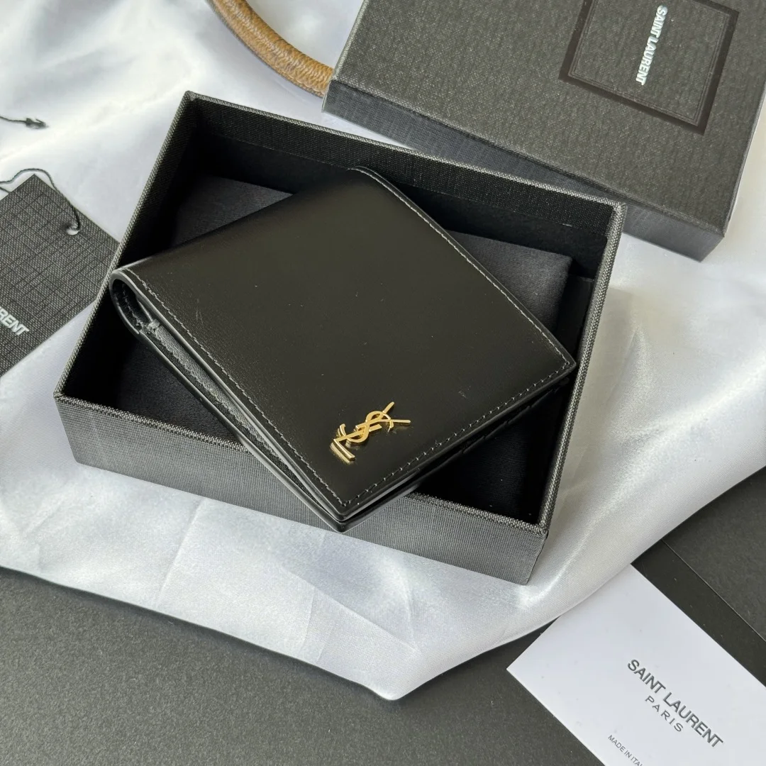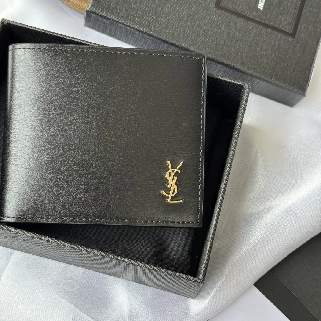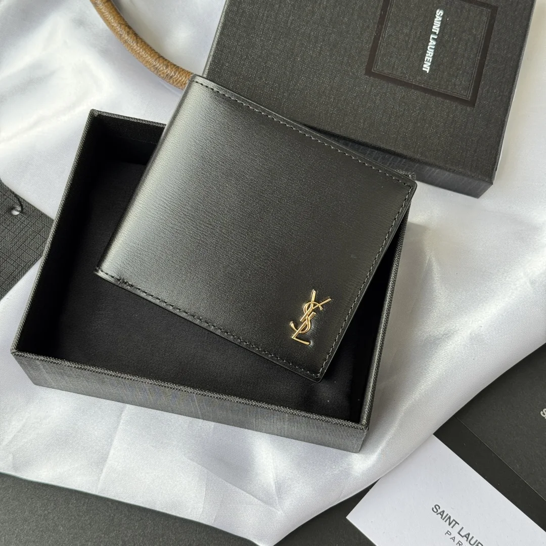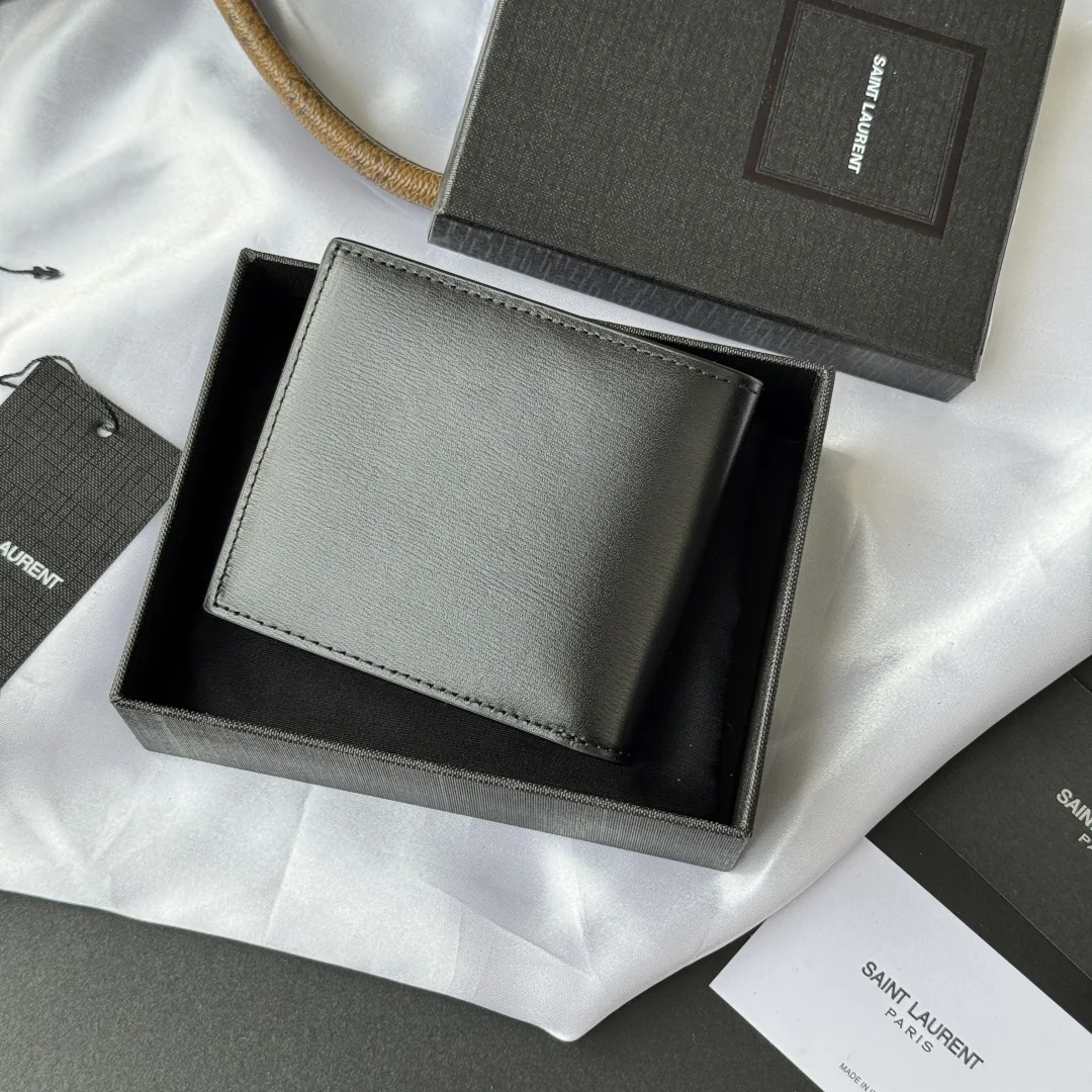 YSL Men s Bag in Black with Toothpick Pattern, made of cowhide with an interior that can hold cards and cash. This Monogram bifold wallet features a metallic YSL logo. Interior: two bill compartments, eight card slots, and two receipt compartments. Model: 607727. Dimensions: 11*9.5*2.5 cm.