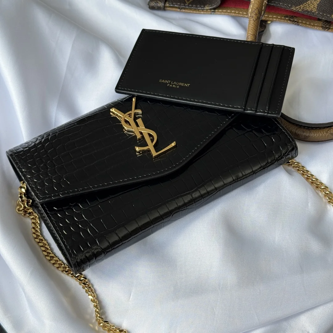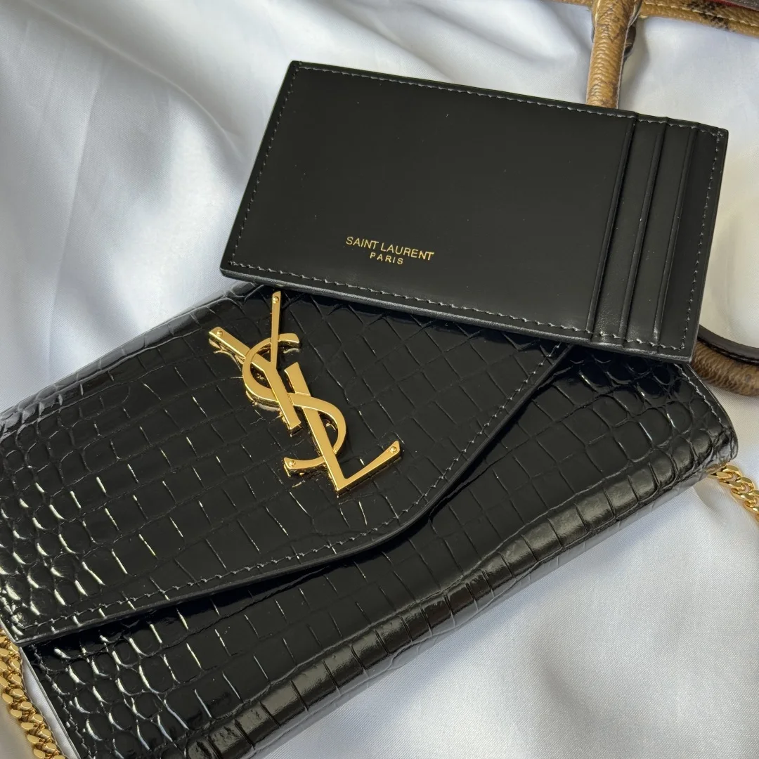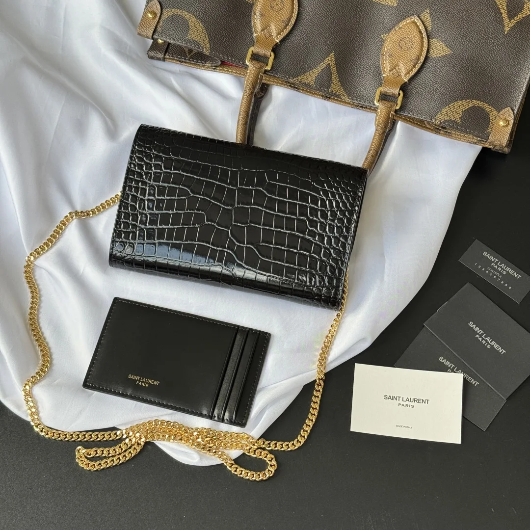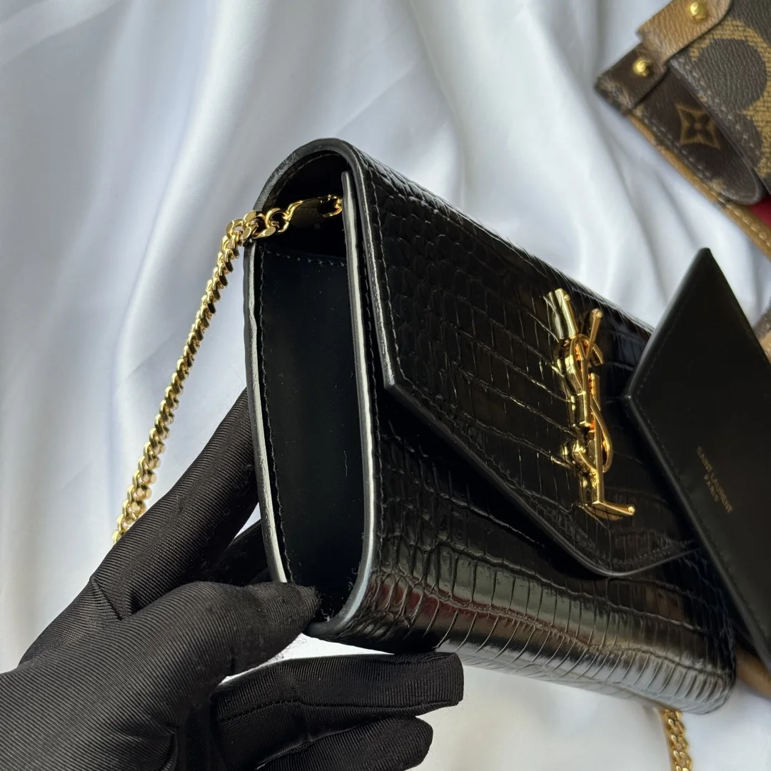 Uptown Mini Envelope Bag in Crocodile Embossed Leather featuring the iconic metal logo and a detachable chain shoulder strap, which can also be used as a clutch. This style also comes with a small cardholder that can hold 4-5 cards. Made with Italian imported calfskin leather, the shoulder strap measures 48cm. Despite its small size, it can hold up to three Plus-sized phones, making it 100% practical. Model: 607788. Dimensions: 19x12x4cm. Color as shown.