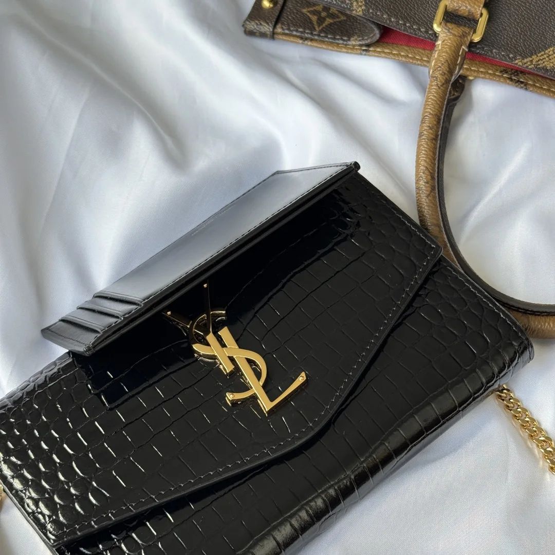 Uptown Mini Envelope Bag in Crocodile Embossed Leather featuring the iconic metal logo and a detachable chain shoulder strap, which can also be used as a clutch. This style also co..
