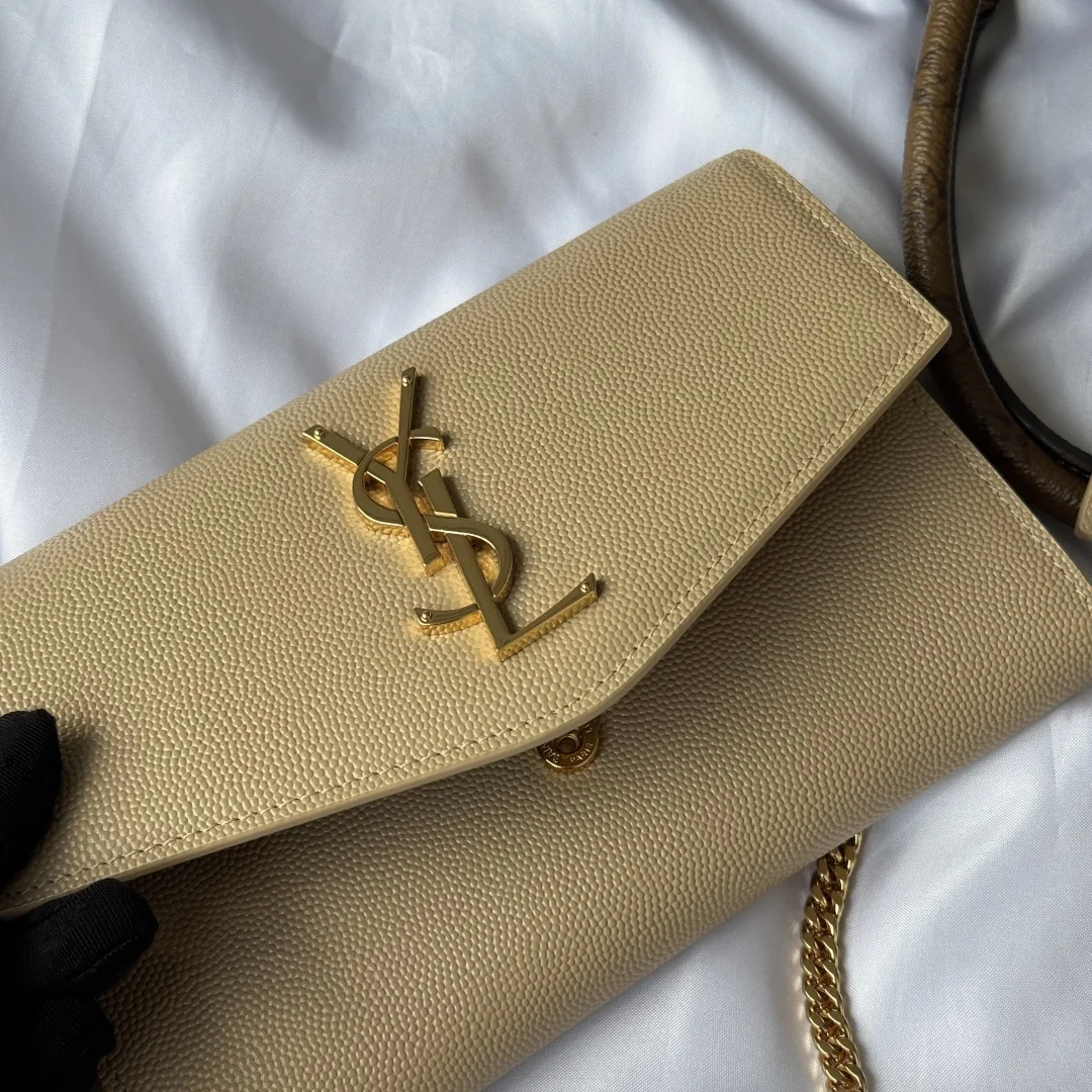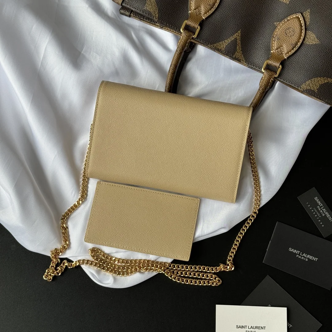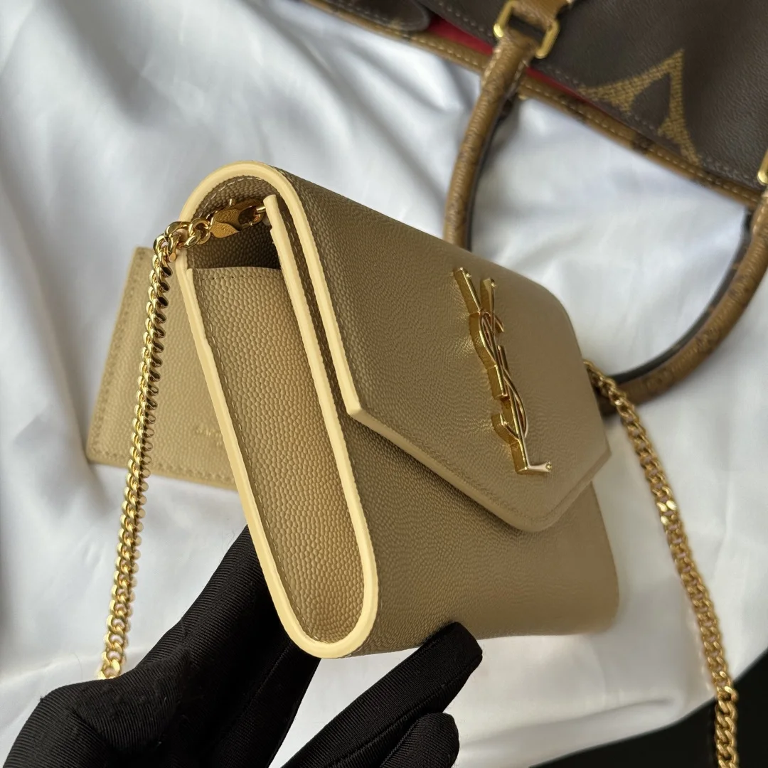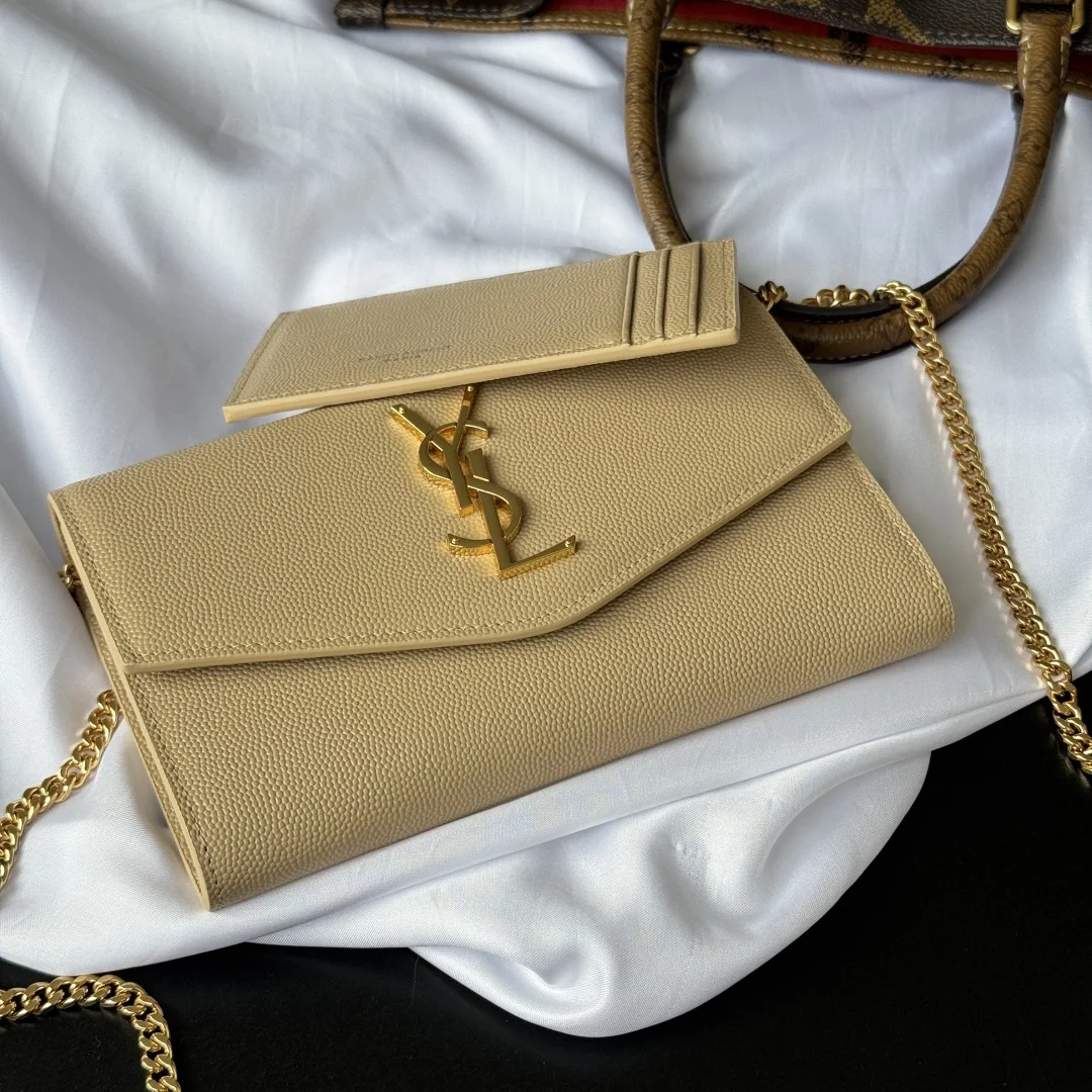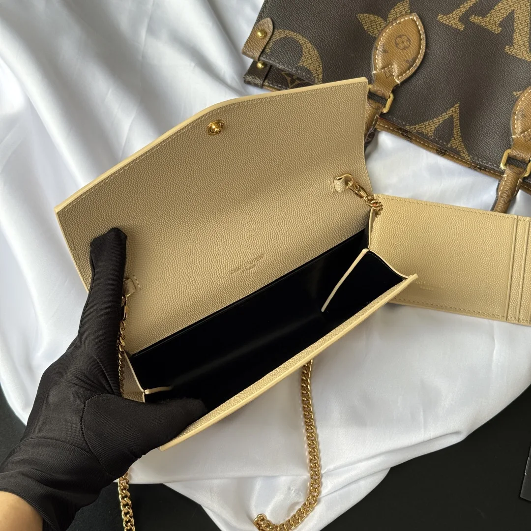 Uptown mini envelope bag in lychee-patterned cowhide features the most classic iconic metal logo, paired with a detachable chain shoulder strap, allowing it to be used as a clutch! This model also includes a small cardholder that can hold 4 to 5 cards without any issues! Made from imported Italian cowhide, the shoulder strap measures 48cm! Although small, it can fit 3 Plus-sized phones, ensuring 100% practicality! Model: 607788 Size: 19x12x4cm Color as shown.