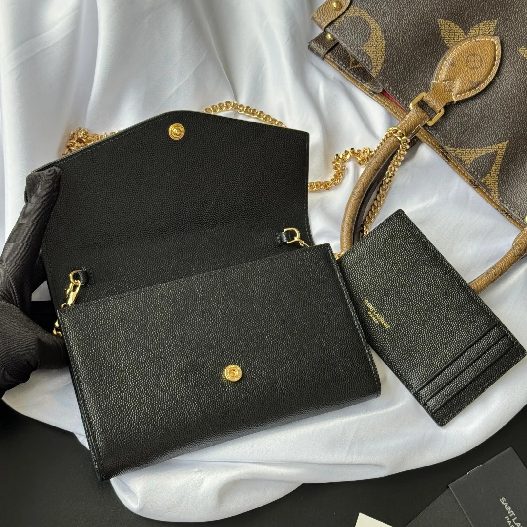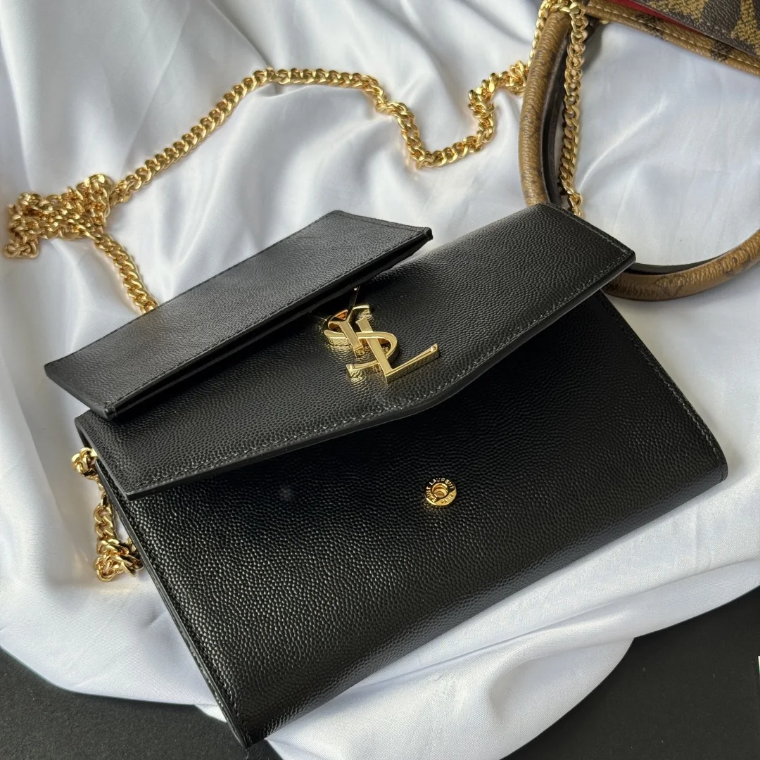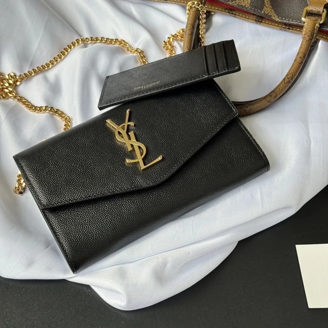 Uptown mini envelope bag in lychee-textured calfskin featuring the most classic and iconic metal logo, with a detachable chain shoulder strap, can be used directly as a clutch! This style also comes with a small card holder that can hold 4-5 cards! Made of Italian imported calfskin, with a 48cm shoulder strap! Although small, it can hold 3 Plus phones, making it 100% practical! Model: 607788. Dimensions: 19x12x4cm. Color as shown.