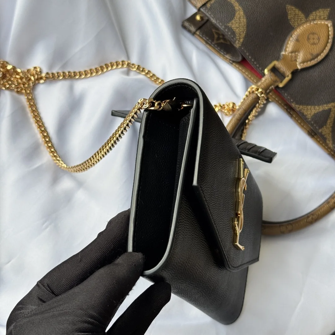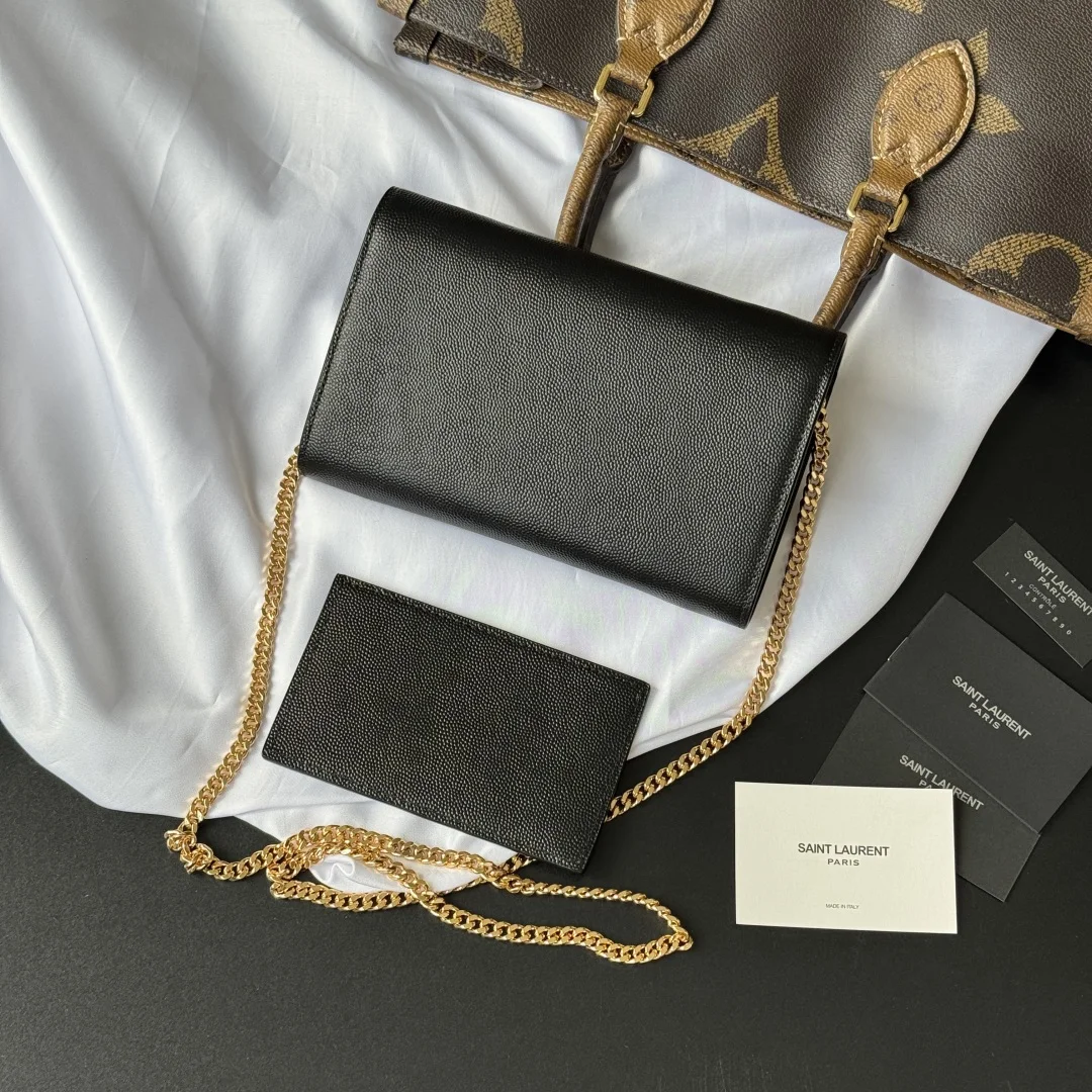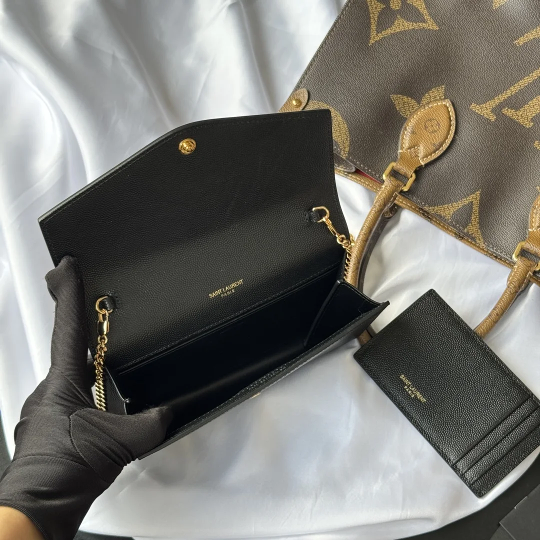Uptown mini envelope bag in lychee-textured calfskin featuring the most classic and iconic metal logo, with a detachable chain shoulder strap, can be used directly as a clutch! This style also comes with a small card holder that can hold 4-5 cards! Made of Italian imported calfskin, with a 48cm shoulder strap! Although small, it can hold 3 Plus phones, making it 100% practical! Model: 607788. Dimensions: 19x12x4cm. Color as shown.