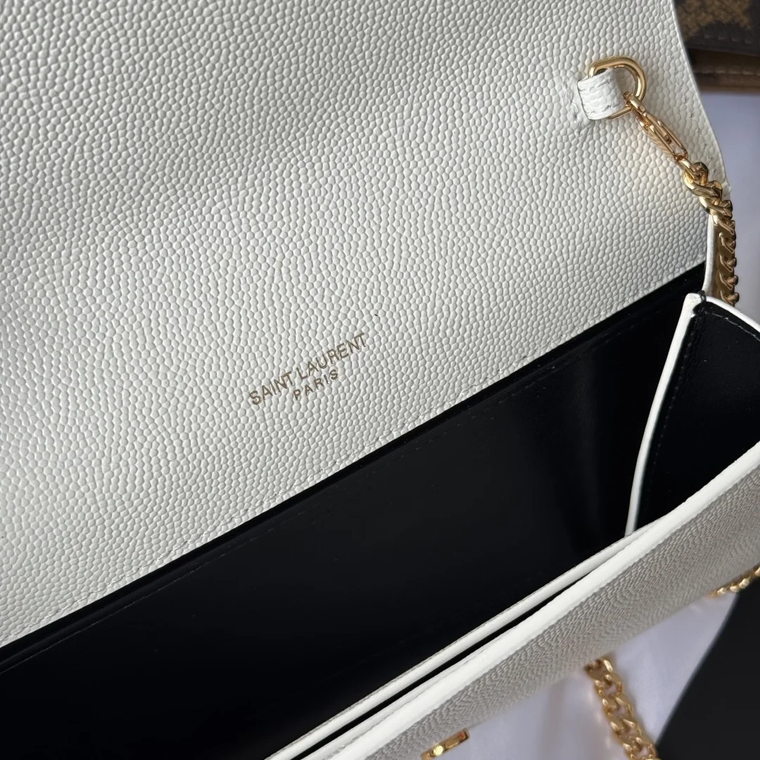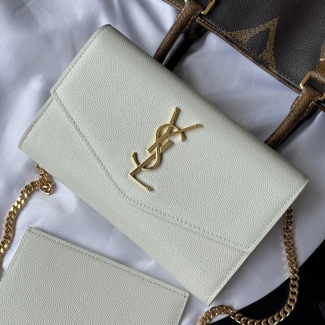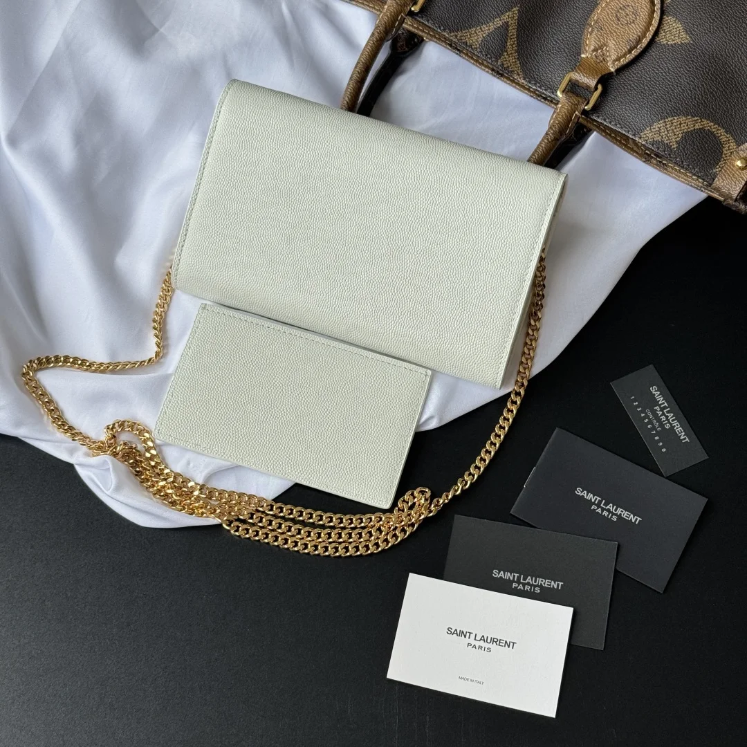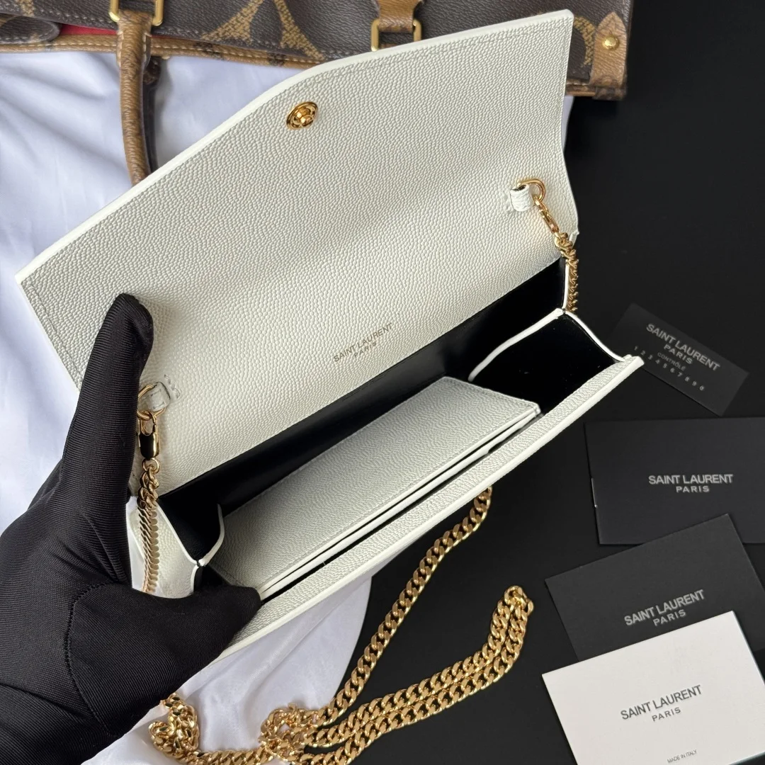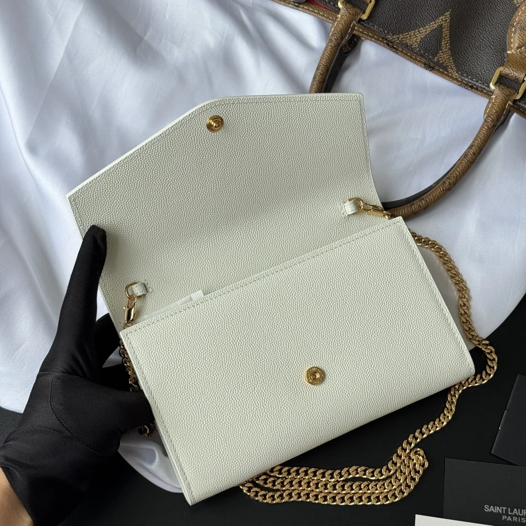 Uptown mini envelope bag in lychee grain leather features the most classic iconic metal logo, paired with a detachable chain shoulder strap, allowing it to be used as a clutch! This model also includes a small cardholder that can easily fit 4 to 5 cards! Made from imported Italian leather, the shoulder strap measures 48cm! Although compact, it can hold 3 Plus-sized phones, ensuring 100% practicality! Model: 607788 Size: 19x12x4cm Color as shown.