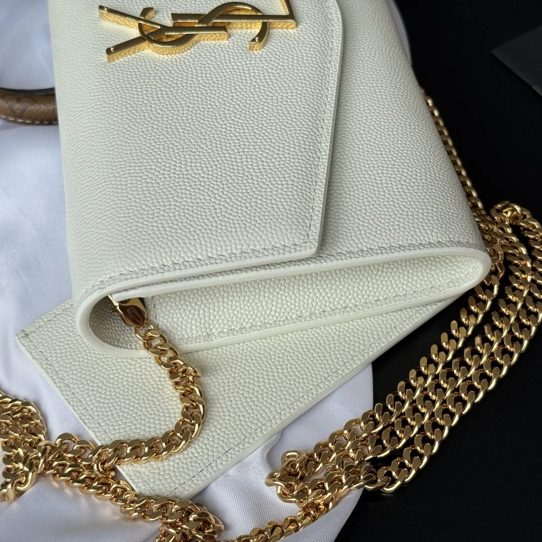 Uptown mini envelope bag in lychee grain leather features the most classic iconic metal logo, paired with a detachable chain shoulder strap, allowing it to be used as a clutch! Thi..
