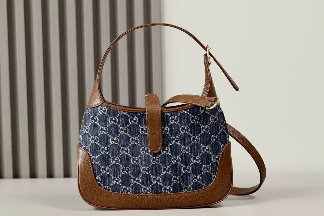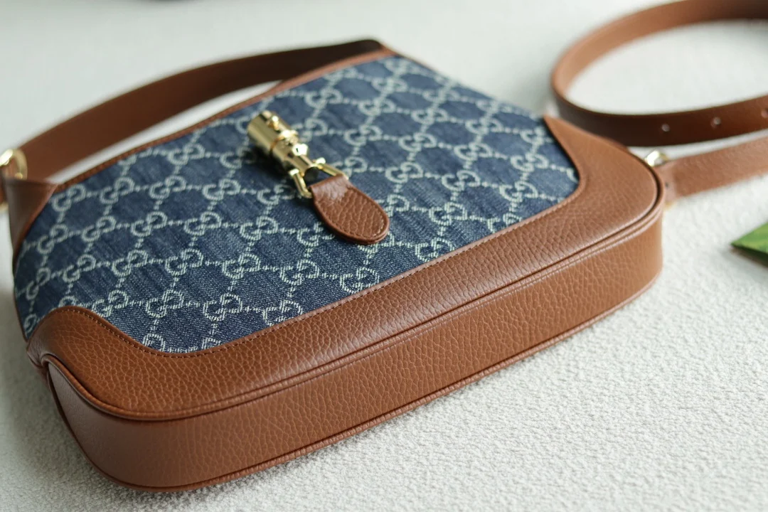 The classic 636706 Jackie 1961 series handbag, famously seen with Kennedy and thus known as The Jackie, is crafted from original leather with GG jacquard eco-washed denim. It features an additional detachable shoulder strap that can be secured to the bag with a buckle. Dimensions: 28 x 19 x 4.5cm.