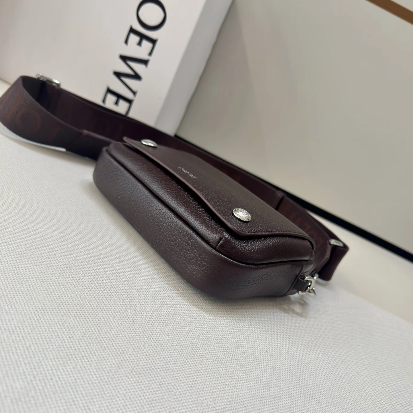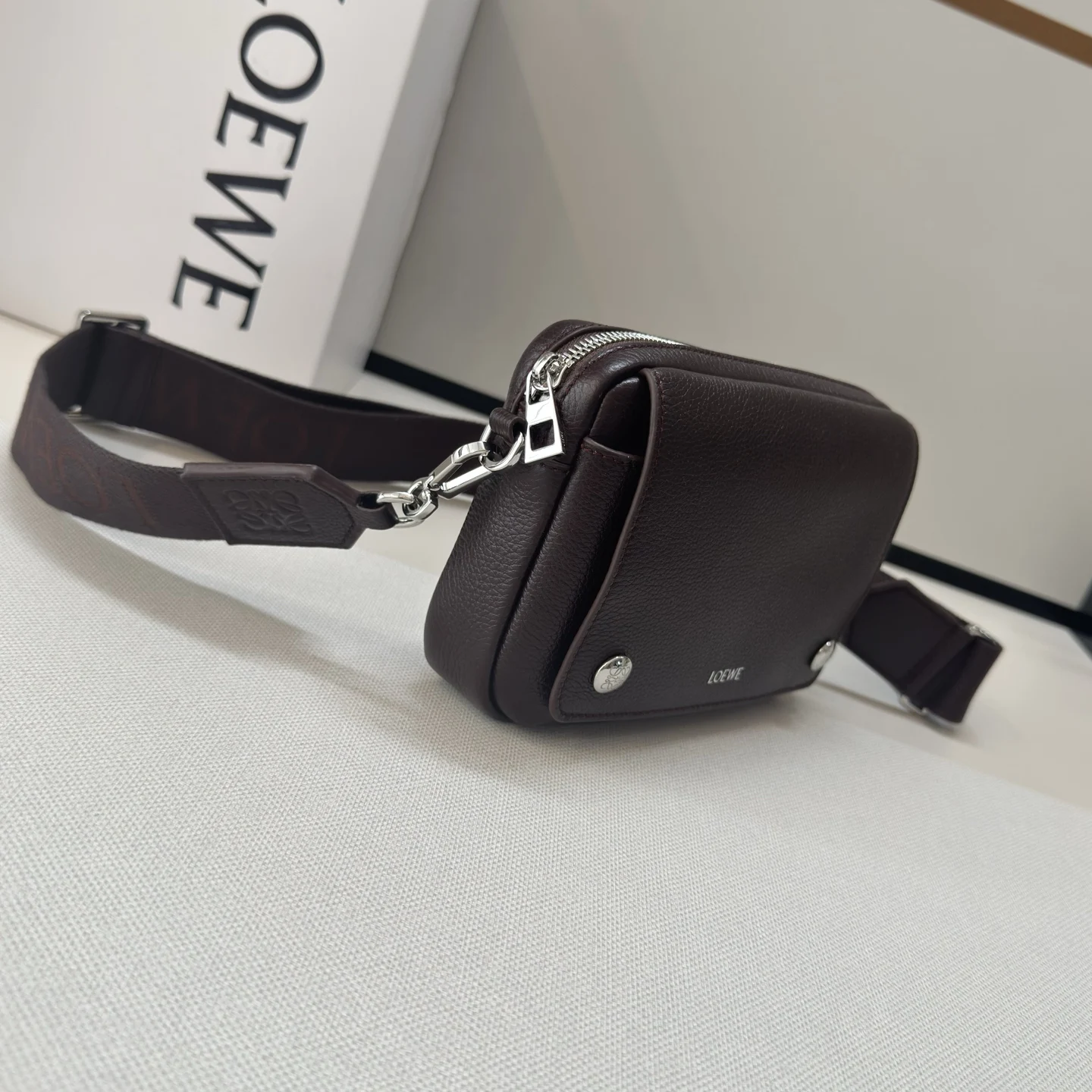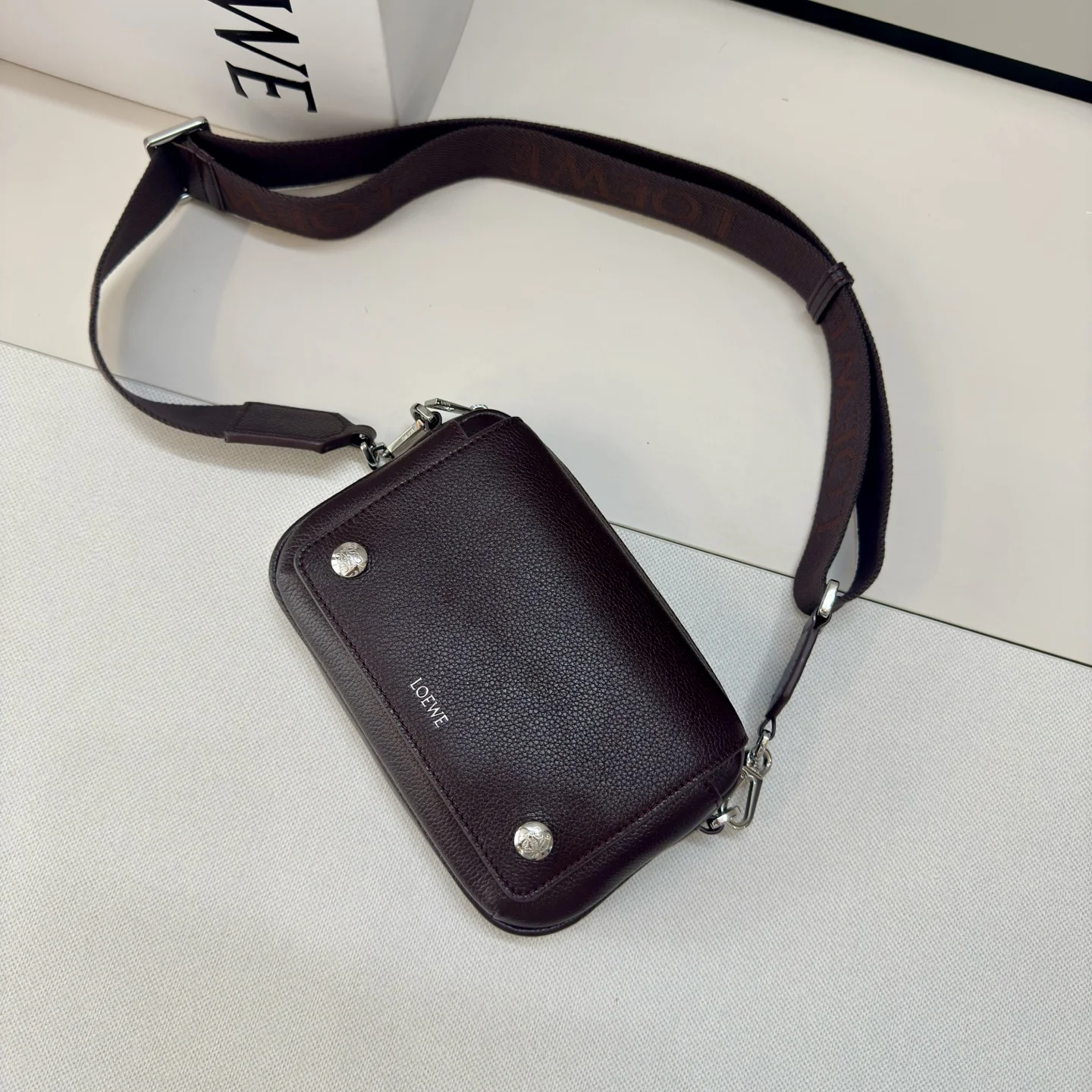 LOEWE new small Pebble messenger bag in soft-grained calfskin. A practical and compact design featuring a double signature Anagram Pebble. This version is crafted in soft-grained calfskin. Adjustable LOEWE webbing strap, zip closure, one magnetic closure front pocket, one internal slip pocket, suede lining, LOEWE embossed in silver, Anagram Pebble. Size: 20*6*12.5 Model: 652514