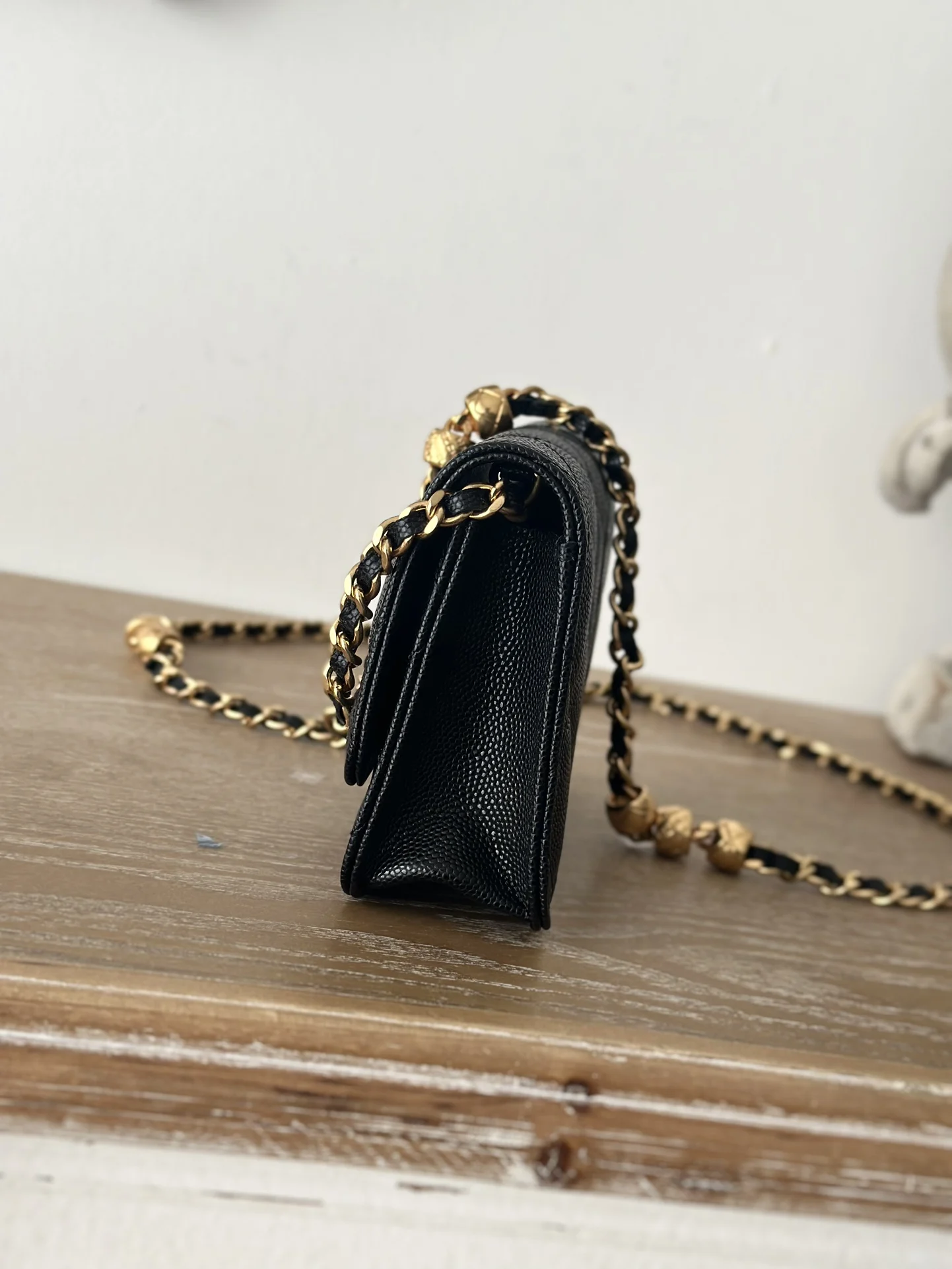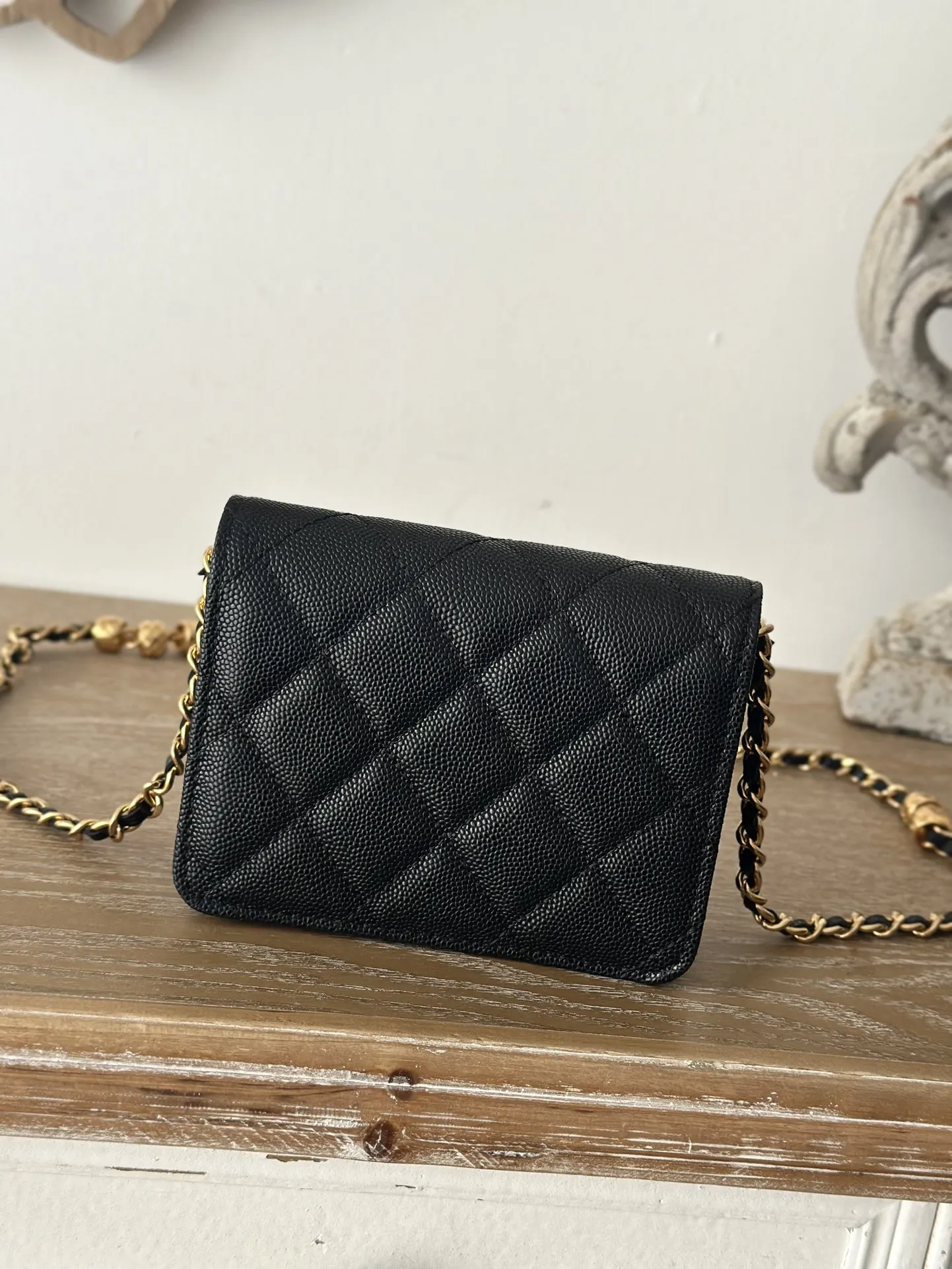 New Chane 25c Chain Pearl Flap Coin Purse. The new 25c early spring collection enhances any outfit with both quality and style. It s very stylish! The whole bag has a cool and sweet vibe. Its shoulder strap features Chanel s unique logo, which is super cool. Made of grained calfskin, it is wear-resistant, durable, and practical. Can be worn crossbody or over the shoulder. It cannot fit a phone, but has multiple internal compartments for small items. Dimensions: 12 x 9 x 2.5cm. Code: 66007. Black.