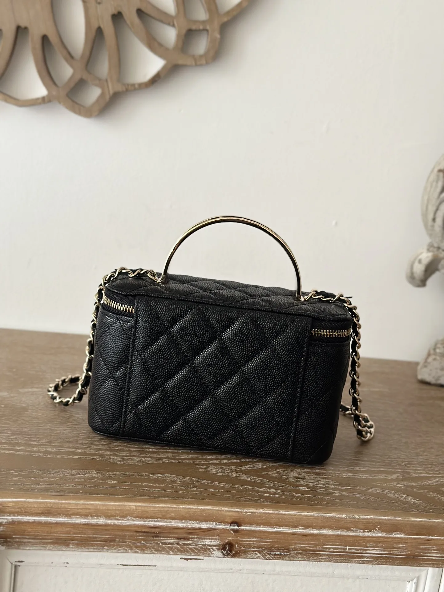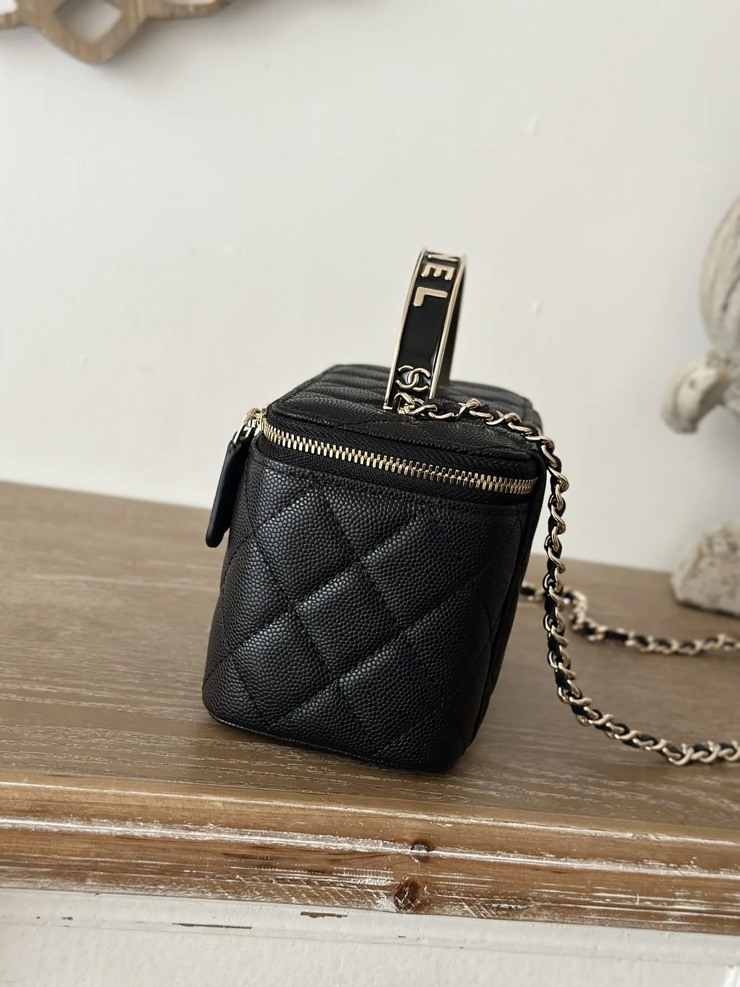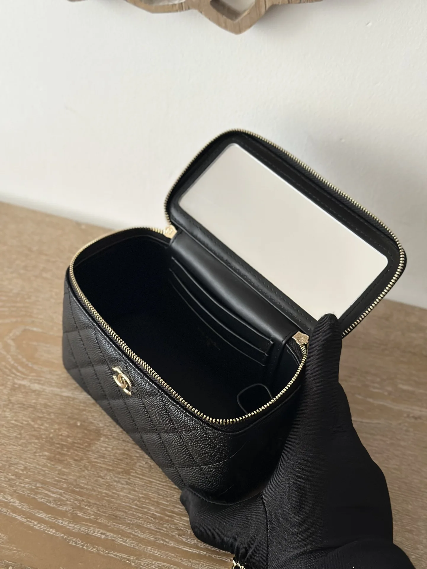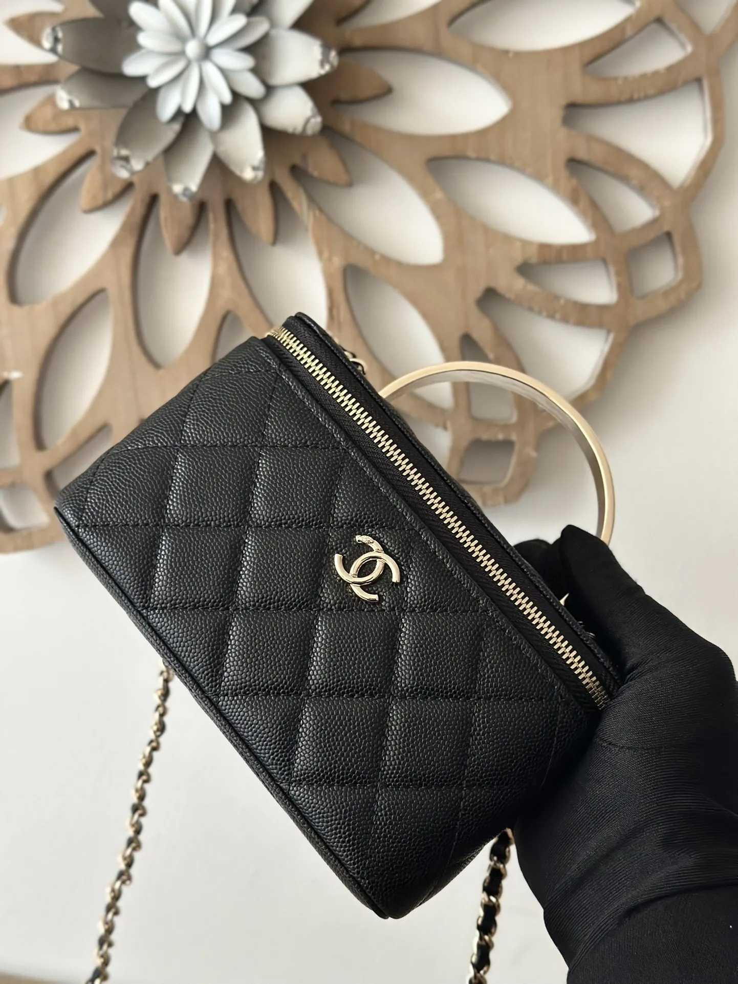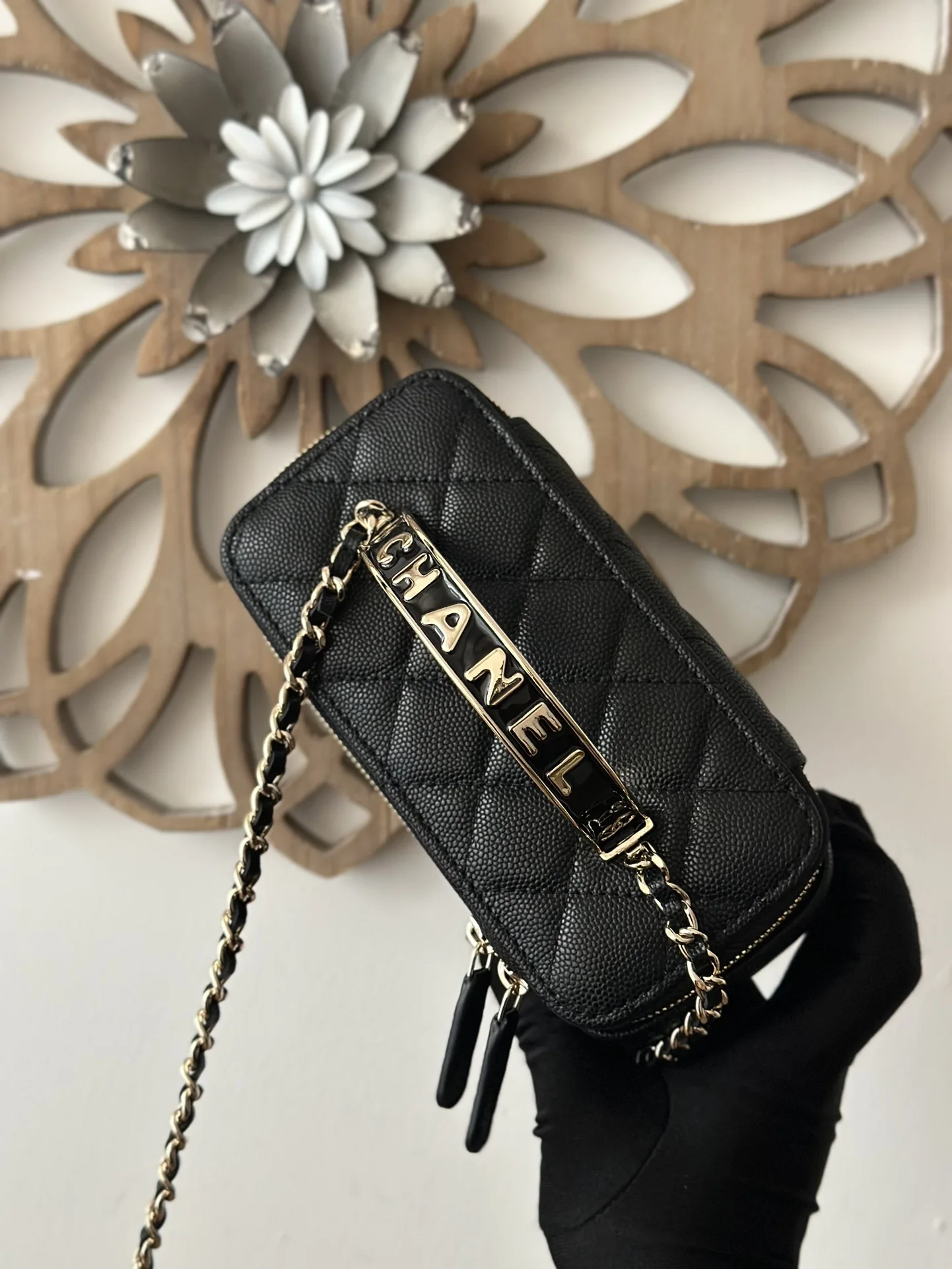 Chanel New Enamel Buckle Large Chain Cosmetic Bag with Mirror. This new box bag features a metal enamel buckle handle! I was completely obsessed when I saw the actual product It has a completely different temperament, a surprise and an amazing feeling! It can be used as a shoulder bag, crossbody bag, or handbag! It can hold small items such as lipstick , powder compact, keys, etc. The main point is that a large mobile phone can also fit inside. Size: 9.5 17 8cm, Code: 66009 Black