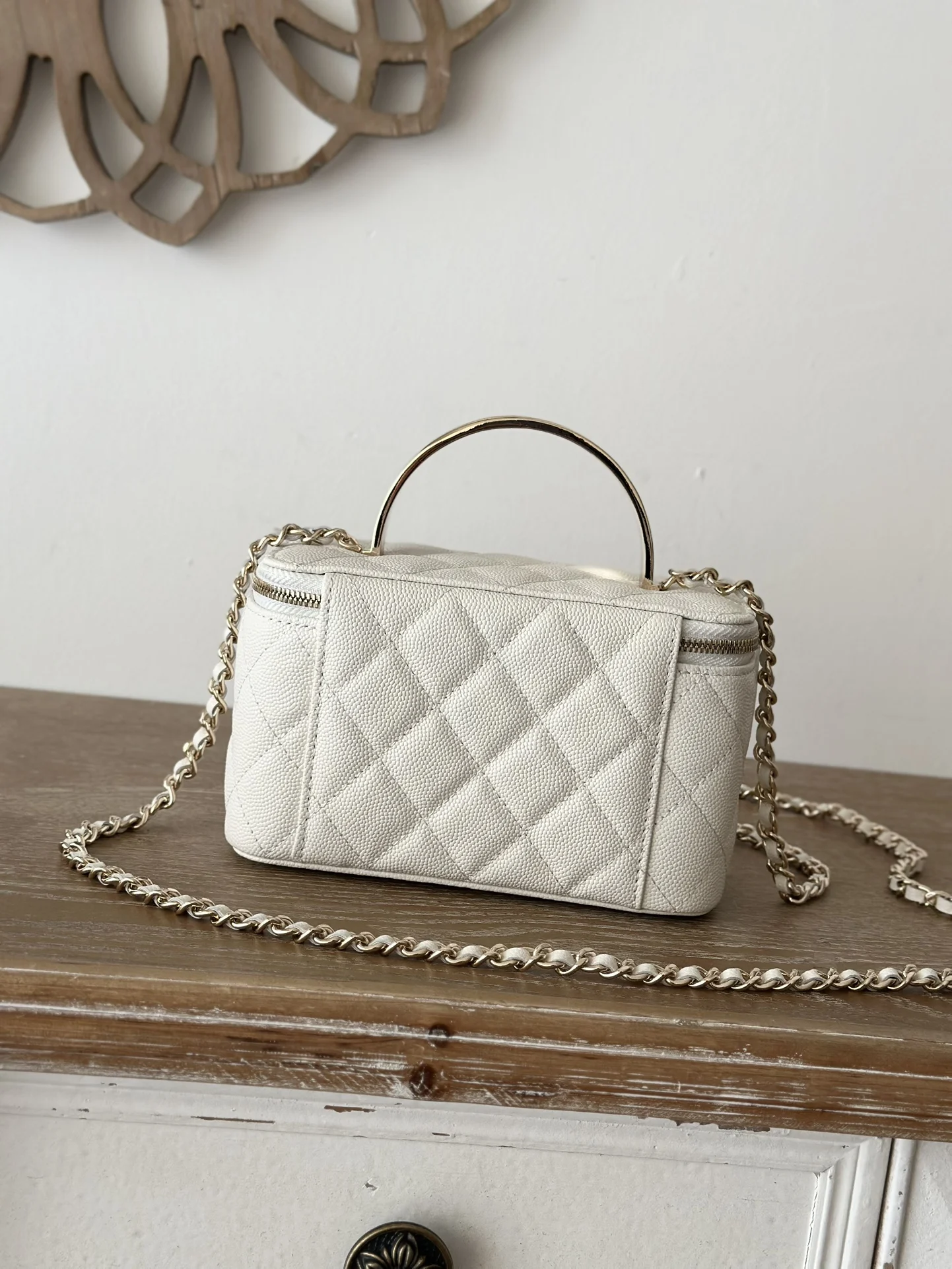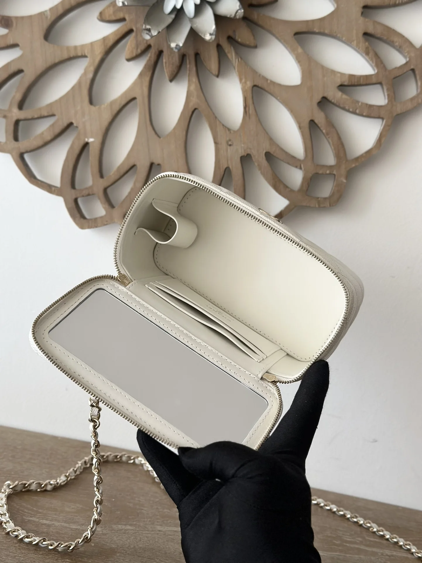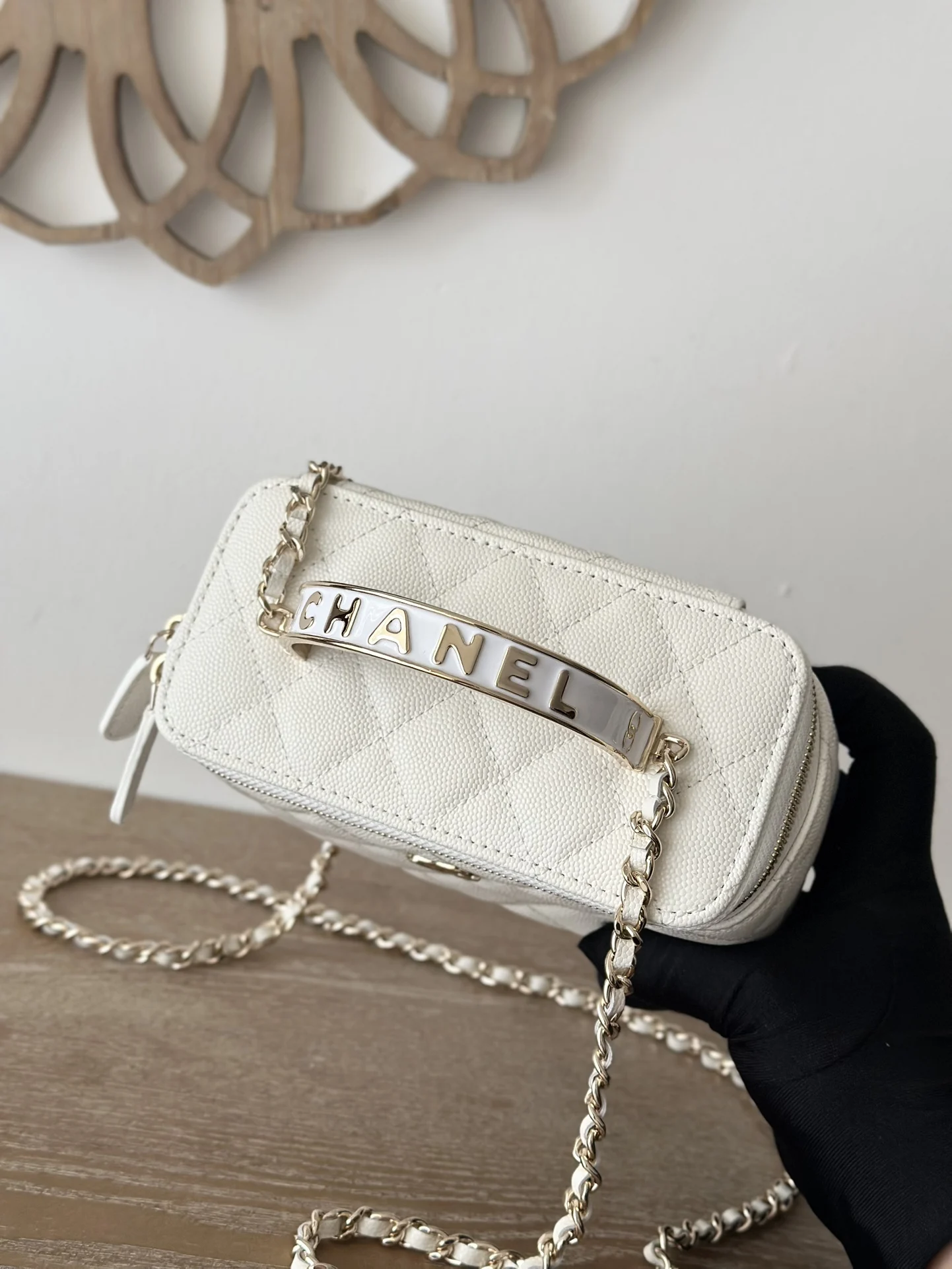 Chanel New Enamel Clasp Large Chain Vanity Case with Mirror. This new box bag features a metal enamel clasp handle! I was completely obsessed when I saw the actual product It has a completely different temperament, a surprise and an amazing look! It can be worn on the shoulder, crossbody, or carried by hand! It can hold small items such as lipstick , powder compact, keys, etc. The main point is that a large mobile phone can also fit inside. Size: 9.5 17 8cm, Code: 66009 White