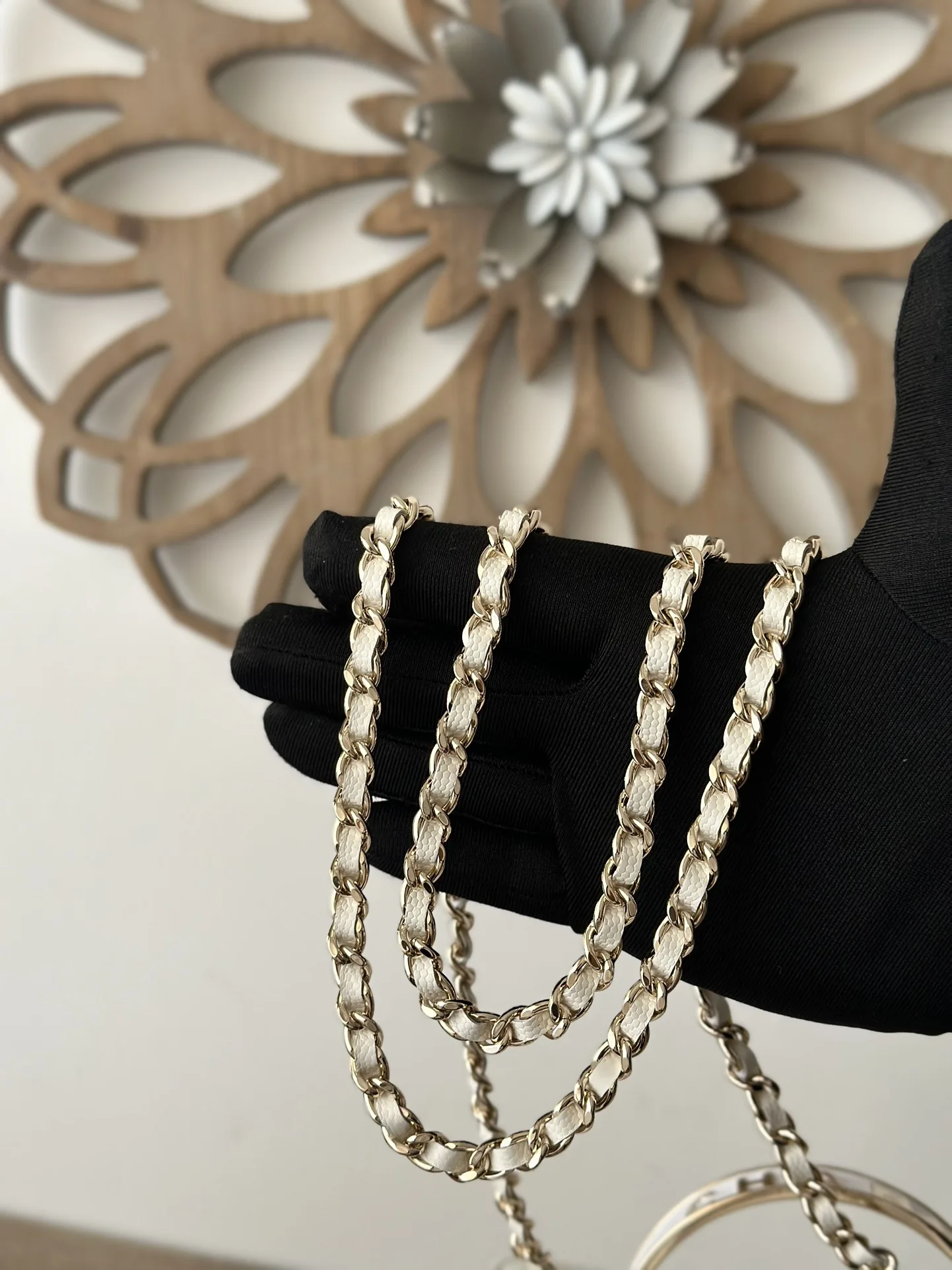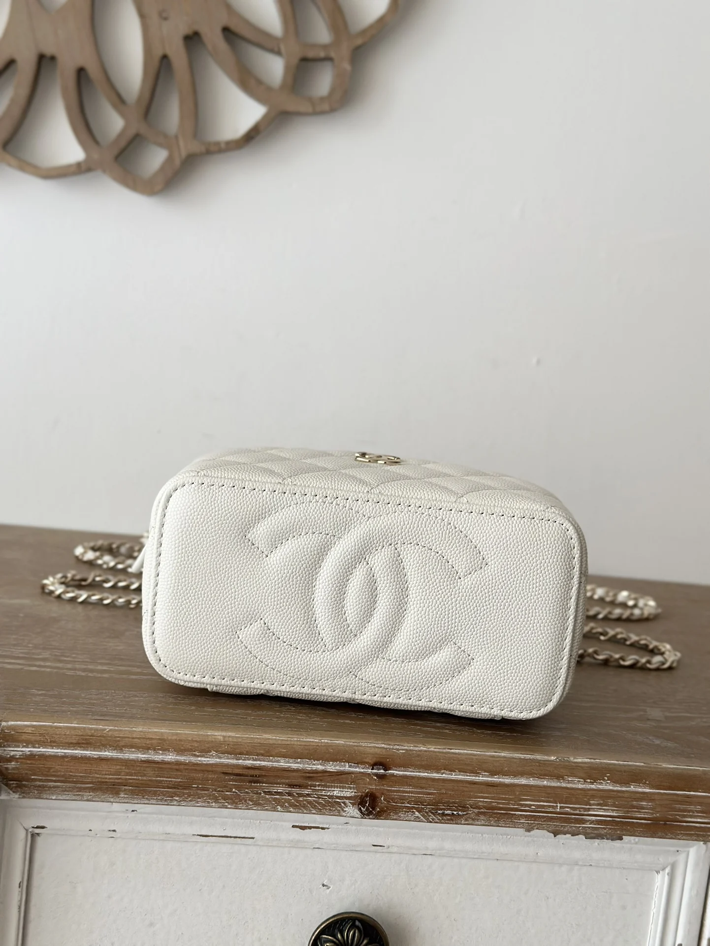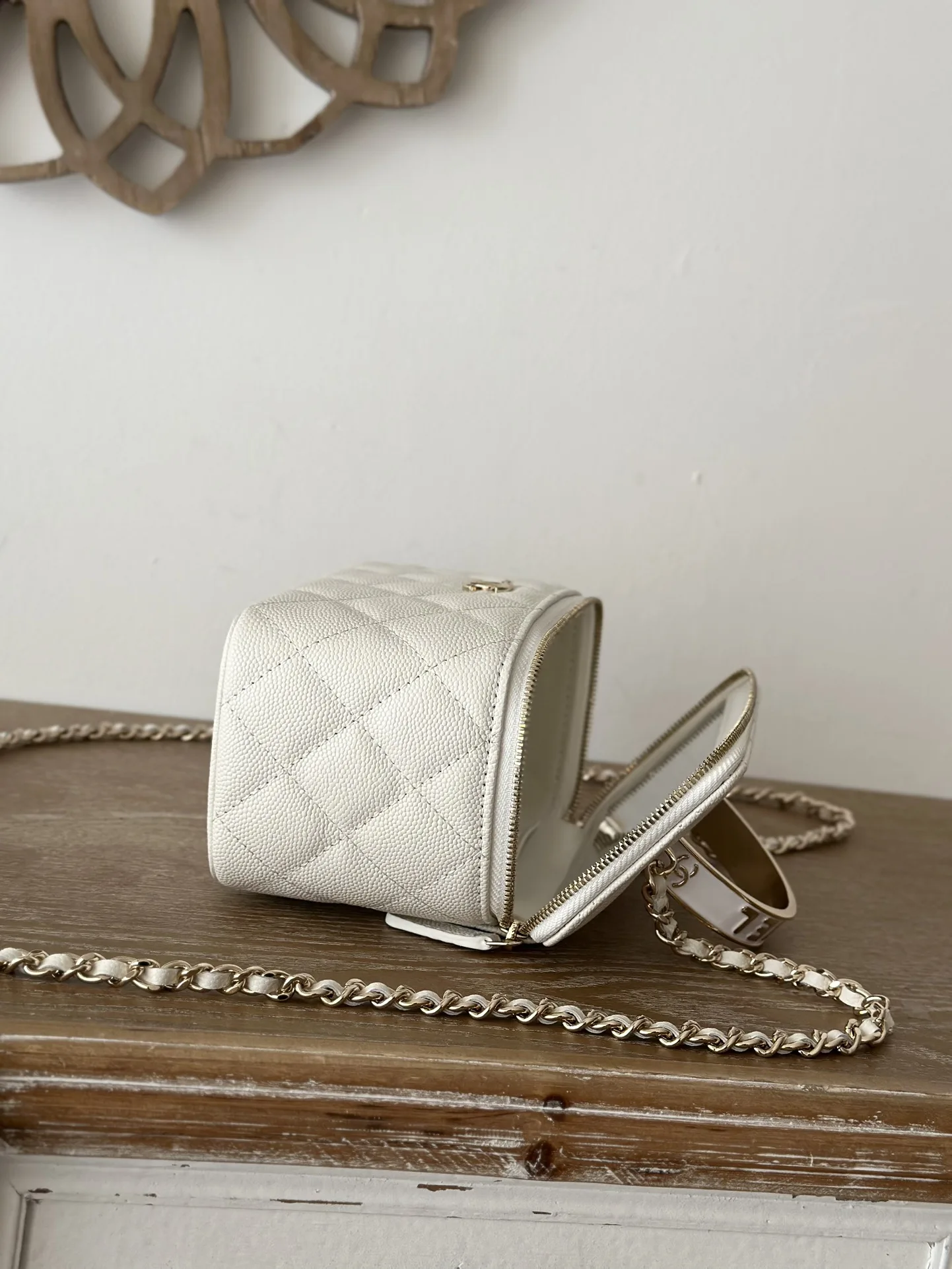 Chanel New Enamel Clasp Large Chain Vanity Case with Mirror. This new box bag features a metal enamel clasp handle! I was completely obsessed when I saw the actual product It has a completely different temperament, a surprise and an amazing look! It can be worn on the shoulder, crossbody, or carried by hand! It can hold small items such as lipstick , powder compact, keys, etc. The main point is that a large mobile phone can also fit inside. Size: 9.5 17 8cm, Code: 66009 White